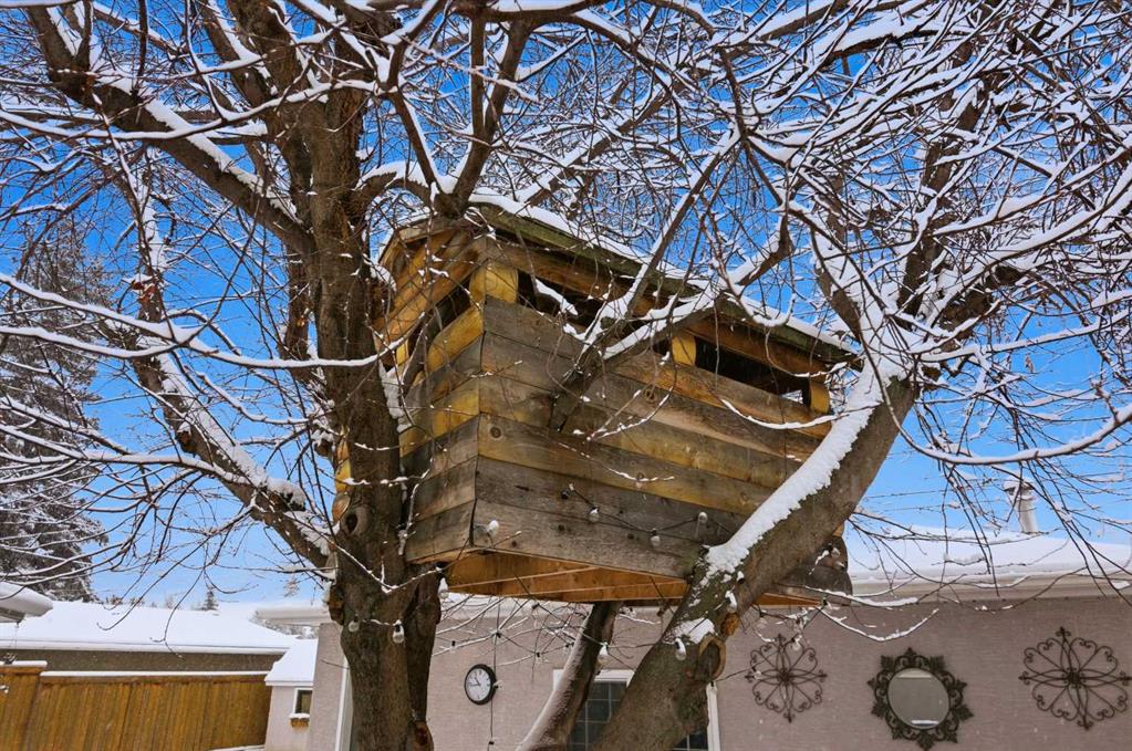Outside is where things get really fun — there’s a super cool treehouse for the kids and plenty of space to entertain. The oversized garage has a 8′ door and 9′ ceilings, and it’s drywalled and insulated. There’s even a pull-down staircase for extra rafter storage.