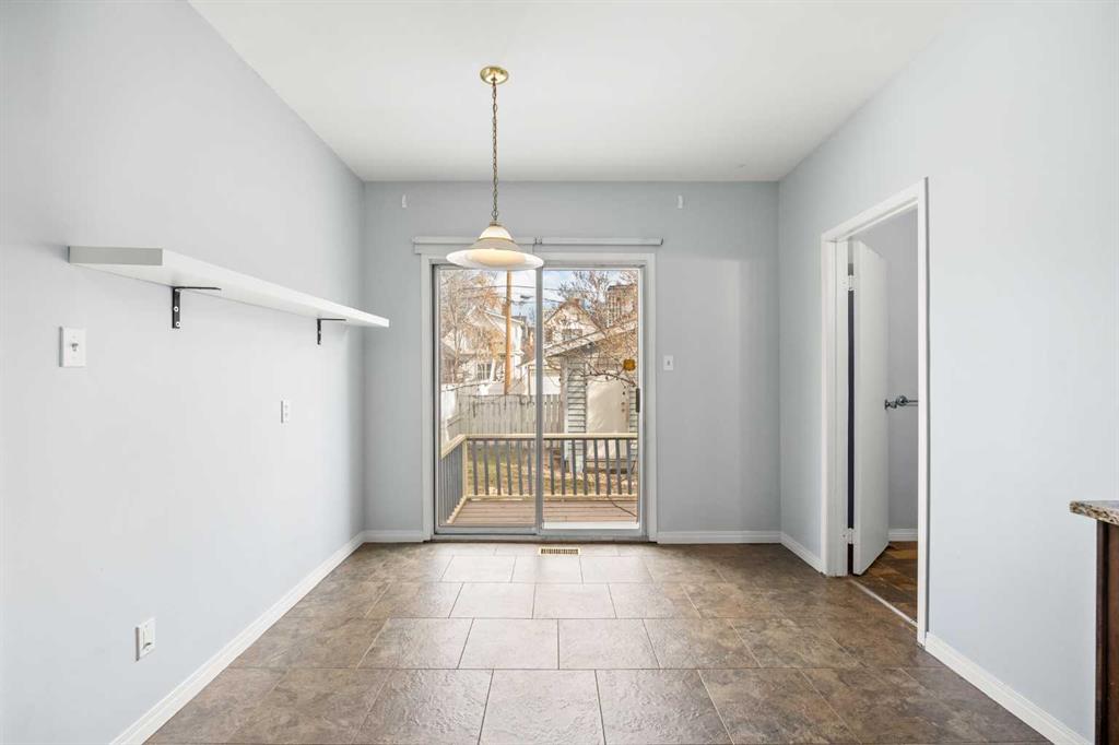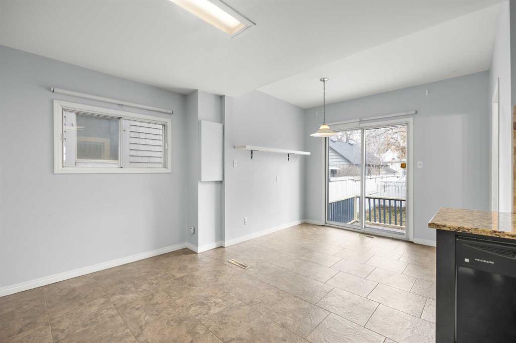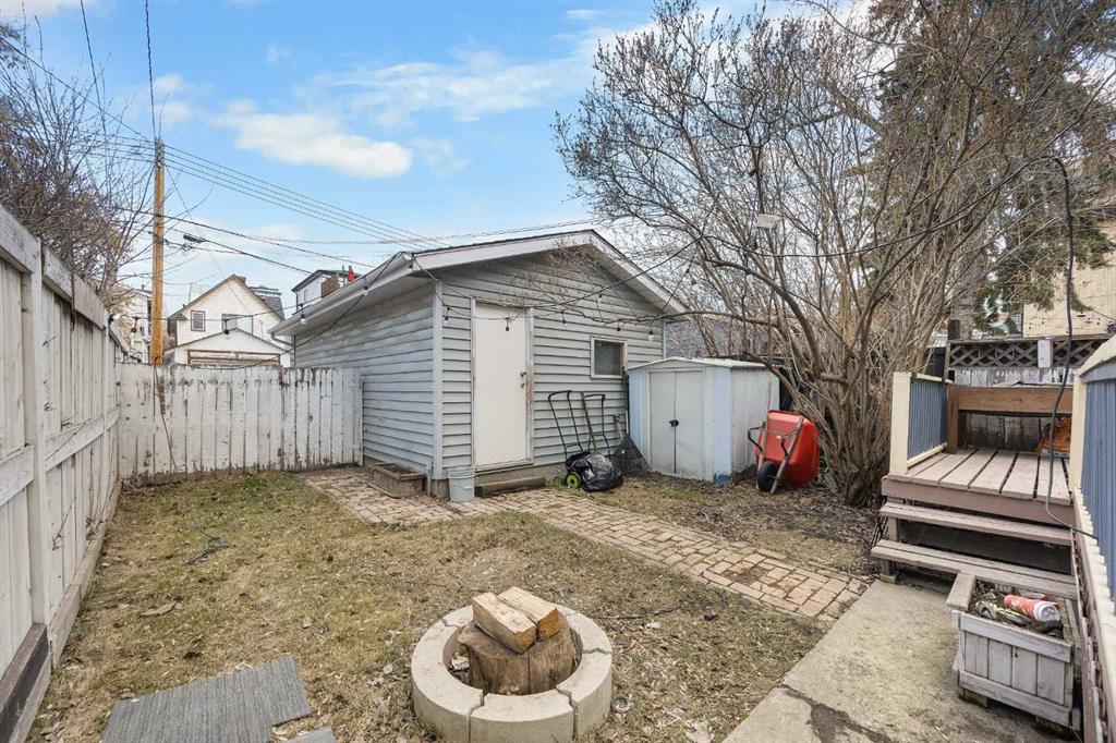 The Main Level offers impressive 9 ft ceilings, a bright South-facing Bedroom with bay window and ceiling fan, and a warm Living Room with fireplace. The Kitchen features granite countertops, mosaic tile backsplash, and ceiling-height cabinetry, while the spacious Dining Room provides the comfort for your daily dining needs. A versatile Nook at the rear includes sliding patio door access to the Deck and backyard. The 4pc Bath is tastefully finished with tile surround and added storage. Step outside to enjoy the private yard with firepit and gate access to the back lane.