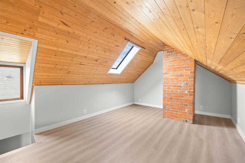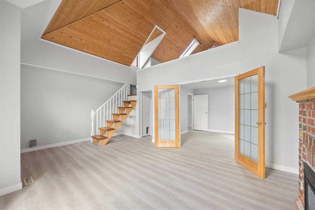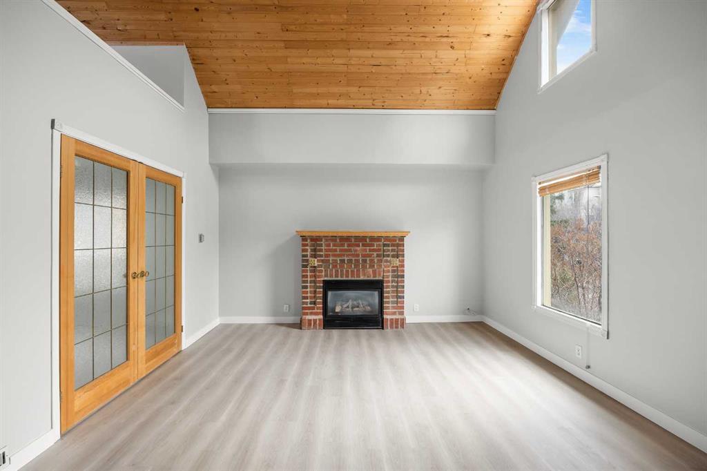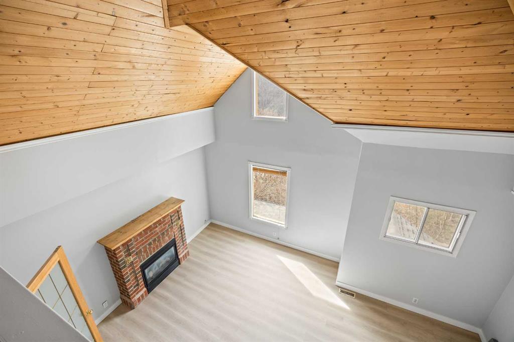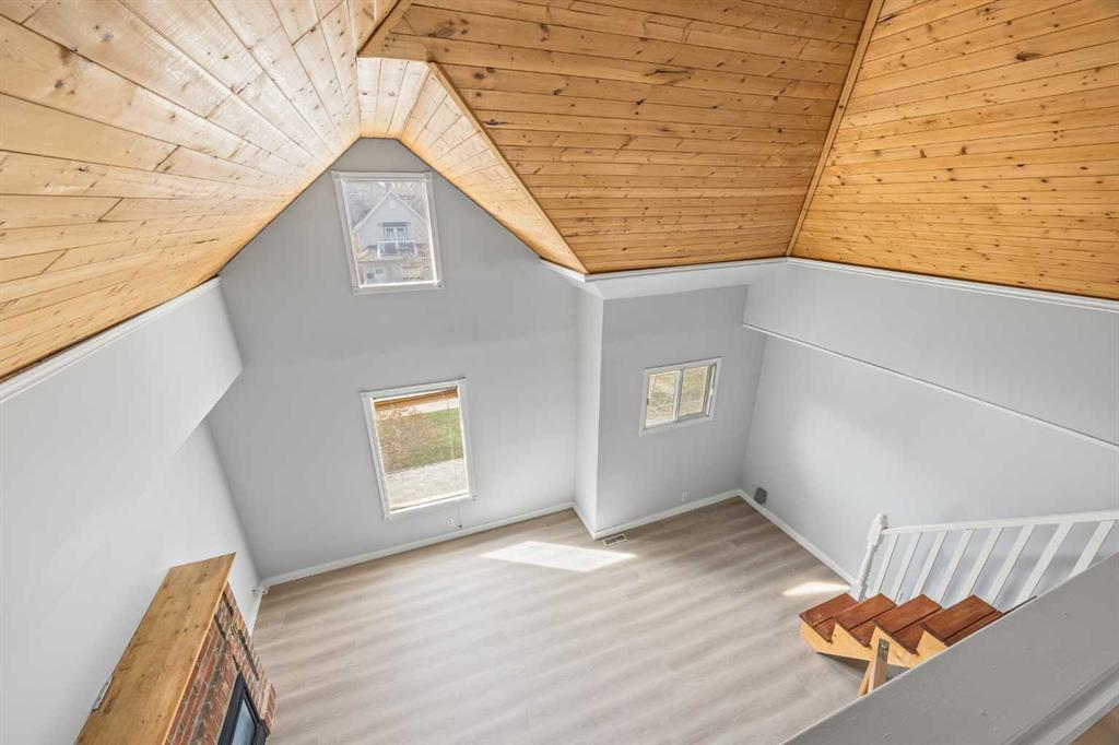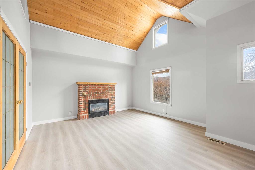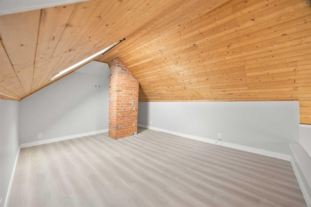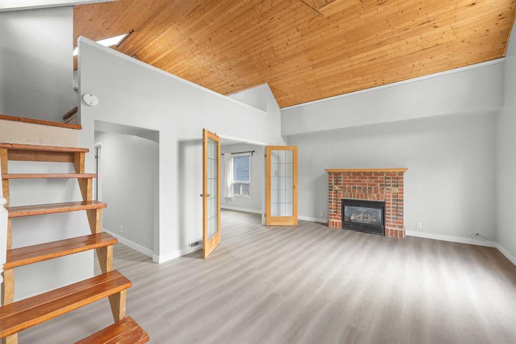 The Upper Level unit with Loft is full of charm and character, featuring a well-sized Bedroom with French door access to the Living room, a functional Kitchen with access to the private Balcony, and a 4pc Bath with tile finishes. The Living Room impresses with soaring 13’9″ / 9’8″ vaulted ceilings, a gas fireplace, and stair access to the Loft above—ideal for lounging, a home office, or flexible living space.