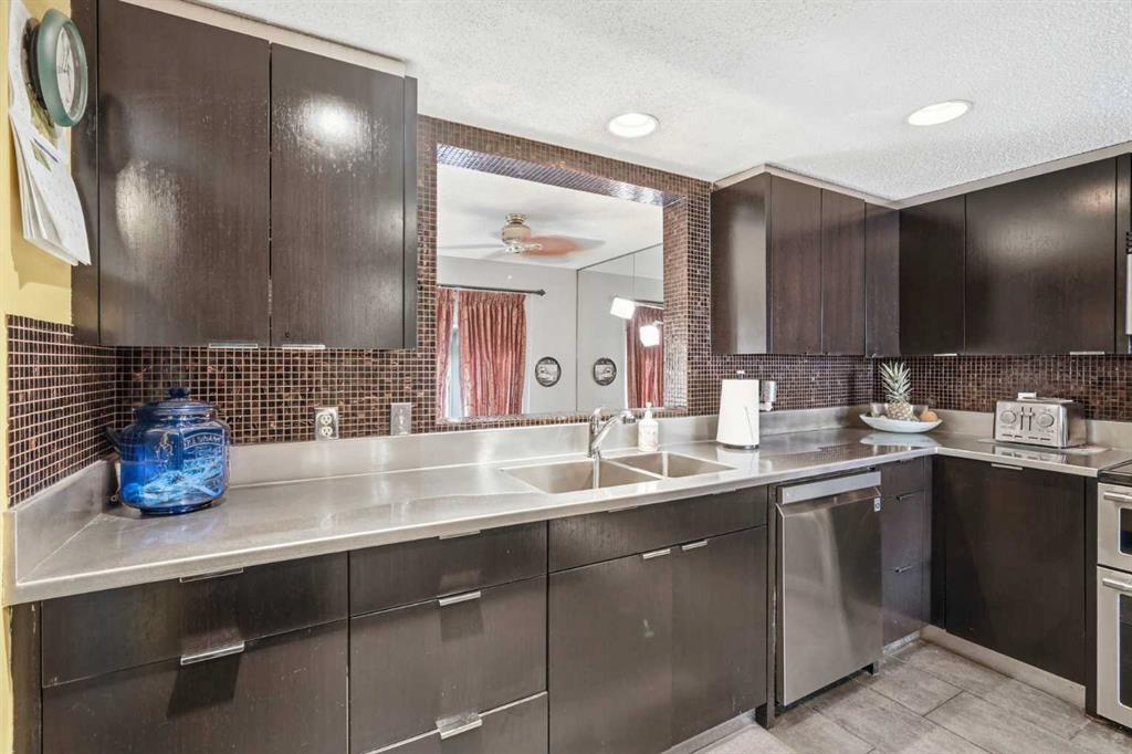 The main level showcases vaulted ceilings, bamboo flooring, and a bright, open-concept living space centered around a cozy gas fireplace. The kitchen is both functional and stylish, featuring sleek black cabinetry, a unique stainless steel countertop, ample storage, and a newer dishwasher (2024)—a modern, design-forward space that stands out from the ordinary.