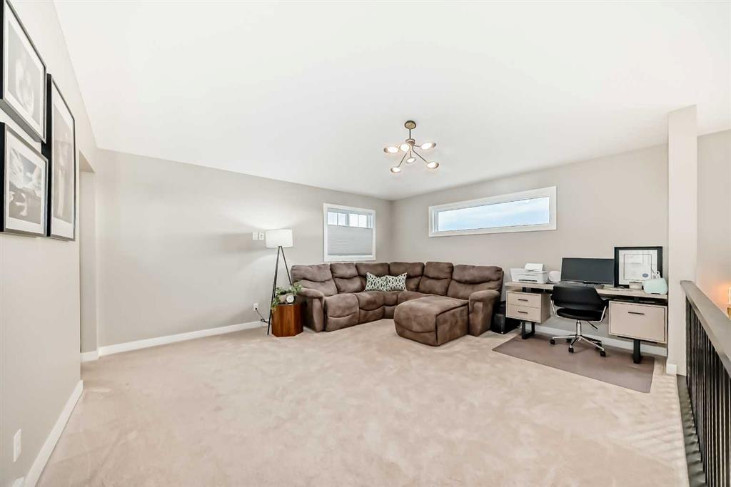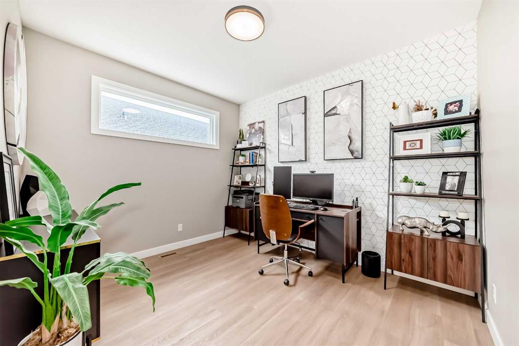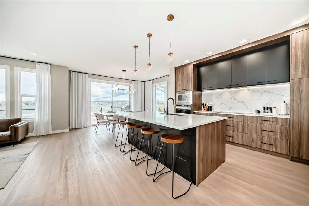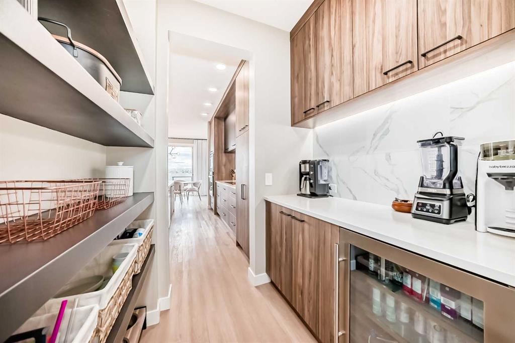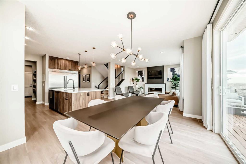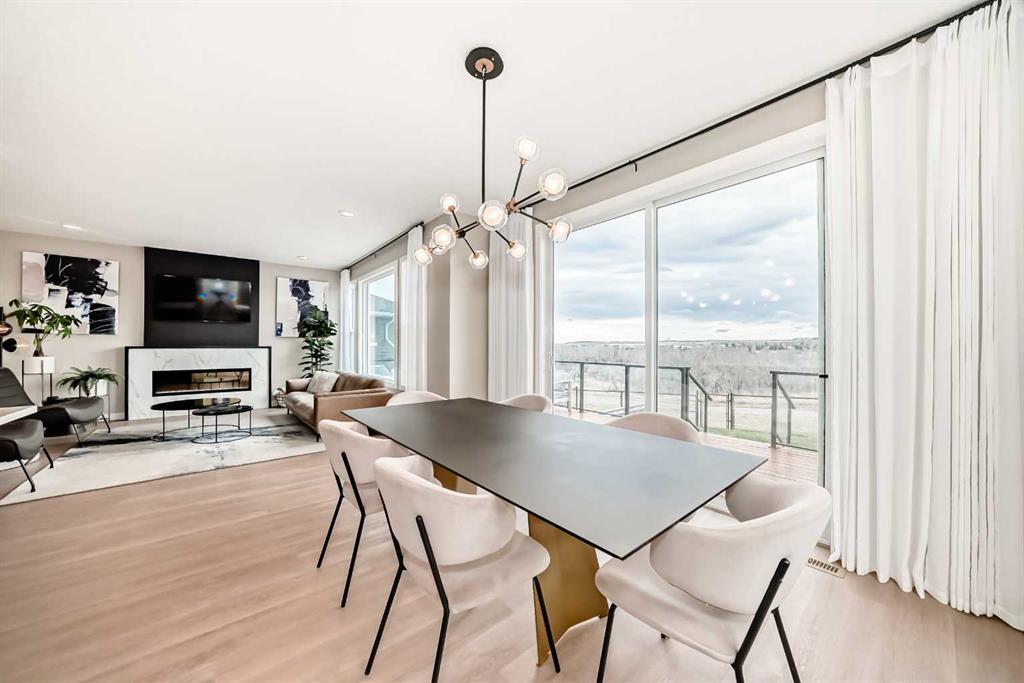 The main floor is open, refined, and designed for modern living. A dedicated front office provides a polished work-from-home space, while the mudroom off the garage keeps everyday life organized and efficient. The main living area is bright and expansive, anchored by southwest-facing windows that capture mountain views and flood the home with natural light. The kitchen is a true centrepiece, showcasing a massive quartz island, two-tone cabinetry, premium stainless-steel appliances, and a fully equipped butler’s pantry with bar fridge, additional storage, and prep space. The dining and living areas flow seamlessly together, highlighted by a sleek feature fireplace and extending out to a cedar deck with glass railings—perfect for effortless indoor-outdoor entertaining.