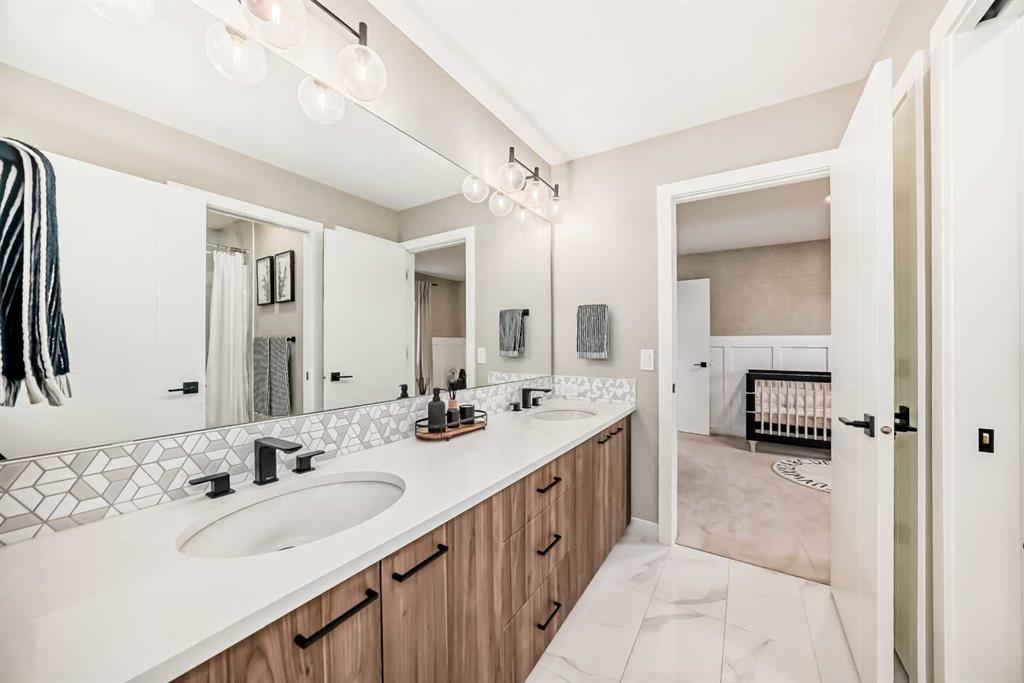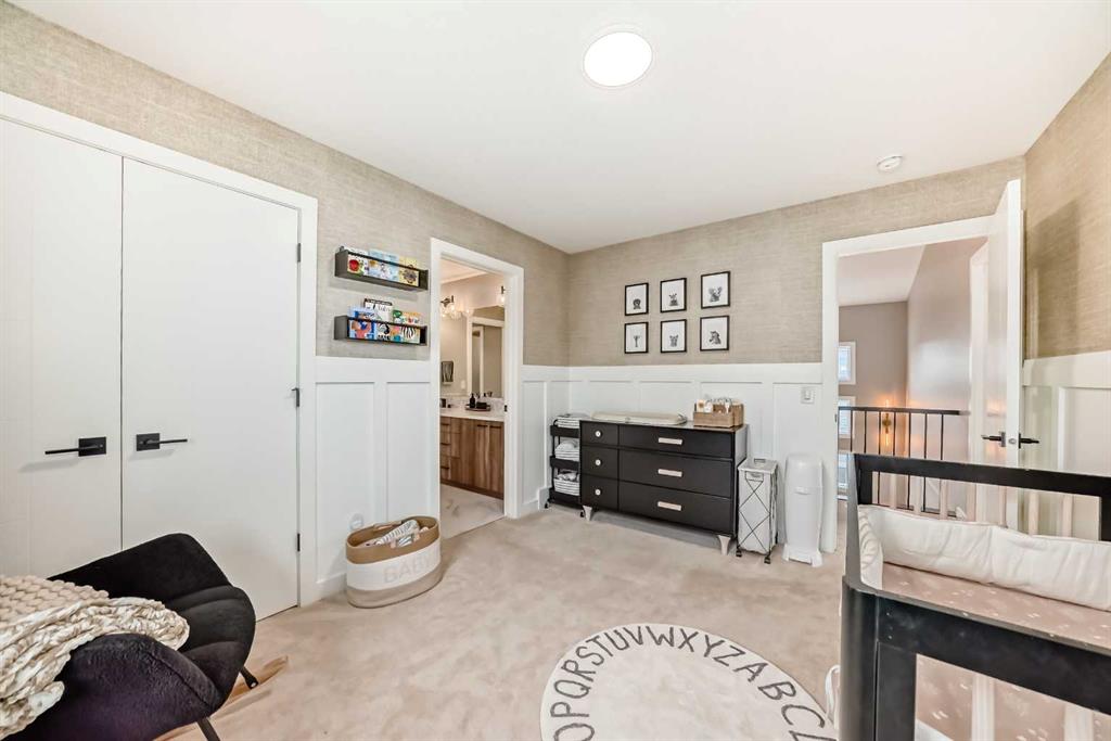 Upstairs, vaulted ceilings elevate both the central bonus room and primary suite, creating volume and an enhanced sense of space. The primary retreat is a private sanctuary with Scandinavian-inspired design and unobstructed views of greenspace and mountains. The spa-calibre ensuite features heated tile floors, steam shower with bench and niche, freestanding soaker tub, and a large walk-in closet with custom California Closets built-ins and integrated lighting. Three additional bedrooms are generously sized, finished with custom wainscoting and designer details, and share a well-appointed Jack & Jill bathroom with dual vanities. A dedicated upper laundry room with built-in shelving and folding counter adds everyday convenience.