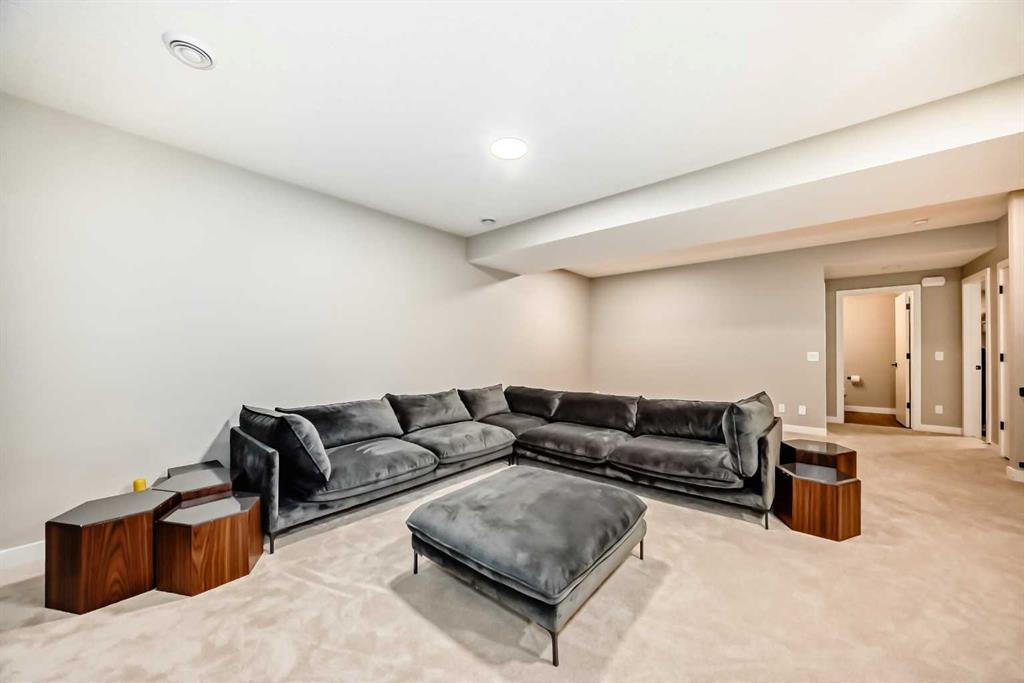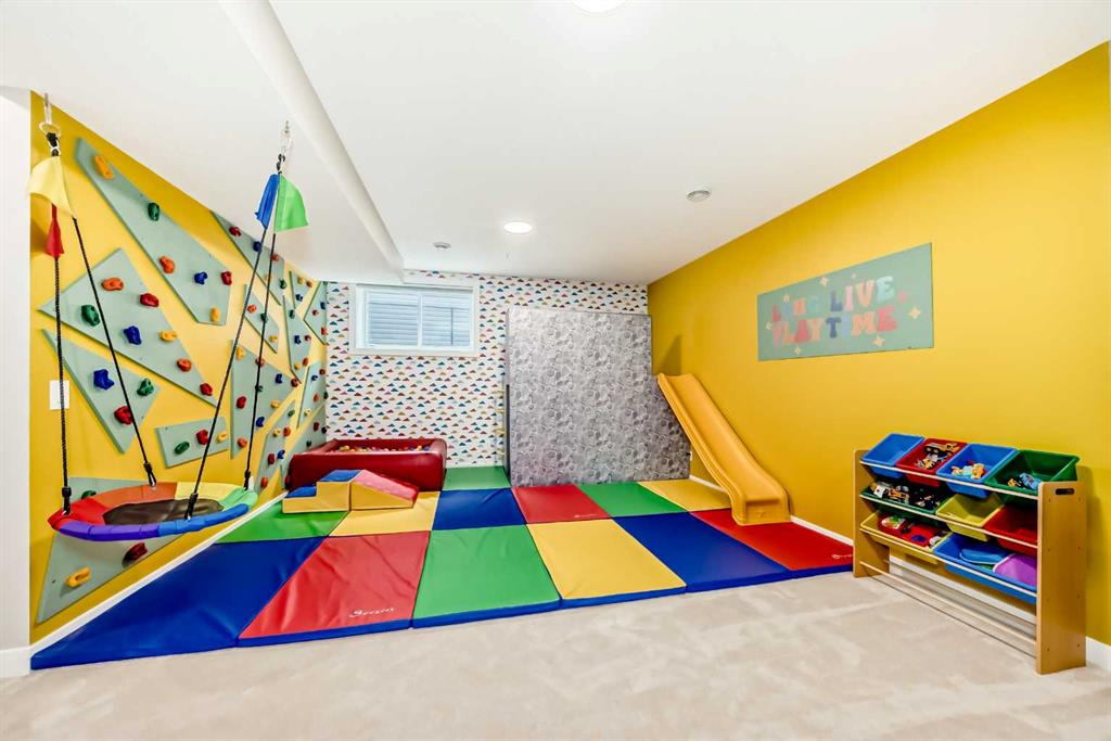 The fully finished basement is designed for both lifestyle and flexibility, offering 9’ ceilings, a spacious rec area, and a custom-built kids’ zone complete with climbing wall, castle fort, slide, ball pit, and swing—an exceptional indoor play experience. A fifth bedroom—currently used as a home gym — adds versatility, along with a 2-piece bathroom and rough-in for a future wet bar.