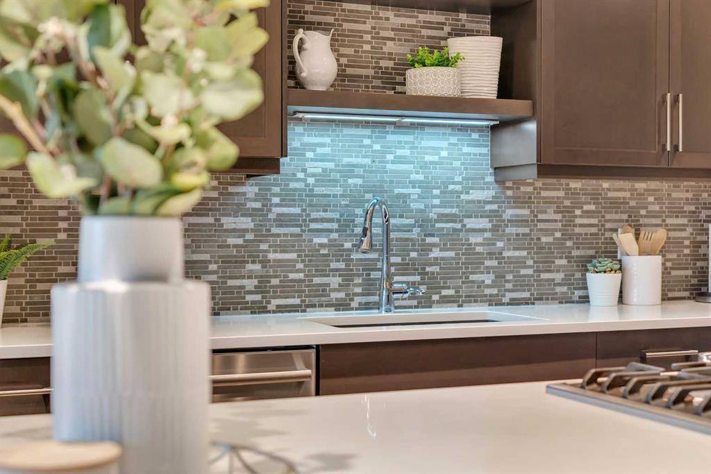 As you enter, you’re greeted by a spacious foyer with room for a bench, setting up the tone for the elegant design throughout. The bright & sunny living room features rich hardwood flooring and a cozy gas fireplace, perfect for those chilly winter nights. A statement chef’s kitchen crafted for both everyday living and elevated entertaining featuring above the island gas cook top with a custom hood fan, all built in appliances with a newer Bosch dishwasher, pot lights, tons of drawers and cabinet space, floating shelfs adding to the stylish look, a classy and elegant backsplash, and a corner pantry with a glass door. Adjacent to the kitchen is the dining area. All the windows on the main level features towards the rear of the home capturing the stunning pond and mountain views all day long. The rear wide deck is a great spot for your morning coffee while you sit back and enjoy the serene views.