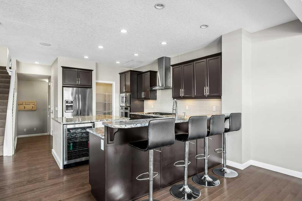 The chef’s kitchen is beautifully appointed with extended dark cabinetry, granite countertops, a large center island, tiled backsplash, beverage fridge, gas stove, built-in oven and microwave, and a chimney-style hood fan. A walk-in pantry and convenient linen storage add functionality, while built-in speakers throughout the main floor enhance the entertainment experience. A stylish 2-piece bath with granite vanity completes the level. The double attached garage is heated and features tall ceilings, custom shelving and workbench.