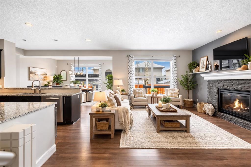 The main floor welcomes you with a tiled entry and rich hardwood flooring flowing through the living room, dining area, and kitchen. The open concept design features 9’ knockdown ceilings and a striking brick gas fireplace creating a warm and inviting space.