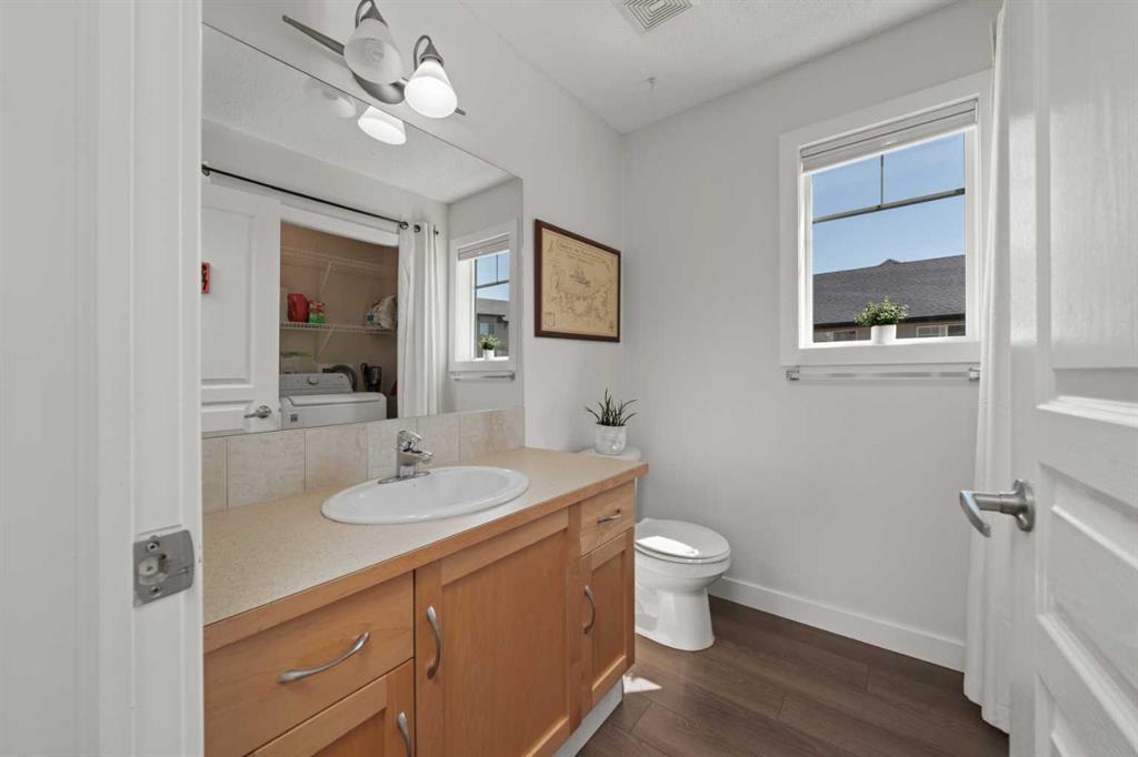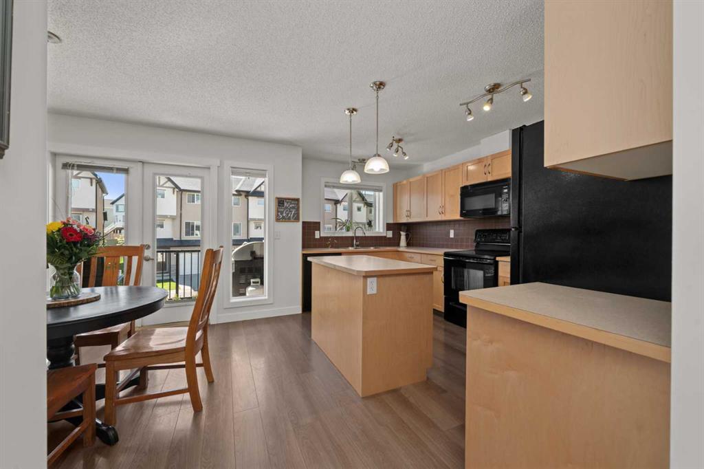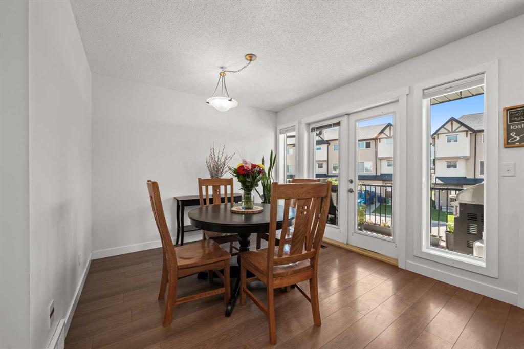 Welcome to this fabulous end-unit townhome offering 3 bedrooms, 2.5 bathrooms, and an attached double garage in the popular community of Cimarron. Beautifully maintained and truly move-in ready, this home features vinyl plank flooring throughout and an ideal layout for everyday living. The main level welcomes you with soaring ceilings, stylish flooring, and a bright, inviting living room—perfect for relaxing at the end of the day. Upstairs, you’ll find a well-designed kitchen with a central island and ample counter space, a spacious dining area, and access to a south-facing balcony—ideal for BBQs and enjoying the sunshine. This level is completed by a convenient 2-piece powder room and laundry with washer and dryer.