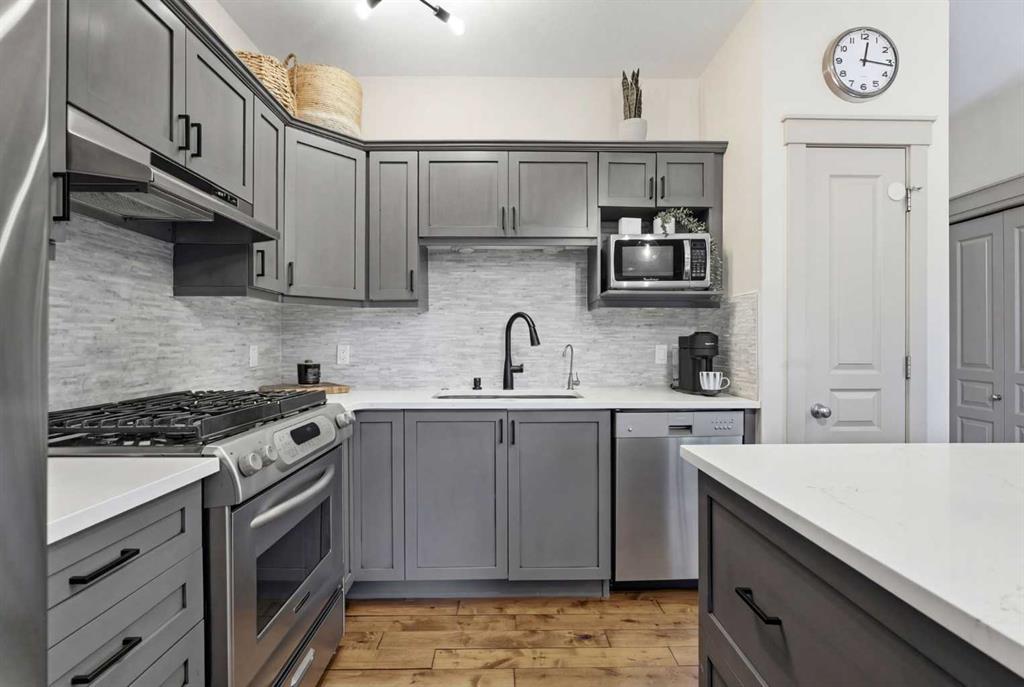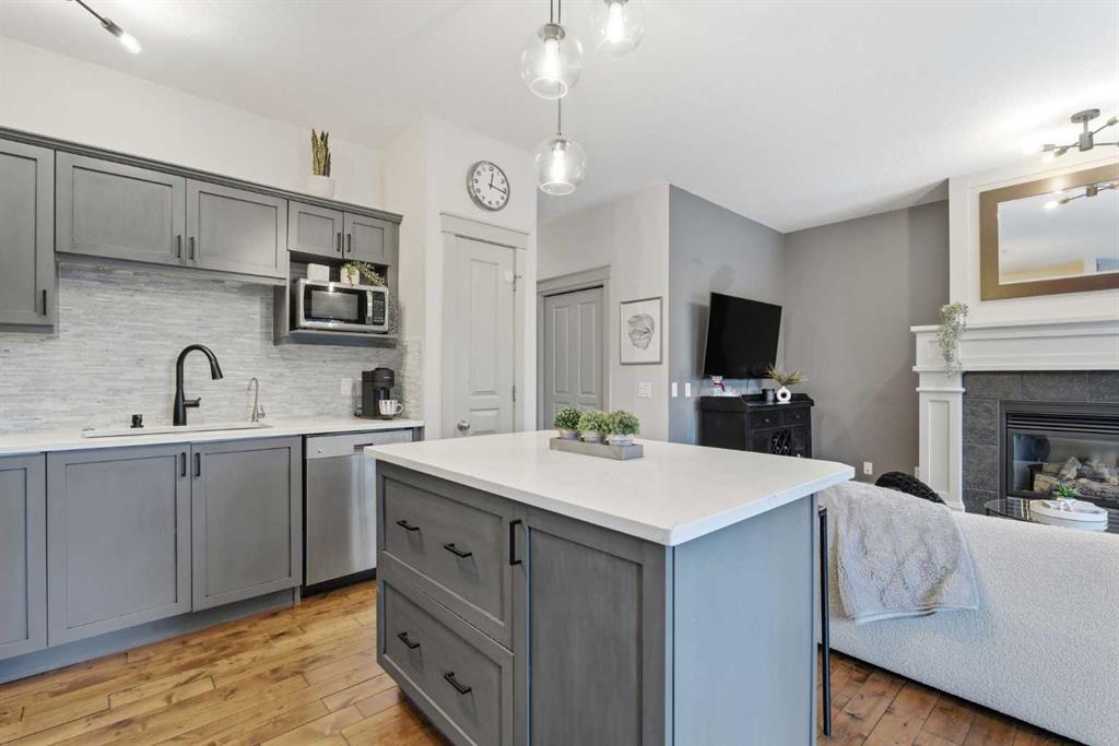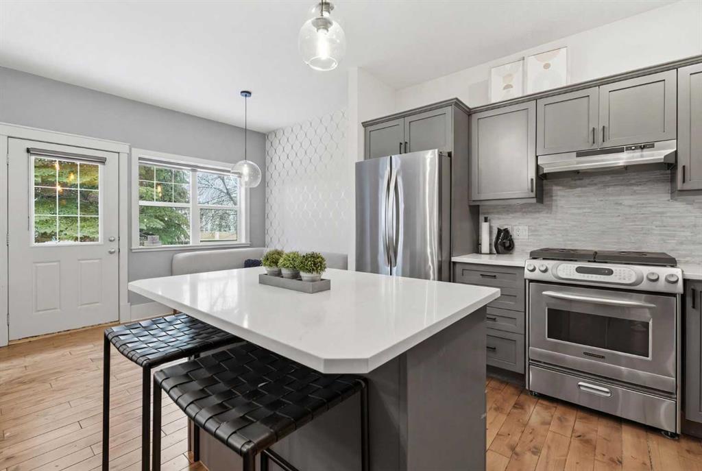 The kitchen is a so functional, sleek quartz surfaces, striking marble backsplash, stainless steel appliances, and a gas range come together around the island that invites gathering and conversation. The main floor is bathed in natural light, with 9’ ceilings, rich hardwood flooring, and expansive windows creating an airy, elevated living experience. The dining and living areas flow effortlessly, anchored by a cozy gas fireplace and accented with upscale finishing and lighting throughout.