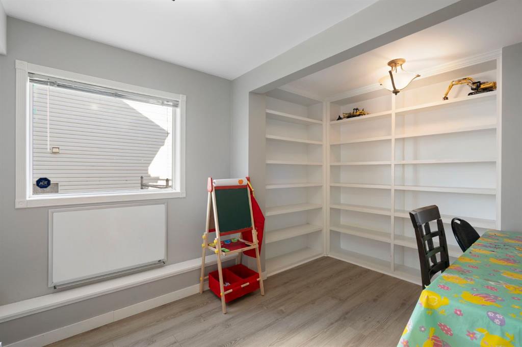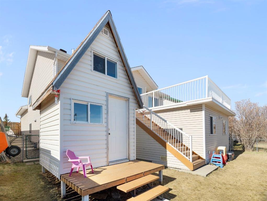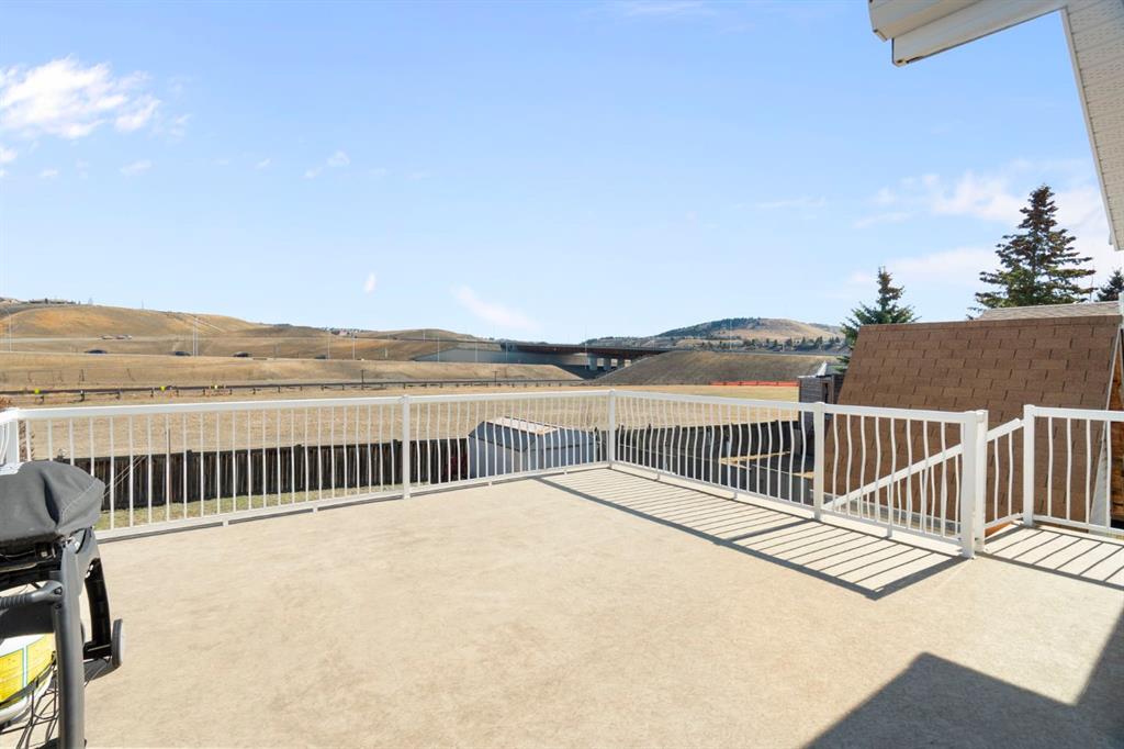 From the main floor, step out onto the large deck just off the dining area with a gas BBQ hookup and open views toward the foothills. The fully fenced backyard includes a dog run, garden shed and a two-storey playhouse that adds a fun and usable feature to the space.