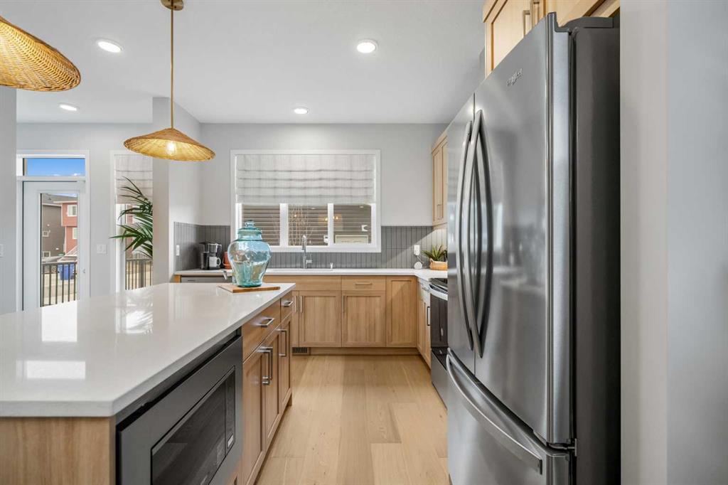 The main floor features a bright, open-concept layout designed to maximize both natural light and livability. Large windows create an inviting atmosphere throughout the living and dining areas, while the thoughtfully designed kitchen offers ample cabinetry, generous counter space, and a practical layout that makes meal preparation and entertaining effortless. The seamless flow between the kitchen, dining, and living spaces makes this home ideal for hosting gatherings or enjoying relaxed evenings with family. On this level you’ll find a front facing space for an office with bright natural daylight.