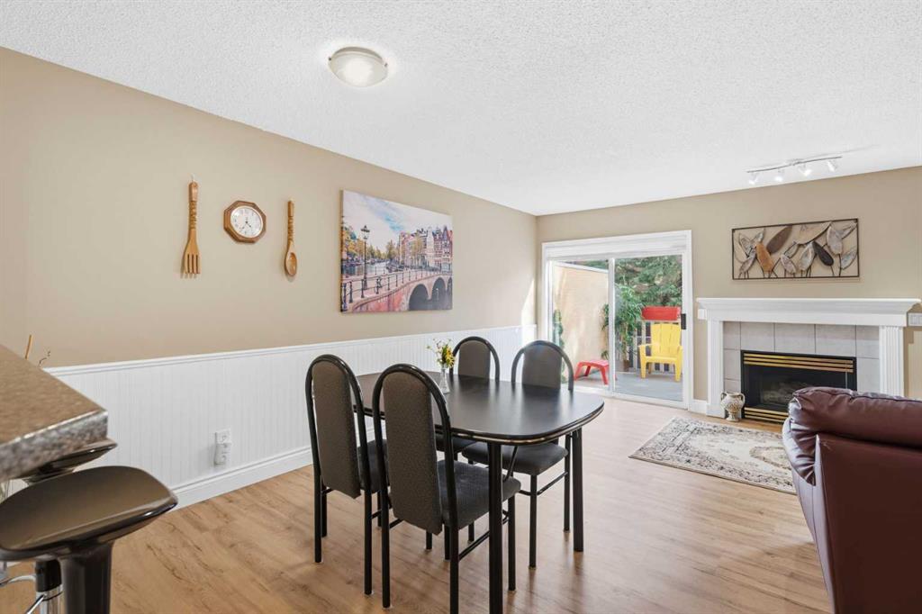 The adjoining dining and living areas are bright and inviting, enhanced by large south-facing windows that fill the space with natural light. A gas fireplace with mantle creates a comfortable focal point, while tasteful wainscoting adds a refined finishing touch.