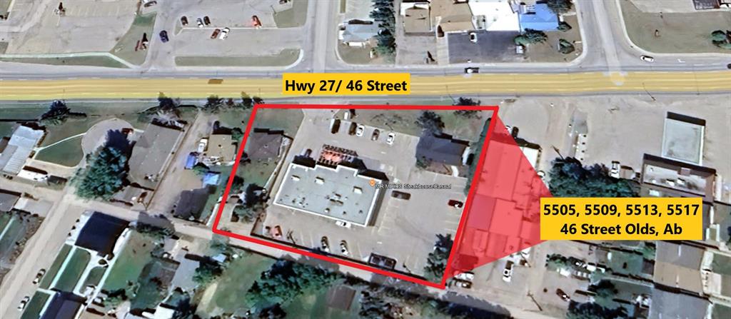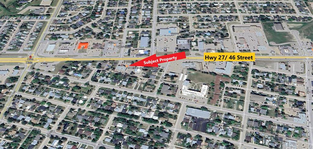 A rare and compelling Highway 27 opportunity in the Town of Olds. This offering comprises four civic addresses across two titles, with three properties consolidated on a single title, creating a unique and flexible commercial assemblage with both immediate income and long-term redevelopment upside.