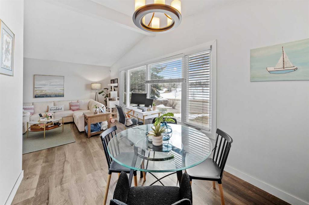 The main level features vaulted ceilings and large front-facing windows that flood the space with natural light. The open living and dining room provide a comfortable and functional layout for everyday living. The kitchen is finished with white shaker cabinetry, subway tile backsplash, and stainless steel appliances.