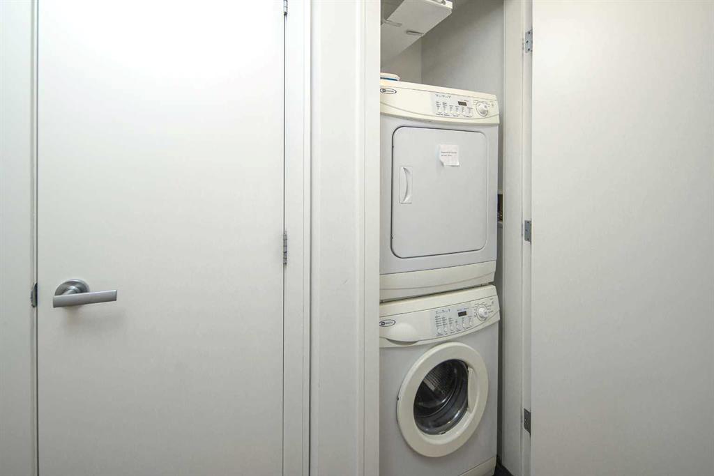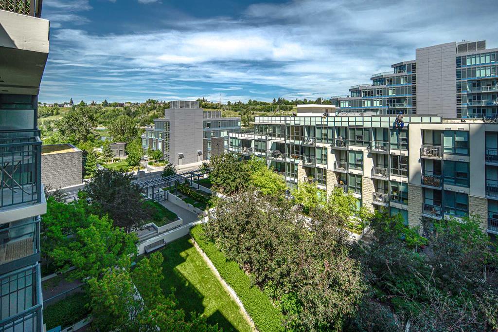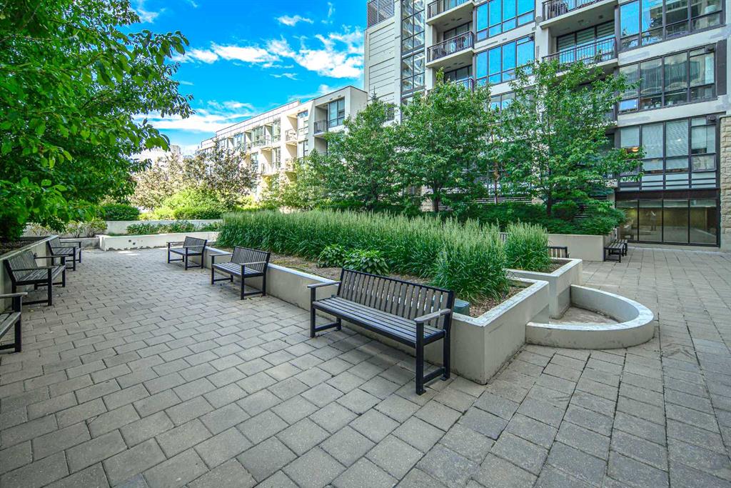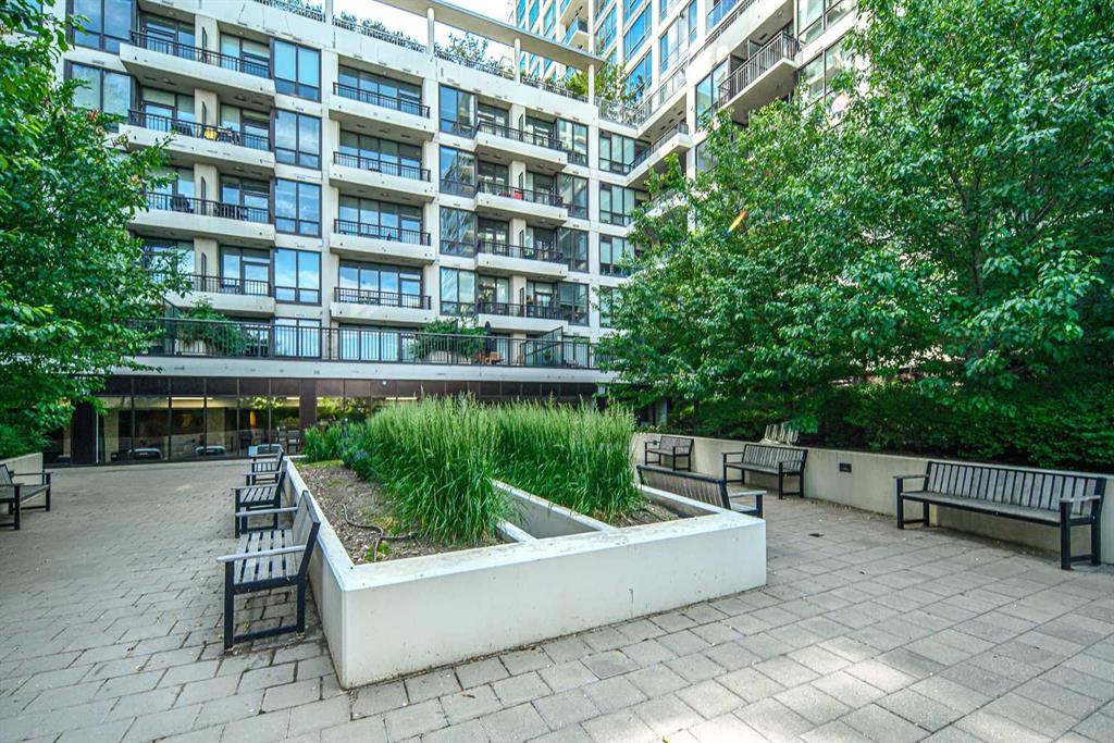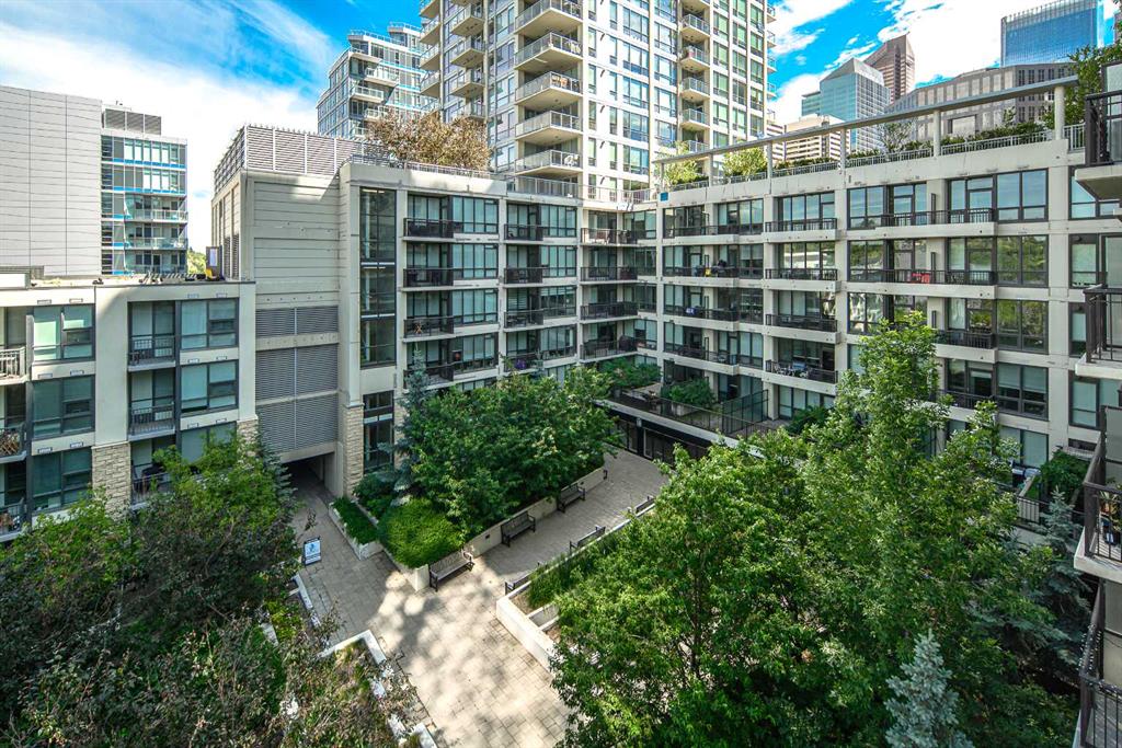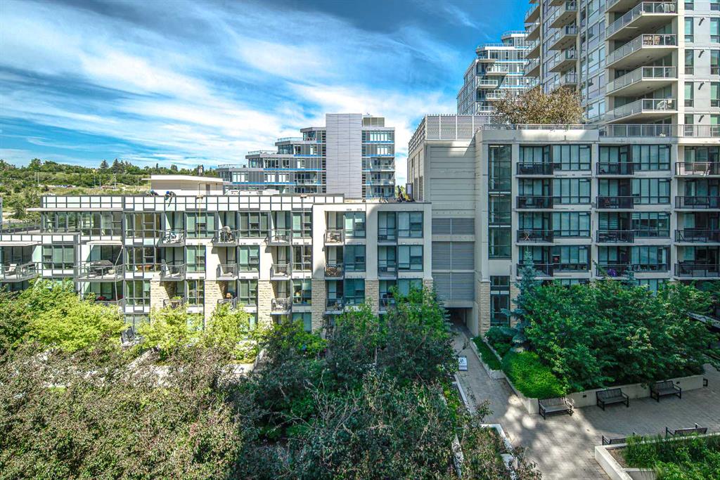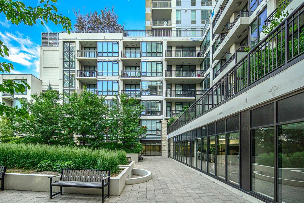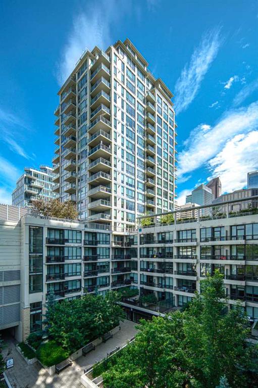 Welcome to this beautifully quiet upgraded unit on the top floor of Waterfront Tower, offering a tranquil escape with breathtaking courtyard views and abundant natural light. This one-of-a-kind residence faces the preferred east direction, ensuring golden sunshine year-round. Situated just steps away from the Bow River, Princess Island Park, and the incredible pathways leading into the downtown core and historic Kensington market, this unit offers both convenience and luxury. The high-quality laminated flooring complements throughout the space. The open-concept living room boasts soaring 9-foot ceilings and floor-to-ceiling windows, flooding the space with natural light. The elegantly designed kitchen features quartz countertops, professional stainless-steel appliances, modern cabinetry, ample cupboard space, a large counter area, a single stainless-steel sink, and a garburator. A thoughtfully placed built-in desk in its own space adds to the unit’s convenience. The master suite includes two double closets, a 3-piece bath with a quartz countertop, an undermount sink, a stand-up shower, and ceramic tile flooring. The laundry/storage space is equipped with a stackable washer/dryer set for your convenience. This unit also includes an underground parking stall and a storage locker. Additionally, central air conditioning ensures year-round comfort. Don’t miss the opportunity to view this exceptional residential gem on the market!