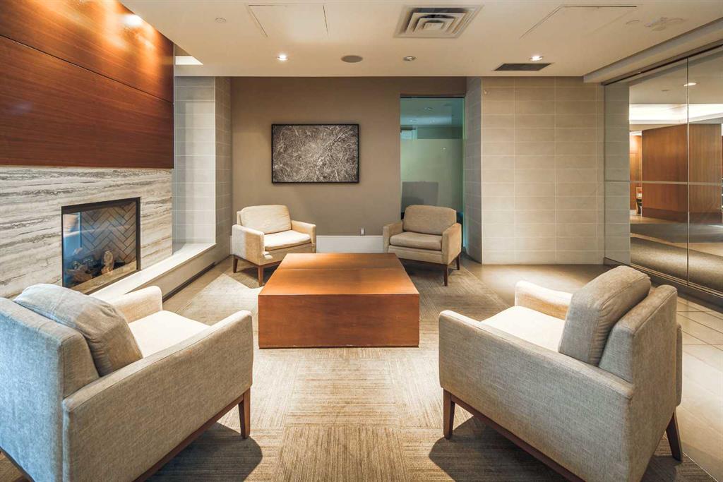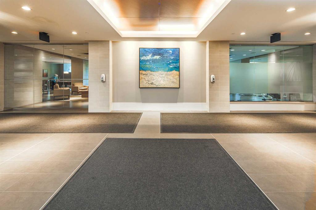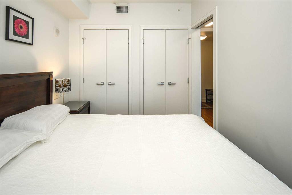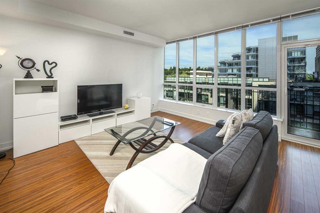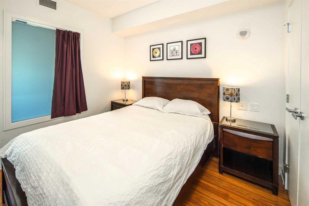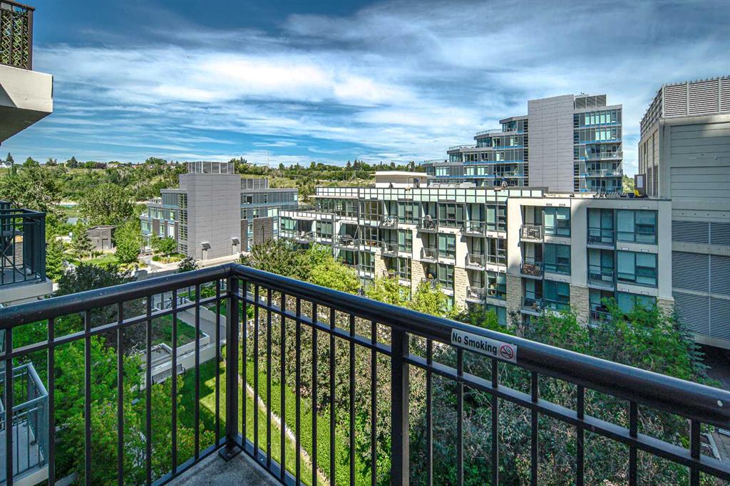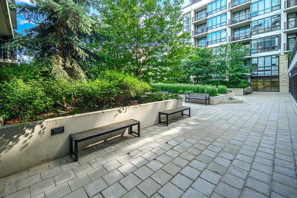 Welcome to this beautifully quiet upgraded unit on the top floor of Waterfront Tower, offering a tranquil escape with breathtaking courtyard views and abundant natural light. This one-of-a-kind residence faces the preferred east direction, ensuring golden sunshine year-round. Situated just steps away from the Bow River, Princess Island Park, and the incredible pathways leading into the downtown core and historic Kensington market, this unit offers both convenience and luxury. The high-quality laminated flooring complements throughout the space. The open-concept living room boasts soaring 9-foot ceilings and floor-to-ceiling windows, flooding the space with natural light. The elegantly designed kitchen features quartz countertops, professional stainless-steel appliances, modern cabinetry, ample cupboard space, a large counter area, a single stainless-steel sink, and a garburator. A thoughtfully placed built-in desk in its own space adds to the unit’s convenience. The master suite includes two double closets, a 3-piece bath with a quartz countertop, an undermount sink, a stand-up shower, and ceramic tile flooring. The laundry/storage space is equipped with a stackable washer/dryer set for your convenience. This unit also includes an underground parking stall and a storage locker. Additionally, central air conditioning ensures year-round comfort. Don’t miss the opportunity to view this exceptional residential gem on the market!