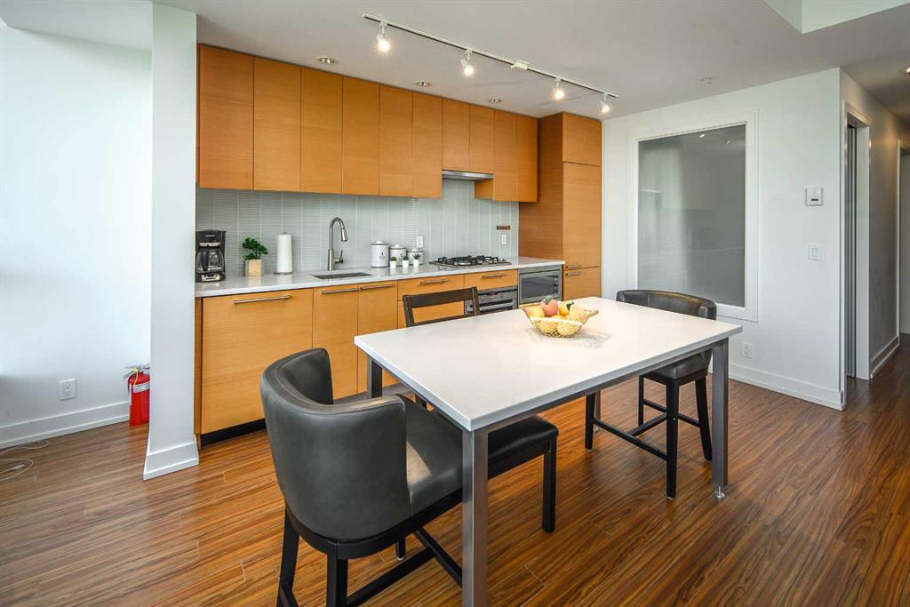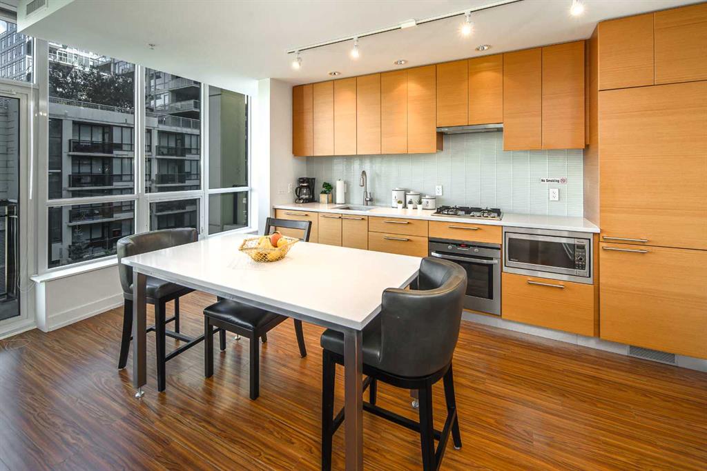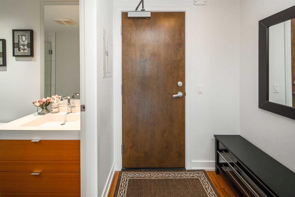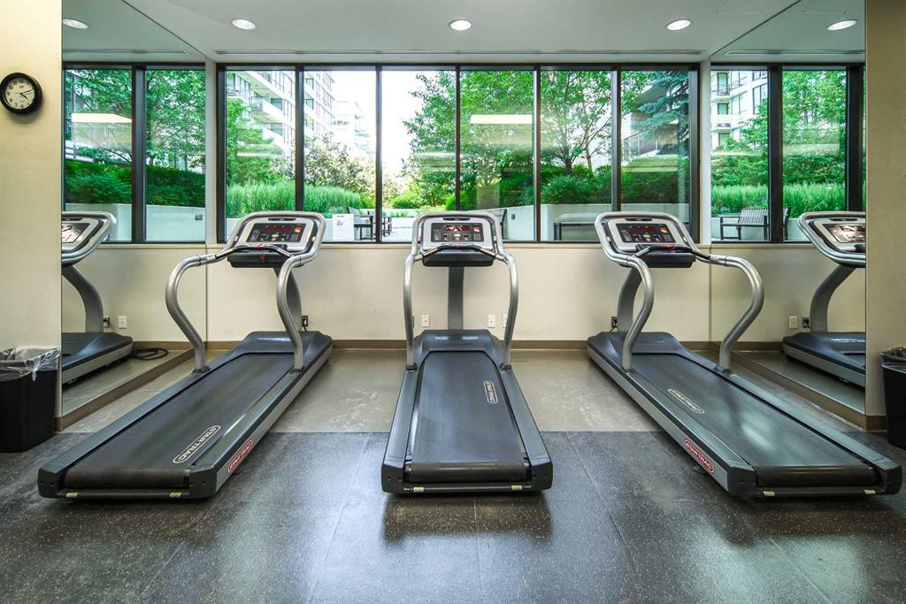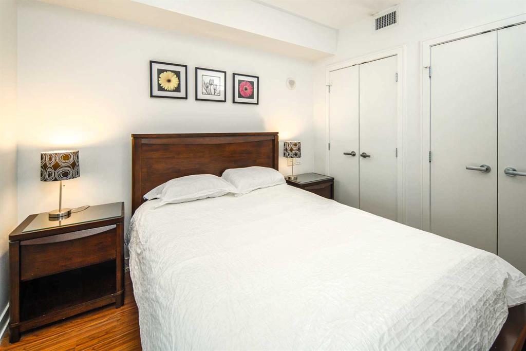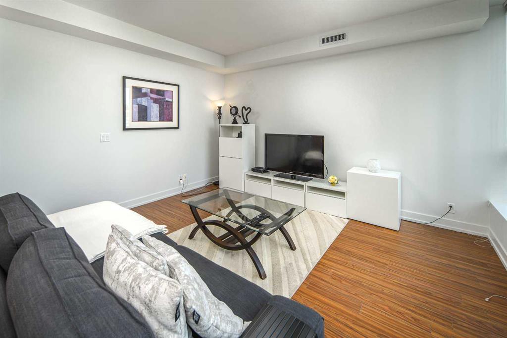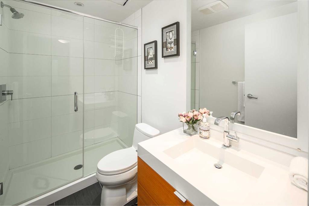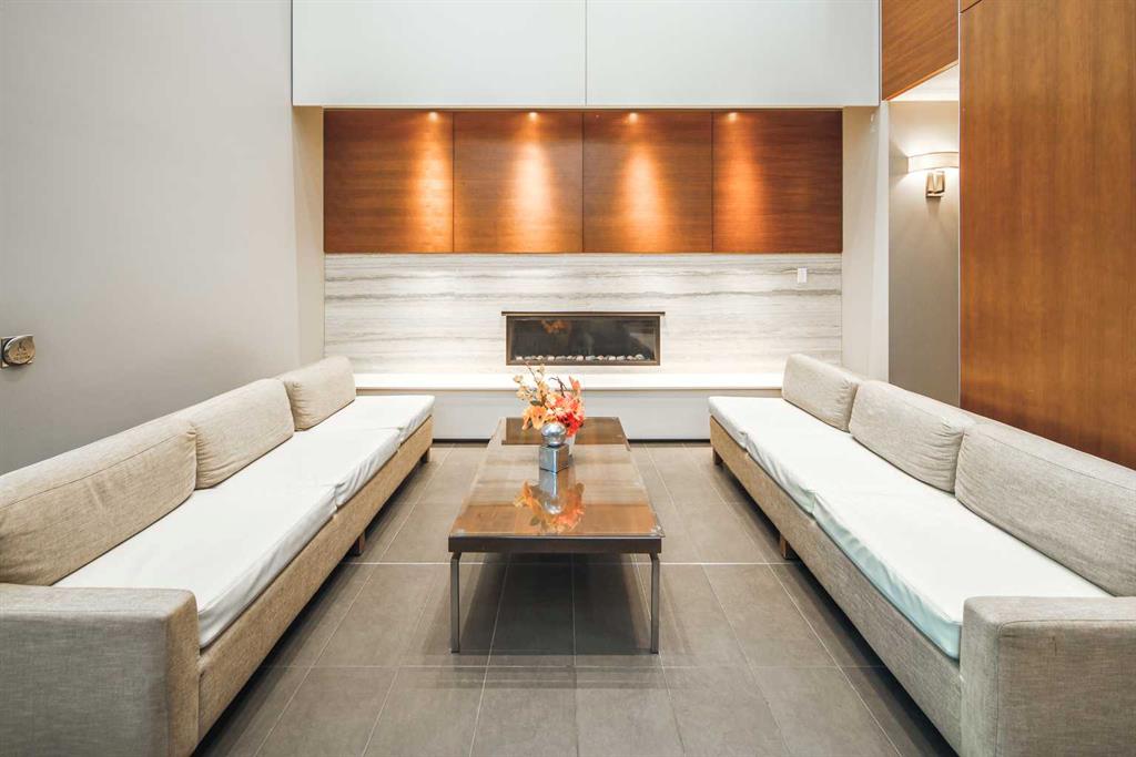 Welcome to this beautifully quiet upgraded unit on the top floor of Waterfront Tower, offering a tranquil escape with breathtaking courtyard views and abundant natural light. This one-of-a-kind residence faces the preferred east direction, ensuring golden sunshine year-round. Situated just steps away from the Bow River, Princess Island Park, and the incredible pathways leading into the downtown core and historic Kensington market, this unit offers both convenience and luxury. The high-quality laminated flooring complements throughout the space. The open-concept living room boasts soaring 9-foot ceilings and floor-to-ceiling windows, flooding the space with natural light. The elegantly designed kitchen features quartz countertops, professional stainless-steel appliances, modern cabinetry, ample cupboard space, a large counter area, a single stainless-steel sink, and a garburator. A thoughtfully placed built-in desk in its own space adds to the unit’s convenience. The master suite includes two double closets, a 3-piece bath with a quartz countertop, an undermount sink, a stand-up shower, and ceramic tile flooring. The laundry/storage space is equipped with a stackable washer/dryer set for your convenience. This unit also includes an underground parking stall and a storage locker. Additionally, central air conditioning ensures year-round comfort. Don’t miss the opportunity to view this exceptional residential gem on the market!