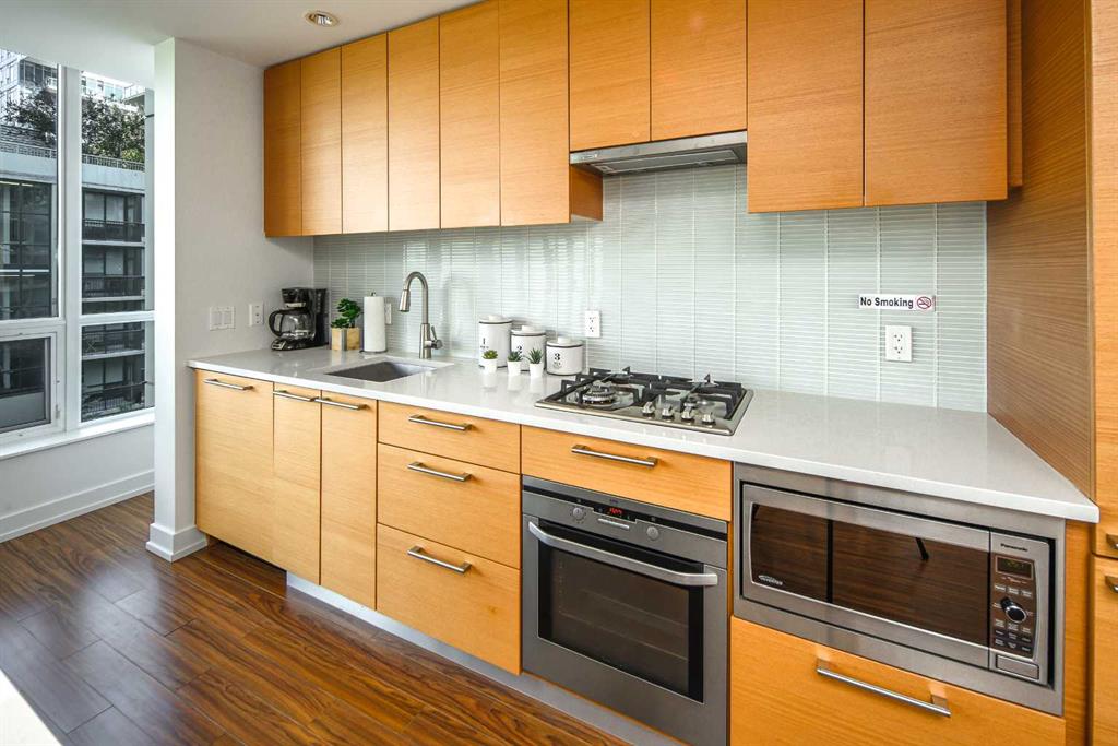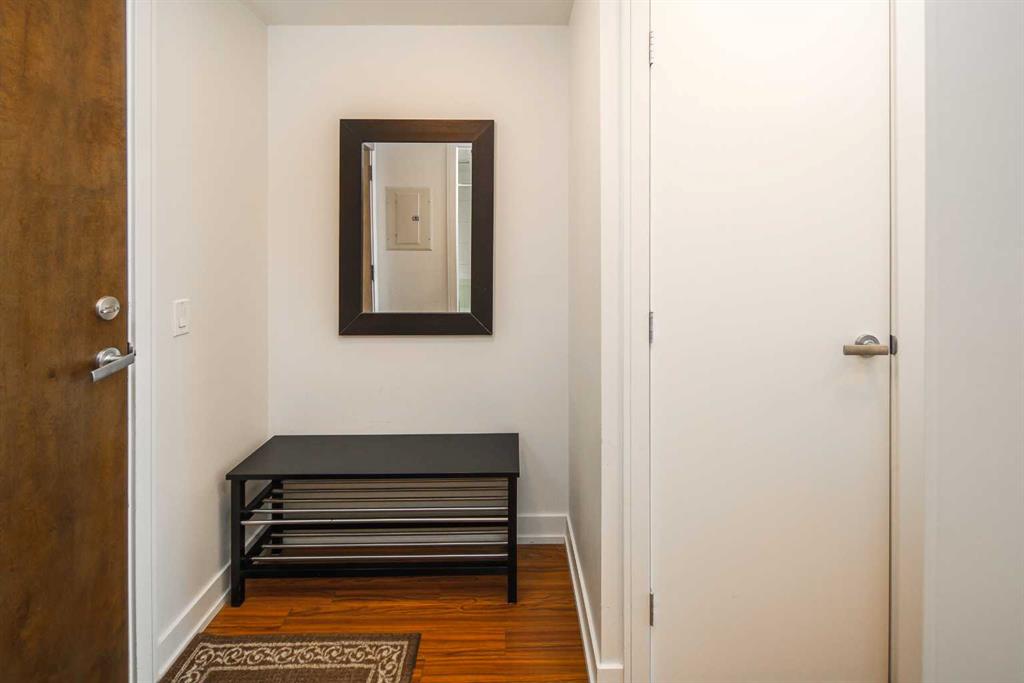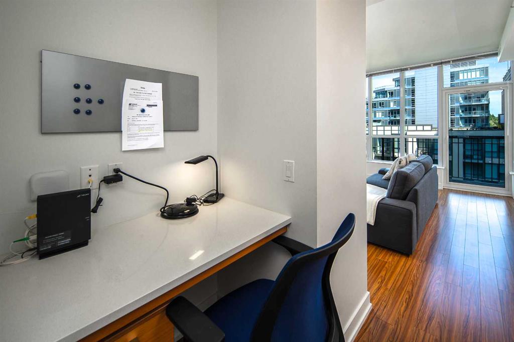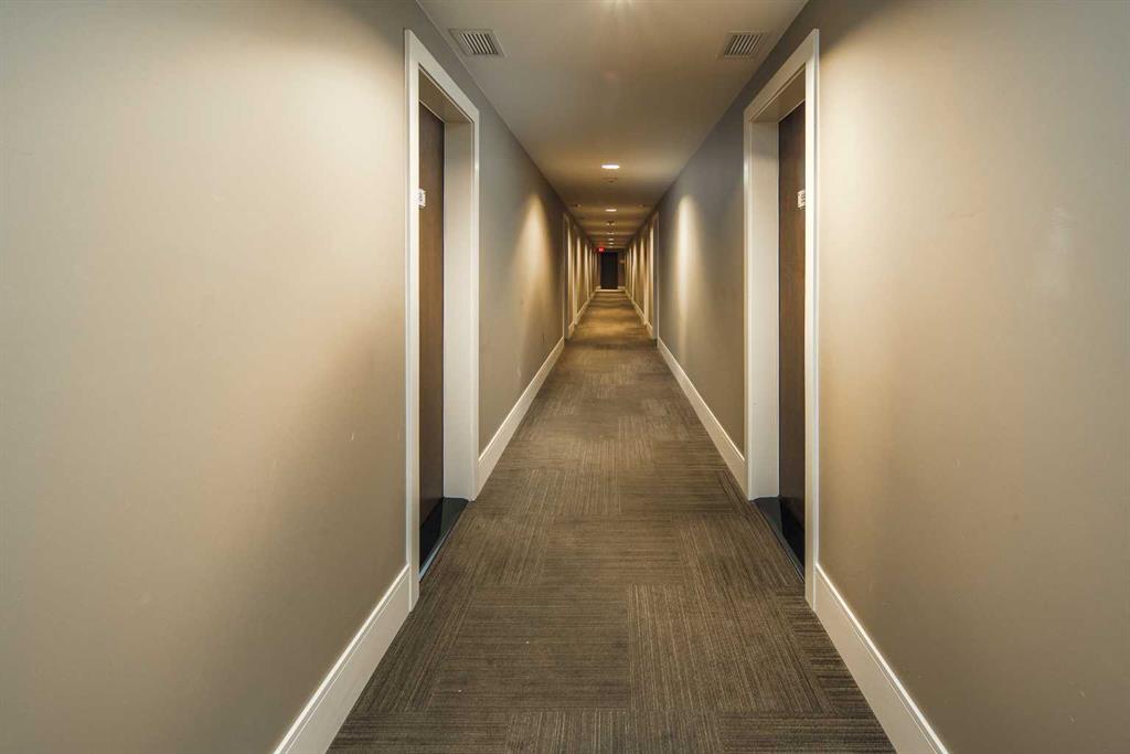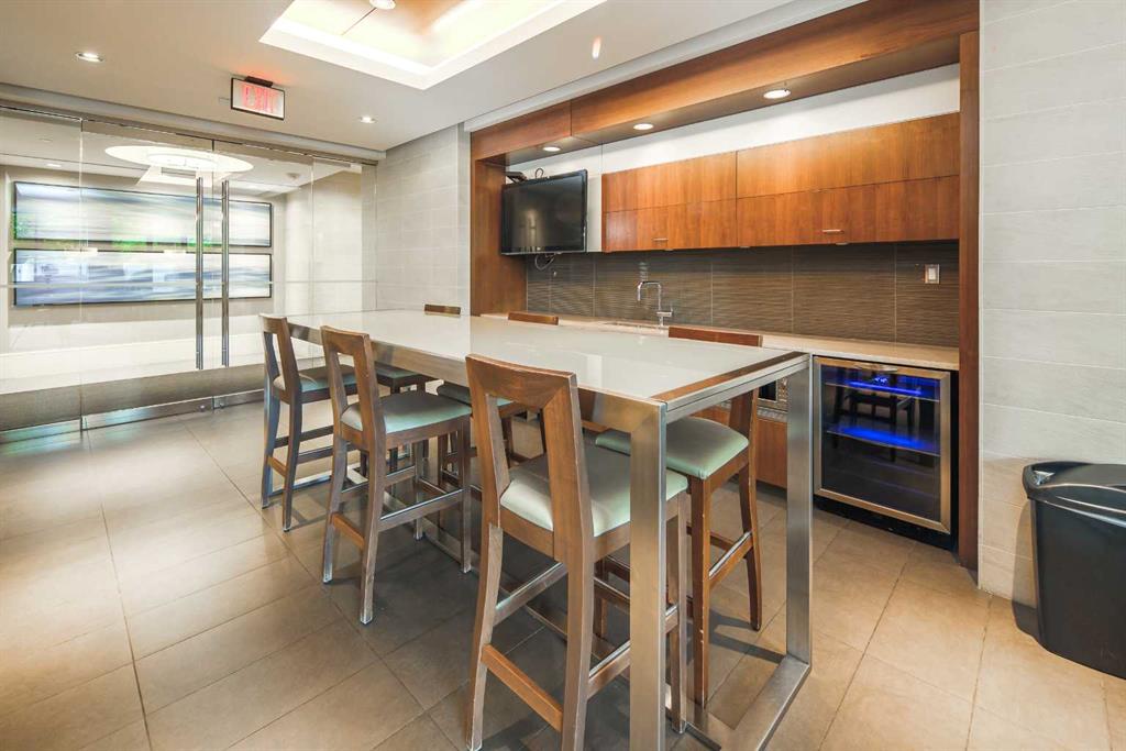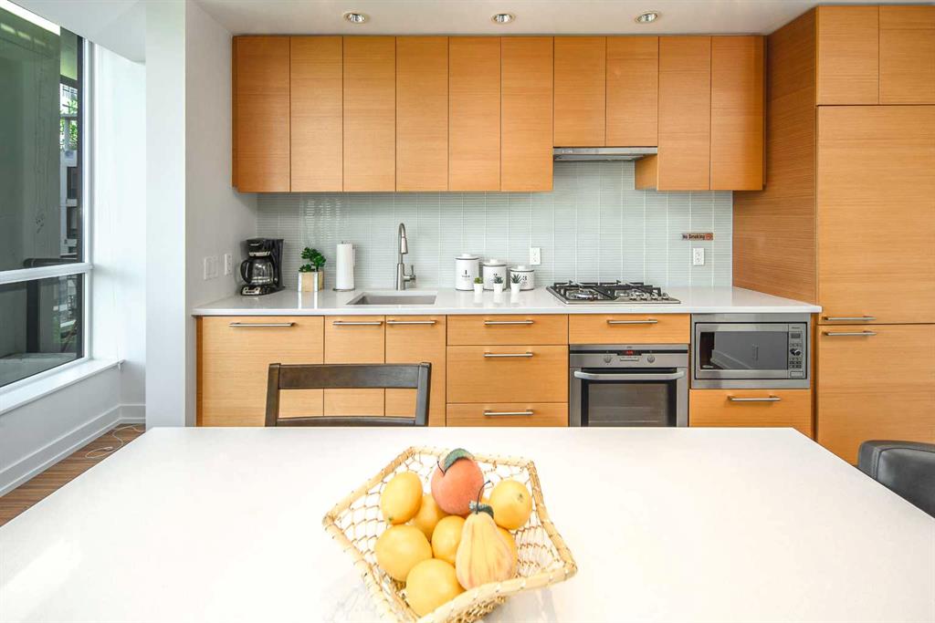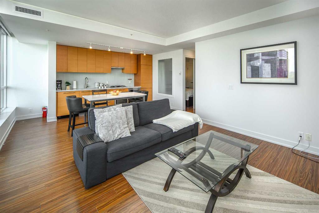 Welcome to this beautifully quiet upgraded unit on the top floor of Waterfront Tower, offering a tranquil escape with breathtaking courtyard views and abundant natural light. This one-of-a-kind residence faces the preferred east direction, ensuring golden sunshine year-round. Situated just steps away from the Bow River, Princess Island Park, and the incredible pathways leading into the downtown core and historic Kensington market, this unit offers both convenience and luxury. The high-quality laminated flooring complements throughout the space. The open-concept living room boasts soaring 9-foot ceilings and floor-to-ceiling windows, flooding the space with natural light. The elegantly designed kitchen features quartz countertops, professional stainless-steel appliances, modern cabinetry, ample cupboard space, a large counter area, a single stainless-steel sink, and a garburator. A thoughtfully placed built-in desk in its own space adds to the unit’s convenience. The master suite includes two double closets, a 3-piece bath with a quartz countertop, an undermount sink, a stand-up shower, and ceramic tile flooring. The laundry/storage space is equipped with a stackable washer/dryer set for your convenience. This unit also includes an underground parking stall and a storage locker. Additionally, central air conditioning ensures year-round comfort. Don’t miss the opportunity to view this exceptional residential gem on the market!