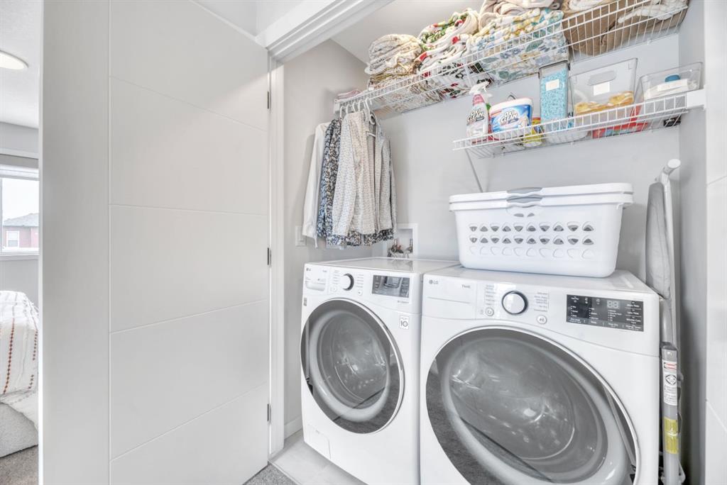 Upstairs, the primary suite offers a true spa-inspired ensuite, fully tiled in wood-look porcelain with timeless sconce lighting, an oversized soaker tub, and a tiled shower featuring a bench and slide-bar hand shower. Secondary bedrooms are generously proportioned and include custom closet systems. A spacious main bathroom provides abundant storage, while the upgraded upper-level laundry includes premium washer and dryer with additional built-in shelving.