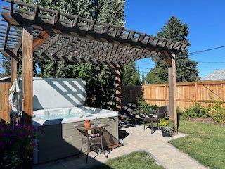 The thoughtfully designed main floor showcases walnut hardwood throughout and an open-concept layout. The kitchen features granite countertops, maple cabinetry, designer tile and lighting, plus abundant storage — Overlooking cozy family room with gas fireplace and room for full dining set. Patio doors lead to the fully fenced and landscaped backyard with a private deck (built in 2015) and stone patio to your 5 person hot tub— perfect for entertaining.