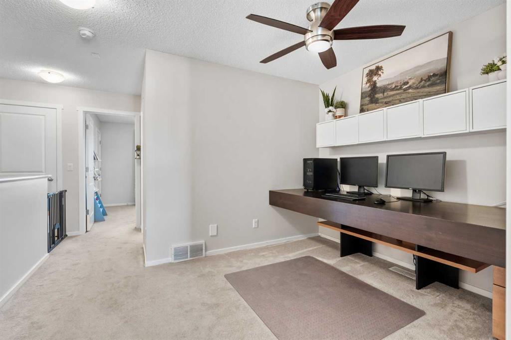 Legacy is a sought after district with its great shopping, schools, pathways and easy access to major thoroughfares. There is a bus stop across the street about half a block away on a route that connects to the south LRT. Relax on the sunny south facing front porch and enjoy the uninteruppted view of a large community pond with spectacular summer fountain display. Upon entry to the home you will immediately notice the spacious open concept main floor with nine foot high ceiling, living and dining space together with rear kitchen overlooking the private rear yard. For convenience a half bathroom is located on this level. On the second level you will find a generous size primary bedroom with a 4 piece ensuite and ample closet space. An open flex area currently used as an office and 4 piece bathroom separates the primary bedroom from a second bedroom on the upper level. Your laundry area is located on the upper floor. The basement was fully finished by the builder and includes a recreation/famly room, a bedroom and a 4 piece bathroom, ideal for guests or older children. The total developed living space is over 1800 square feet including three 4 piece bathrooms and a single half bath. The rear yard is fenced, includes a patio and a parking pad for two vehicles off the lane. Bonus, there are no condo fees for this home. Be sure to check out the virtual tour. You won’t want to miss this one!