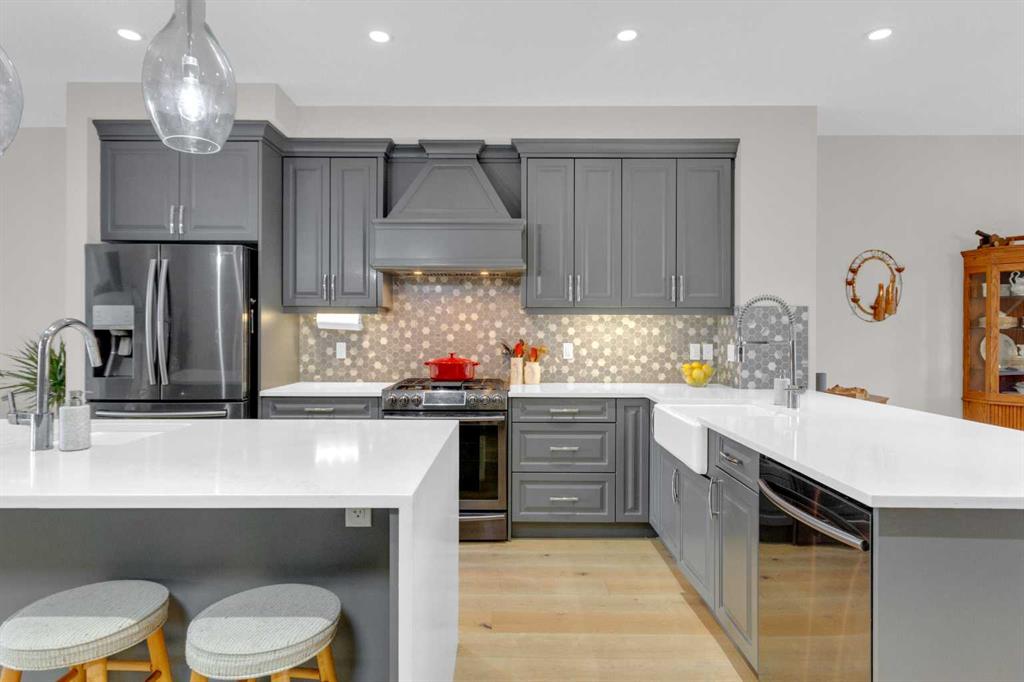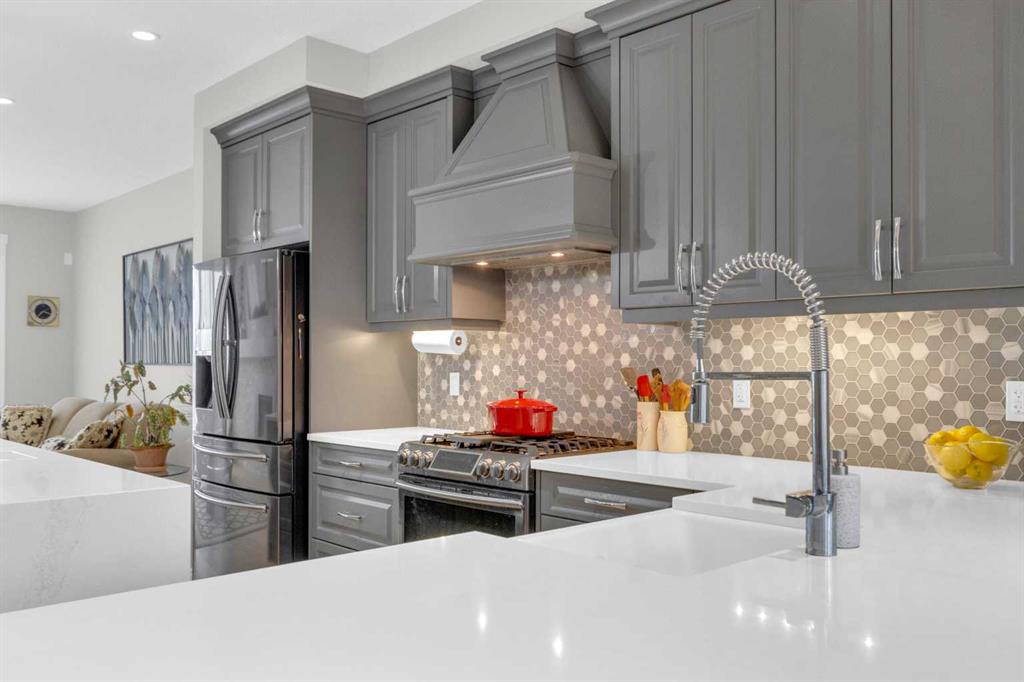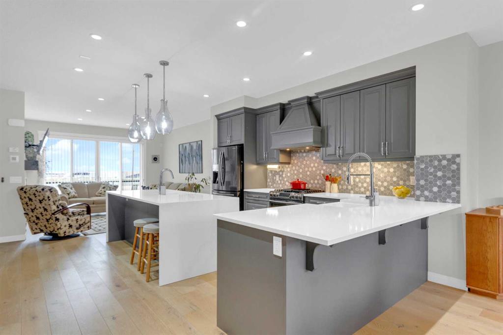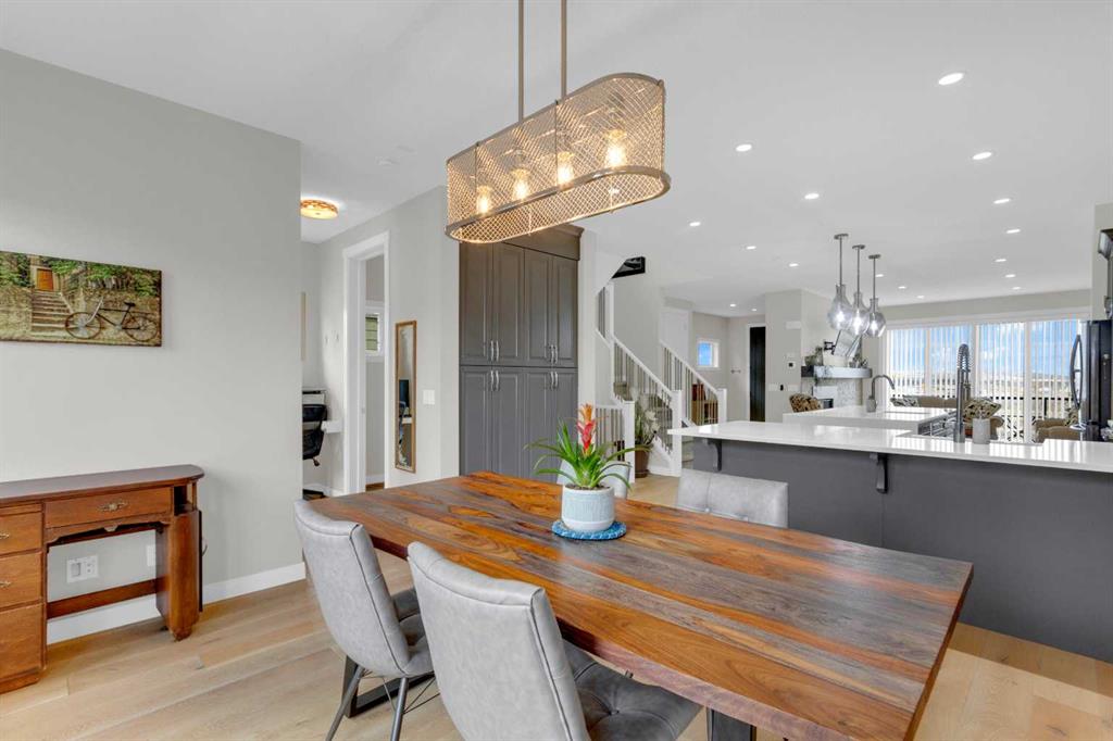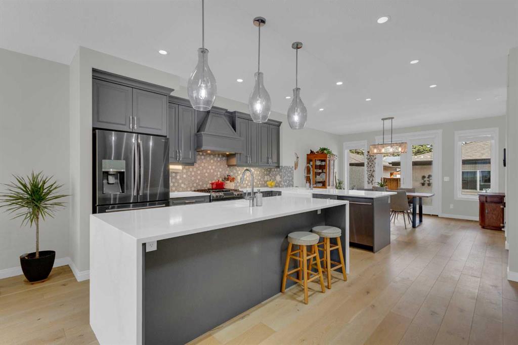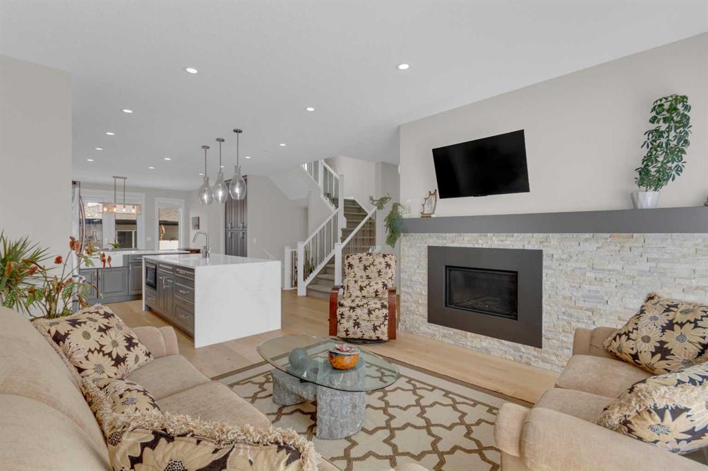 Welcome to this exceptional, upgraded home in the sought-after community of LAKEVIEW, offering MOUNTAIN VIEWS and an unbeatable lifestyle near parks, pathways, and top amenities. The main floor impresses with 9’ CEILINGS, WIDE PLANK HARDWOOD FLOORING, and abundant natural light from OVERSIZED WINDOWS. Designed for both everyday living and entertaining, the open-concept layout is anchored by a stunning CHEF’S KITCHEN, truly the heart of the home. Anchored by a massive WATERFALL QUARTZ ISLAND and an additional L-shaped counter, this space offers exceptional prep area and countertop SEATING FOR UP TO 10, creating the perfect gathering place for family and friends. Highlights include both a PREP SINK AND SECOND FARMHOUSE SINK, CEILING-HEIGHT CABINETRY, and a full suite of stainless-steel appliances including a GAS RANGE and French door refrigerator. The custom hood fan blends seamlessly with the cabinetry, while striking pendant lighting and a stylish backsplash add a polished, designer finish. With an abundance of cabinetry and thoughtfully designed storage throughout, this kitchen delivers both beauty and function at an impressive scale. The living room showcases a FULL WALL GAS FIREPLACE with impressive stonework, and opens to a spacious FRONT DECK with ELECTRIC AWNING and WEST-FACING MOUNTAIN VIEWS. The dining area easily accommodates a large table and flows seamlessly to the backyard through double FRENCH DOORS, creating effortless indoor-outdoor living. At the rear, A MUDROOM WITH BUILT-IN STORAGE, powder room, and BUILT-IN DESK AREA—perfect for keeping daily life organized. Upstairs, the luxurious primary retreat is a true sanctuary, featuring MOUNTAIN VIEWS, a private JULIET BALCONY, and a versatile SITTING AREA ideal for reading, working, or relaxing. The ensuite includes HEATED TILE FLOORS, a STANDALONE SOAKER TUB, oversized GLASS SHOWER WITH BENCH, PRIVATE WATER CLOSET, and a DOUBLE VANITY with ample storage. The DREAM WALK-IN CLOSET is beautifully designed with CUSTOM SHELVING, CABINETRY, and SHOE STORAGE. Two additional spacious bedrooms with large windows, a full 5-PIECE MAIN BATHROOM with double vanity, and a well-appointed laundry room with abundant storage round out the upper level. The backyard is ready for summer entertaining with a LARGE CONCRETE PATIO and gas BBQ hookup. A DOUBLE DETACHED GARAGE with its OWN ELECTRICAL PANEL adds convenience and functionality. The undeveloped basement offers future potential with a bathroom rough-in. Additional features include roof top SOLAR PANELS and AIR CONDITIONING. Ideally located within walking distance to NORTH GLENMORE PARK, the GLENMORE RESERVOIR, and extensive pathway systems, this home is perfect for outdoor enthusiasts. Enjoy easy access to TOP-RATED SCHOOLS, shopping, Mount Royal University, and major routes including Glenmore Trail, Sarcee Trail, and the ring road—MAKING COMMUTING AROUND THE CITY OR ESCAPING TO THE MOUNTAINS EFFORTLESS. VIEW THE VIRTUAL TOUR FOR THE FULL EXPERIENCE!!