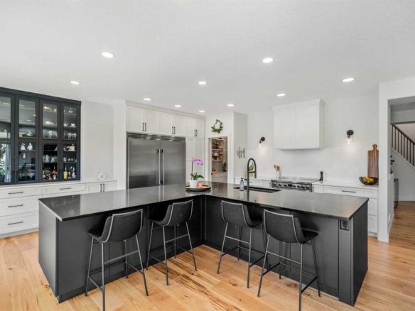 Completely renovated throughout, this exceptional bungalow showcases refined design and exceptional craftsmanship. The open-concept main floor features vaulted ceilings and a striking two-sided stone fireplace, creating an atmosphere of warmth and sophistication. Sunlight fills the living spaces, emphasizing the home’s flowing layout and high-end finishes that blend timeless charm with contemporary function.