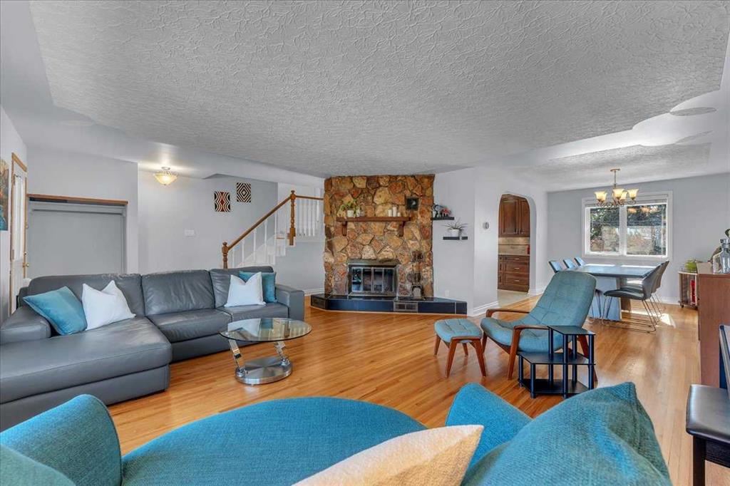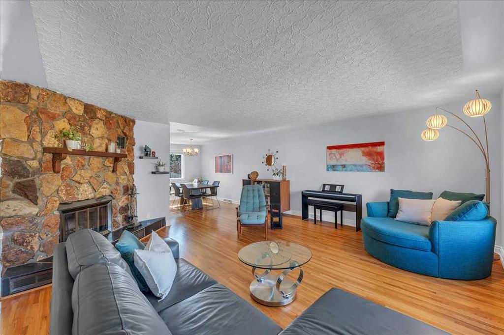 Step inside and you’re greeted by a bright, expansive main living area where large windows fill the space with natural light and beautifully maintained original hardwood floors add timeless charm. A stunning stone wood-burning fireplace anchors the room, creating the perfect place to gather on cooler evenings. The open flow into the dining space is ideal for both everyday living and hosting.