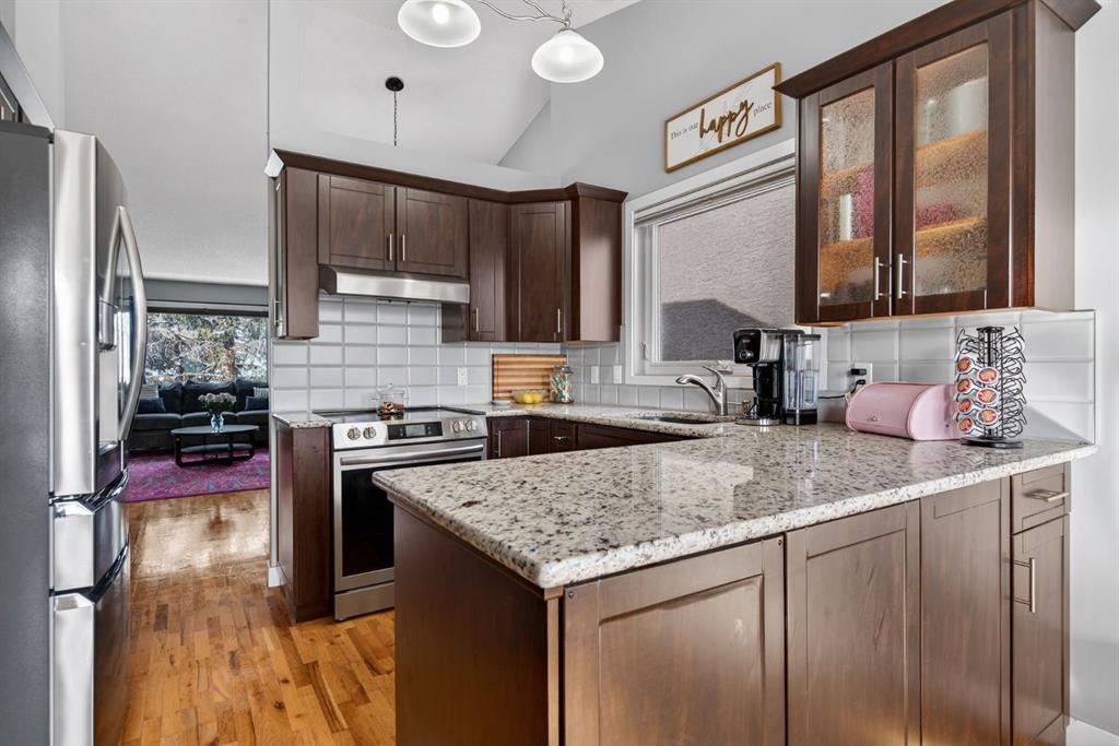 Tucked onto a massive, mature lot backing directly onto serene green space, this beautifully maintained bi-level walkout offers more than 2,300 sq ft of developed living space and the lifestyle you’ve been waiting for. From the moment you step inside, vaulted ceilings and expansive windows flood the main floor with natural light, highlighting the rich hardwood flooring and creating a warm, welcoming atmosphere throughout the living and dining areas. The thoughtfully designed kitchen blends style and function with maple cabinetry, granite countertops, and stainless steel appliances, making it the perfect space to cook, gather, and entertain. The main level features two generous bedrooms, with the option to easily convert back to three, along with two full bathrooms designed for everyday comfort and flexibility. Downstairs, the bright walkout level is equally impressive, complete with in-floor heating, wide-plank luxury vinyl flooring, and a spacious recreation area anchored by a cozy gas fireplace. Two additional bedrooms or a bedroom and home office, a modern 3-piece bathroom, and a dedicated laundry space offer versatility for growing families, guests, or remote work. Step outside to enjoy the sunny south-facing backyard, beautifully landscaped with stone accents and Rundle rock, plus a durable rubberized deck, a new deck umbrella, and a plug-and-play inflatable hot tub for year-round enjoyment. Permanent Gemstone exterior lighting (2024) adds both style and convenience. Along the side of the home, you’ll find a large storage shed with a secure, lockable gate, offering excellent space for tools, toys, and seasonal storage. Major upgrades include roof (2021), hot water tank (2024), leaf filter system with lifetime warranty (2024), furnace, and water softener — offering long-term peace of mind and value. A double attached garage and direct access to extensive walking paths and open green space complete the package. This is a rare opportunity to own a move-in-ready home that perfectly balances comfort, thoughtful upgrades, and an unbeatable location close to everything that matters.