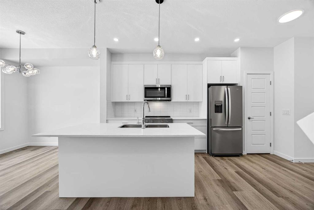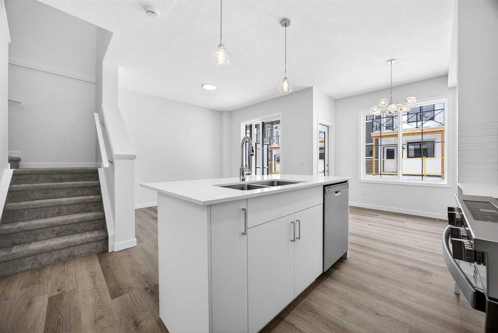 This fully finished two-storey townhome offers exceptional flexibility with four bedrooms and four bathrooms across three levels of developed living space. The main floor features a bright open-concept layout connecting the kitchen, dining area, and living room, creating a comfortable space for both everyday living and entertaining. The kitchen is beautifully finished with modern slab-style cabinetry featuring 42” upper cabinets, a full bank of drawers, soft-close doors, polished white quartz countertops, tile backsplash, stainless steel Whirlpool appliances, and a polished chrome Moen high-arc faucet with pull-down sprayer. Luxury vinyl plank flooring runs throughout the main living areas, bathrooms, and laundry room, while contemporary lighting selected by professional designers completes the modern interior.