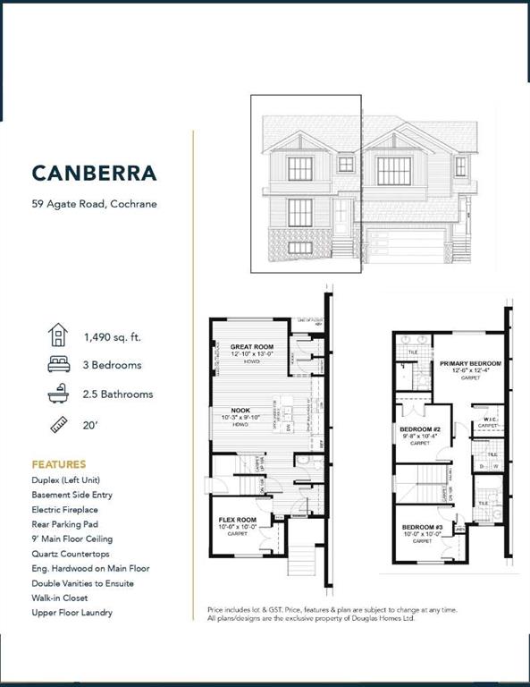 BRAND NEW HOME by Douglas Homes, Master Builder in central Greystone, short walking distance to parks, the Bow River, major shopping & interconnected pathway system. Featuring the Canberra with main floor forward enclosed Flex Room/4th Bedroom & separate side entry on an R-MX zoned home site for POTENTIAL future lower level suite. NOTE: a secondary suite would be subject to approval and permitting by the city/municipality. This gorgeous 3 bedroom, 2 & 1/2 half bath home offers 1490 sq ft of living space. This home is located on a Agate Road which provides immediate access to the Children’s Park at the end of the street and easy access interconnective pathway system, perfect for those looking for a outdoor lifestyle. Loads of Designer & upgraded features in this beautiful, open floor plan. The main floor greets you with 8′ front door, soaring 9′ ceilings, oversized windows, built-in niches & fireplace. Gleaming Hardwood floors flow through the kitchen, hall & nook adding a feeling of warmth & style. At the front of the home you’ll find an enclosed bright Flex Room (could also be a main floor bedroom) with 8’0″ French Door and storage closet for the work from home crowd. The Kitchen is completed with Quartz Countertops, two tone Kitchen Cabinets, 42″ uppers with decorative enclosed bulkhead, plenty of drawers including Pots & Pan drawers, soft close doors & drawers & new stainless steel Kitchen appliance package. Upstairs you’ll find a generous Primary Bedroom with Ensuite – Quartz Counters with double vanities, 5′ shower with Designer tiled walls & toilet in its own private doored room all completed with ceramic tile flooring & large walk-in closet accessed from the bedroom. The 2nd floor is completed by two good size additional bedrooms, main bath tub/shower combination with tiled walls, window, Quartz countertop, undermounted sink & ceramic tile flooring. You will love the convenience of 2nd Floor Laundry Room for side by side laundry completed with ceramic floor tile. This is a very popular plan, great for young families, investors or the down sizers. Spacious, Beautiful and Elegant! The perfect place for your perfect home. Call today! Photos are from prior build & are reflective of fit, finish & included features. Note: Front elevation of home & interior photos are for illustration purposes only. Actual elevation style, interior colors/finishes, & upgrades may be different than shown & the Seller is under no obligation to provide them as such. Directions: Come to the Show Home first located at 500 River Avenue. Showings only during Show Home hours & days. THIS HOME IS UNDER CONSTRUCTION