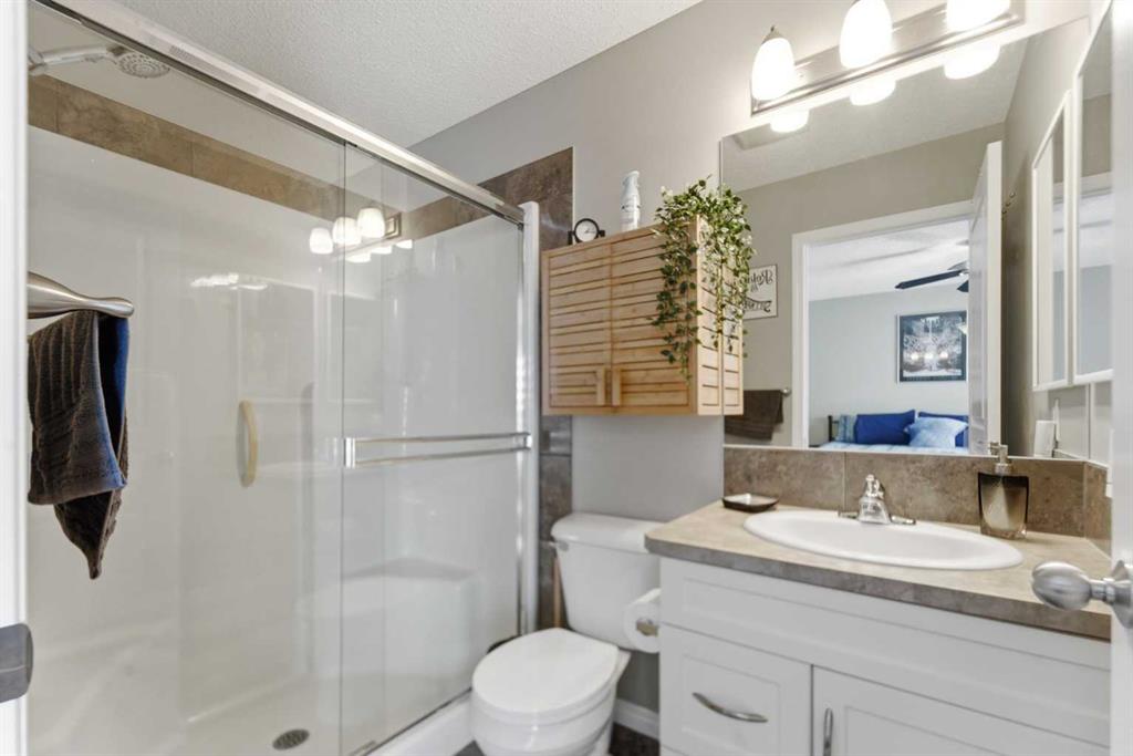 Welcome to this Stunning End Unit, multi-level open-concept townhome located on a quiet, cul de sac location. This meticulously maintained home boasts bright interiors with soaring 12-foot ceilings and an abundance of natural light streaming through floor-to-ceiling windows. Upstairs, you’ll find two master bedrooms, each with a full en-suite and walk-in closet. The heart of this home is its spacious and beautifully appointed white kitchen, featuring tile flooring, ceiling-height upper cabinets, a raised eating bar, pantry, and coffee bar area. The open-concept dining room has an updated ceiling fan light, it overlooks into the living area, creating an inviting space for entertaining. Additionally, there’s a convenient half bath on the main floor. Step outside to your private fenced patio, perfect for enjoying summer evening barbecues. The lower level offers a generous storage/laundry area and access to the double attached garage. Located just minutes away from shopping, transit, hospitals, schools, and with easy access to Deerfoot and Stoney Trails, this home combines convenience with comfort. Plus, enjoy the added benefit of low condo fees covering yard maintenance, snow removal, and annual window cleaning. Recent upgrades include Zebra window coverings throughout and a newer washer and dryer, new fridge in the kitchen and second fridge in basement new hot water tank, upgraded lighting throughout. Book your viewing today!