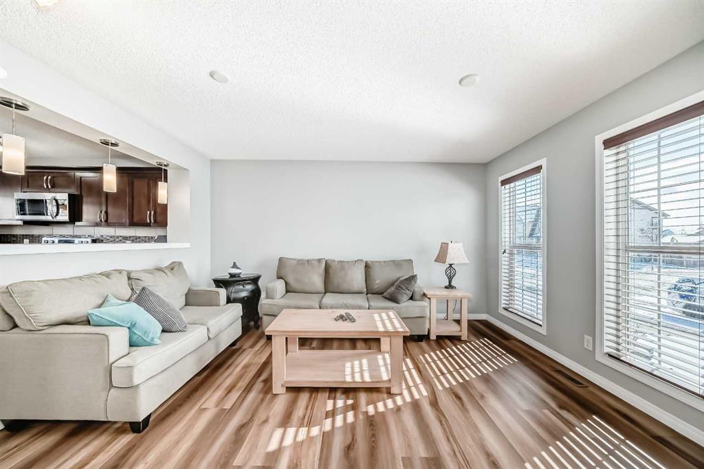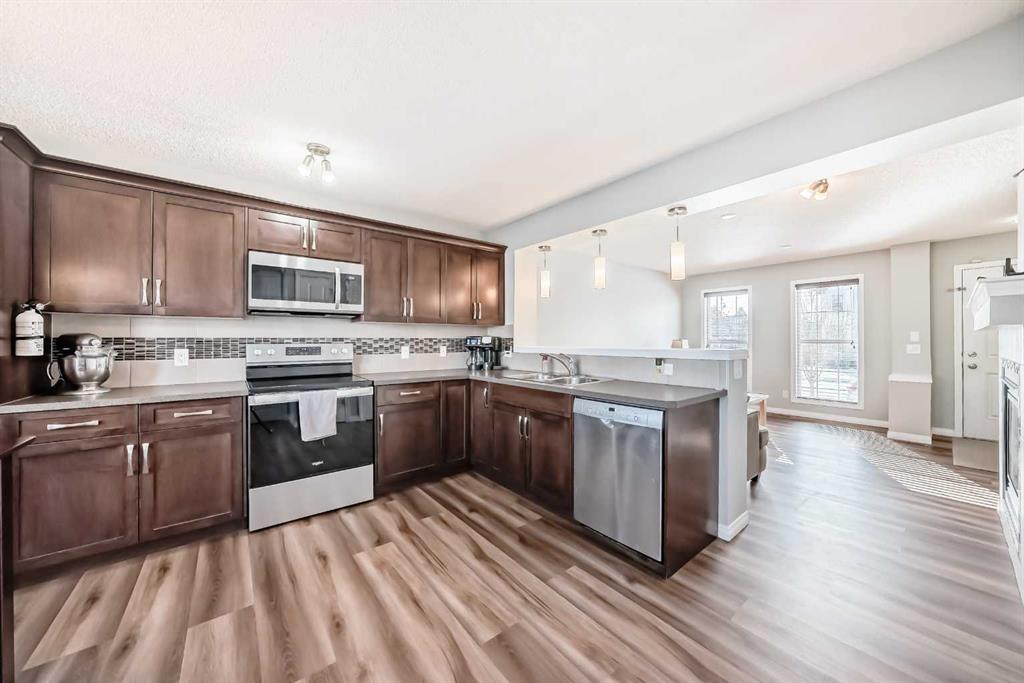 Located on a quiet street in the SE corner of McKenzie Towne, this home is a short walk from shopping, parks and the McKenzie Towne bus terminal. Main floor offers a bright, open layout with new LVP flooring throughout. The living room has large windows bringing in plenty of natural light, a gas fireplace with mantle and TV ledge. The kitchen includes full-height cabinetry, ample counter space, tile backsplash, and a raised eating bar overlooking the living room. Stainless steel dishwasher, OTR microwave and stove are newer. Adjacent dining nook is positioned in a bay window setting with backyard views.
