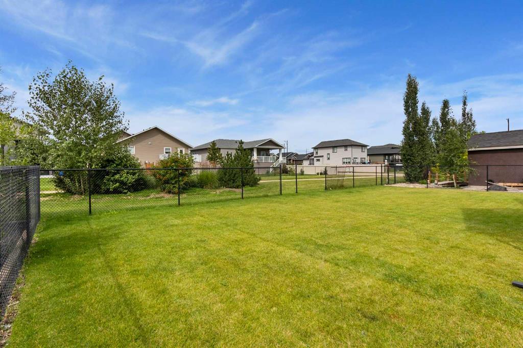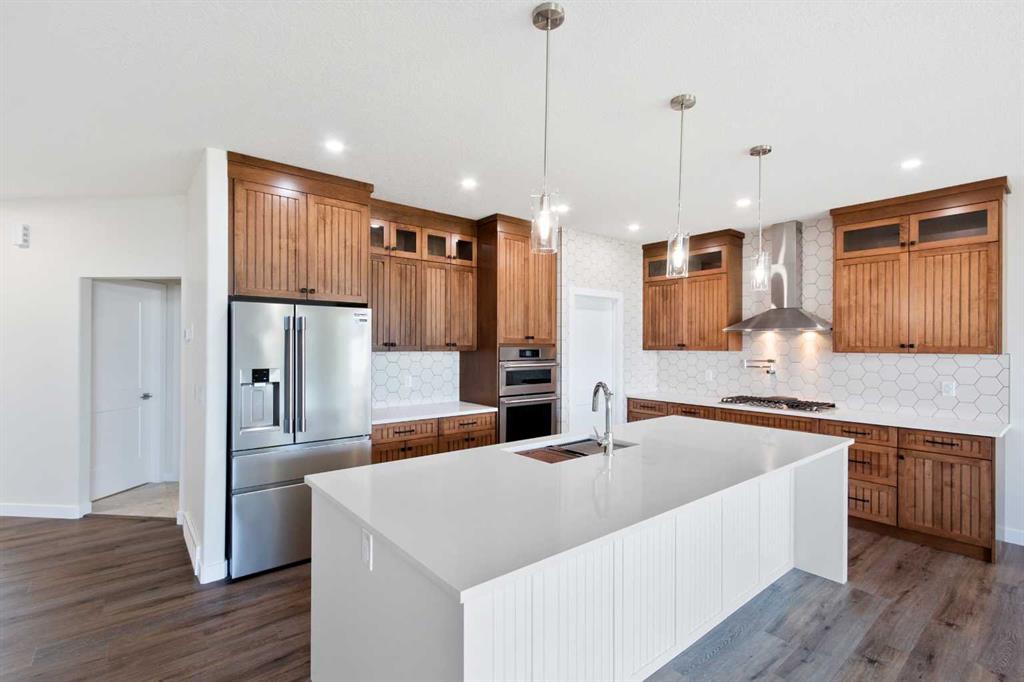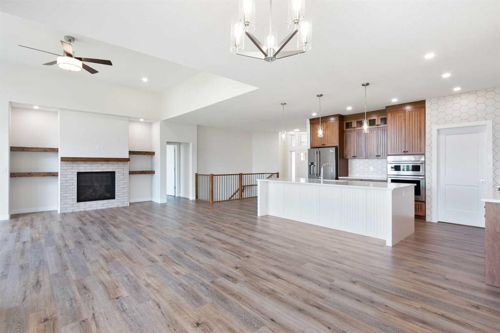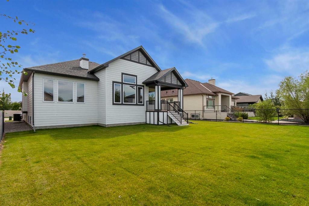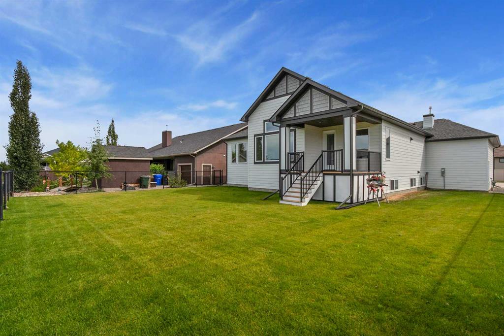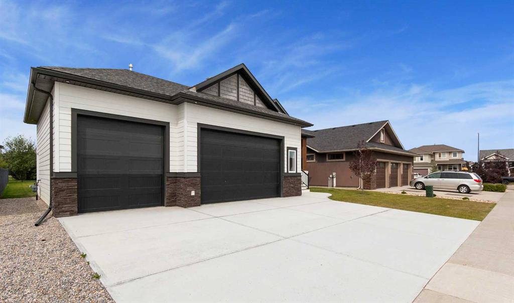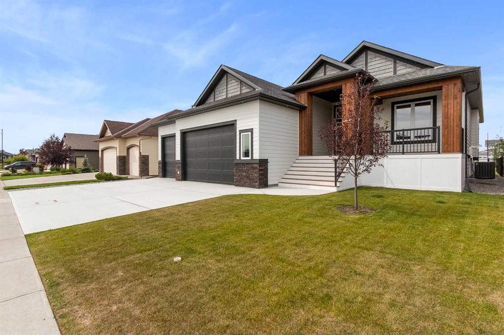 Welcome to this beautifully crafted new-build modern bungalow, perfectly situated in the sought-after Highlands subdivision. Featuring 5 spacious bedrooms and 3 luxurious bathrooms, this home offers the perfect blend of style, comfort, and functionality. Step inside to an impressive open-concept layout, where the heart of the home includes a large living room with a cozy gas fireplace, a generous dining area, and a chef’s dream kitchen complete with quartz countertops, eye-catching tile accents, and a butler’s pantry for added convenience. The main floor features a spacious primary suite with a 5-piece ensuite and a walk-in closet. A second bedroom, large laundry room, and access to the triple attached heated garage complete this level. Downstairs, you’ll find three additional well-sized bedrooms, a 4-piece bath, a large recreation room, and a wet bar, making this the perfect space for entertaining or relaxing. There’s also a massive utility room offering plenty of storage. Enjoy outdoor living with a low-maintenance covered front porch, fully landscaped front and back yards, and a covered rear deck that backs on to a open area with a walking path ideal for entertaining or enjoying your morning coffee. This home truly checks all the boxes for modern living in a prime location. Don’t miss your chance to call it home!