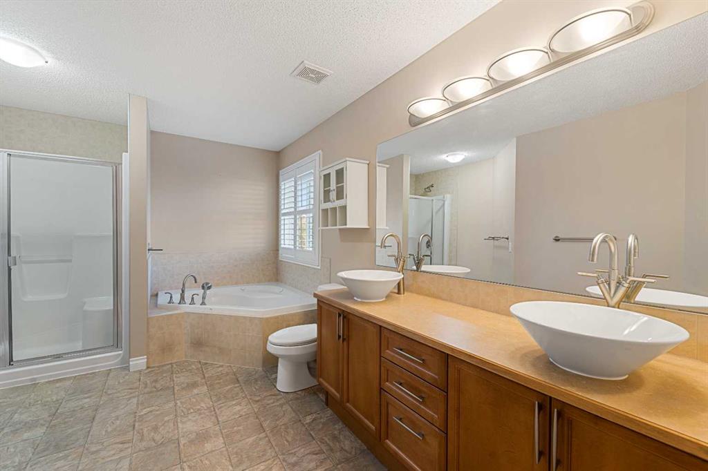 and private spa like 5pc ensuite bath. The ensuite has a double vanity with vessel sinks, a walk-in shower, a corner deep soaking jet tub and open
