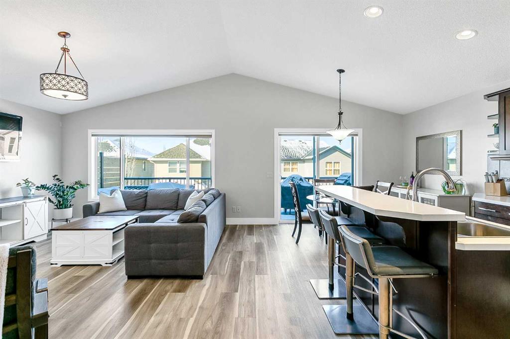 Looking for a bungalow in a predominantly two-storey community? Look no further! This stunning home has been freshly painted throughout and features soaring vaulted ceilings and gorgeous luxury vinyl plank flooring on the main floor. The bright and functional kitchen is complete with stainless steel appliances, a gas range, a corner pantry, and a convenient eating bar. Perfect for everyday living and entertaining alike. The inviting living room is anchored by a cozy corner gas fireplace, while the dining area offers direct access to the spacious back deck, complete with a gas line for your BBQ and plenty of room for outdoor seating. The primary bedroom easily accommodates king-sized furniture and features a walk-in closet and a private 4-piece ensuite. A second bedroom and 2-piece bath complete the main level. The fully finished walkout basement expands your living space with a third bedroom, 4-piece bathroom, wet bar, large family room, generous storage, and laundry room. The double attached garage is both insulated and heated for year-round comfort. Enjoy summer in the low-maintenance backyard featuring a lower deck with a second gas line, designated hot tub space, and firepit area. Perfectly situated on a quiet street, this home is within walking distance to multiple green spaces, schools, the off-leash dog park, the lake, and clubhouse amenities. A rare opportunity in a sought-after location. Don’t miss it!