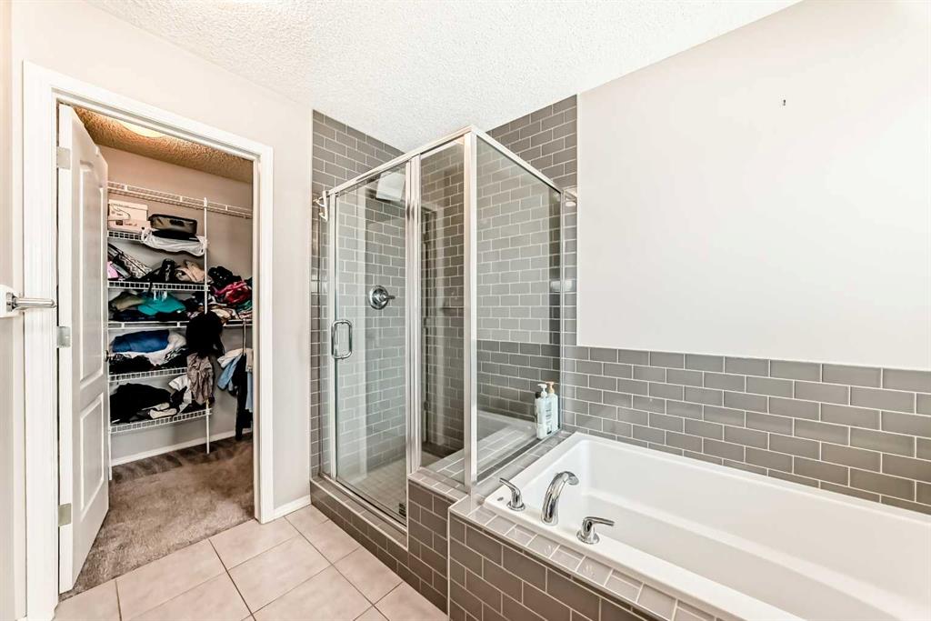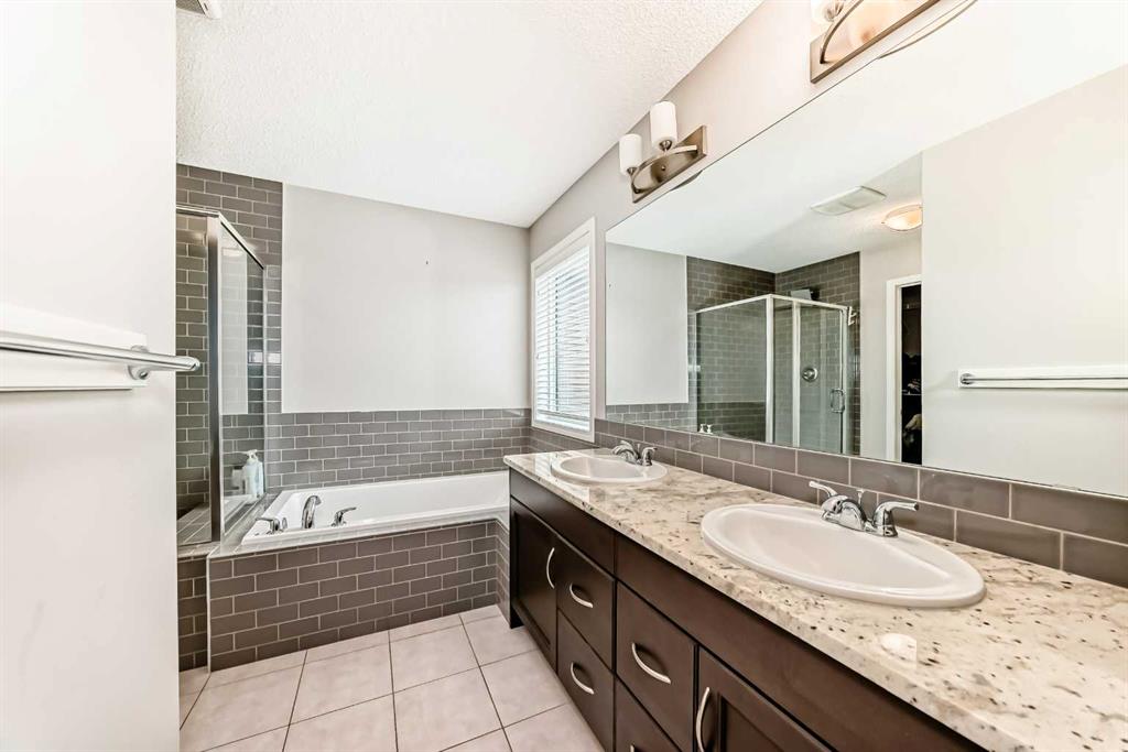 Upstairs, you’ll find four well-appointed bedrooms, full bathrooms, and a conveniently located laundry area. The primary suite is impressively sized, offering large windows that fill the room with natural light, a walk-in closet, and a 5-piece ensuite with double sinks, standing showers, and tiles all over. The additional three bedrooms are all spacious, each with ample closet space These bedrooms share a common 4 piece bathroom with white coloured tiles all over.