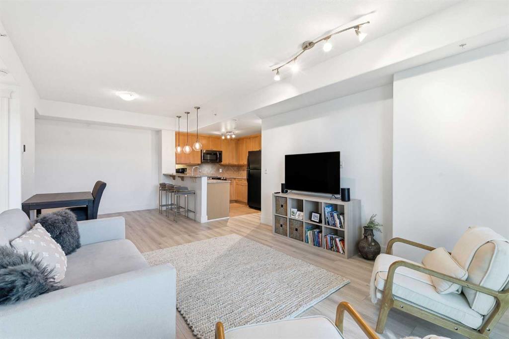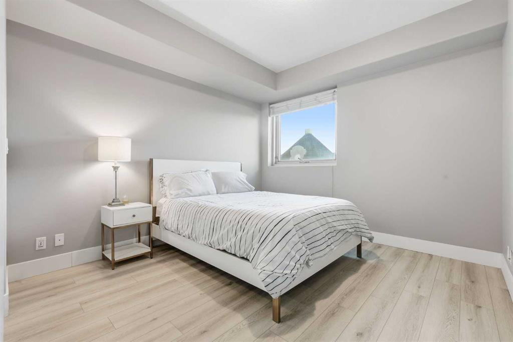 Welcome this bright and spacious 2-bedroom, 2-bathroom condo on the sixth floor of Emerald Stone, offering comfort, convenience, and a prime location. The open-concept layout features 9 ft ceilings, beautiful hardwood flooring, and expansive south-facing windows that flood the space with natural light. The kitchen is both stylish and functional, complete with granite countertops, full-height cabinetry, and a convenient breakfast bar, perfect for casual dining or entertaining. The primary bedroom includes a double walk-through closet and a 4-piece ensuite, while the second bedroom sits adjacent to a 3-piece bath, making it ideal for guests or a home office. Enjoy year-round comfort with central air conditioning and the convenience of in-suite laundry. Step outside onto the sunny balcony, the perfect spot for afternoon drinks or evening BBQs. This unit also includes a titled underground parking stall with an assigned storage locker located directly in front of it. Residents of Emerald Stone enjoy access to additional amenities, including a fully equipped fitness center, recreation and party rooms, visitor parking, indoor bicycle storage, and a weekday concierge service. Located just steps from vibrant 17th Avenue, you’ll be surrounded by trendy shops, restaurants, and nightlife, with the downtown core and several inner-city parks only a short walk away. If you’re looking for modern city living in a fantastic location, this condo is the perfect fit. Don’t miss your chance to make Emerald Stone your home! Book your showing today!