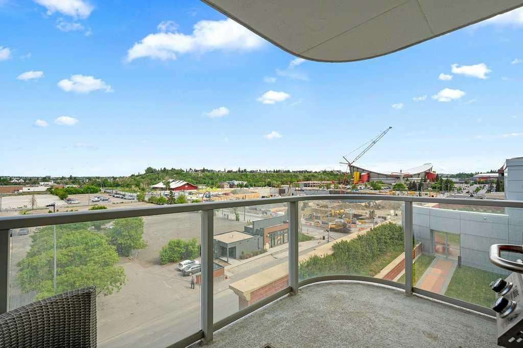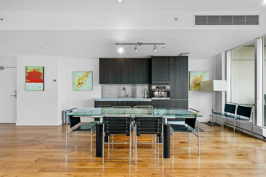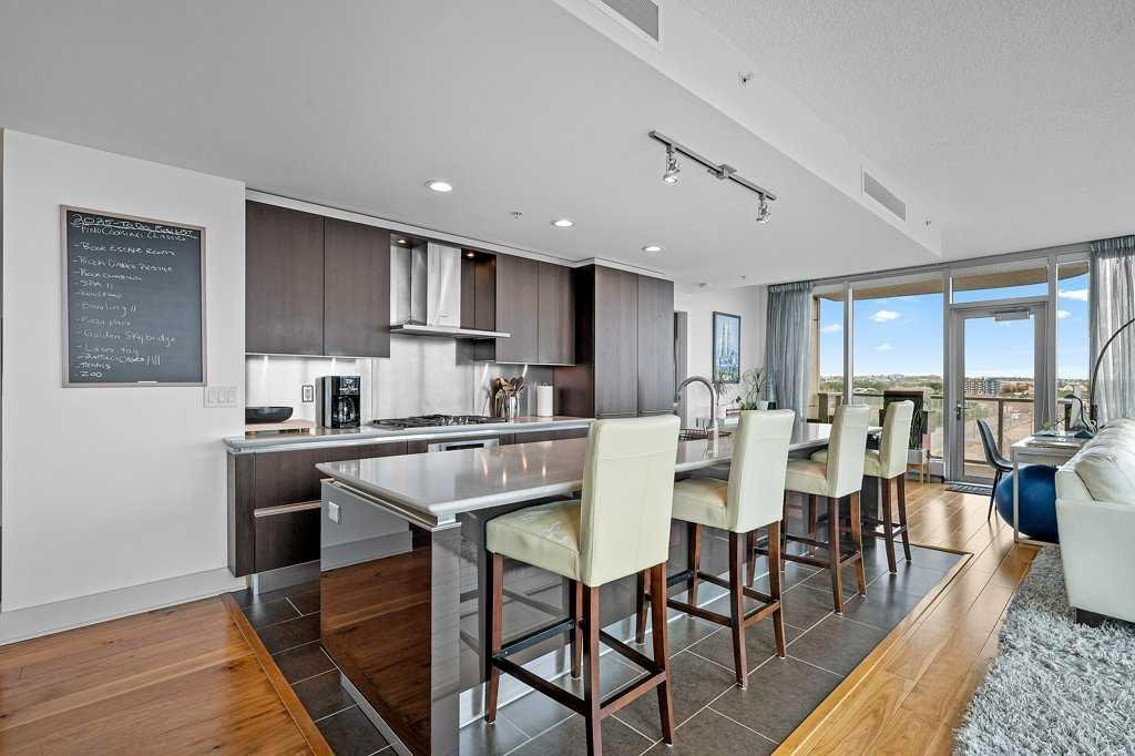 A generous dining area sits in front of a picture window for added ambiance, while the spacious living room opens to a glass-railed balcony—ideal for BBQs, warm evenings, or watching the Stampede fireworks.