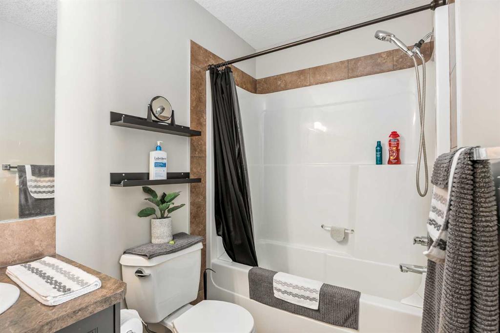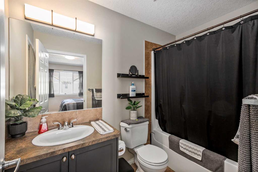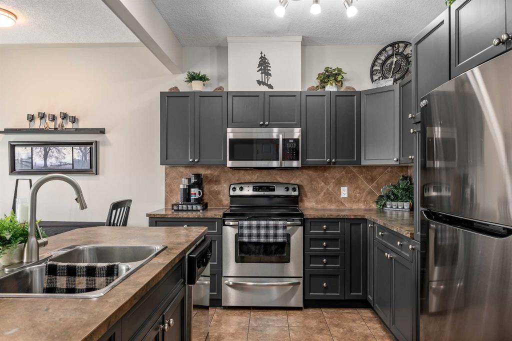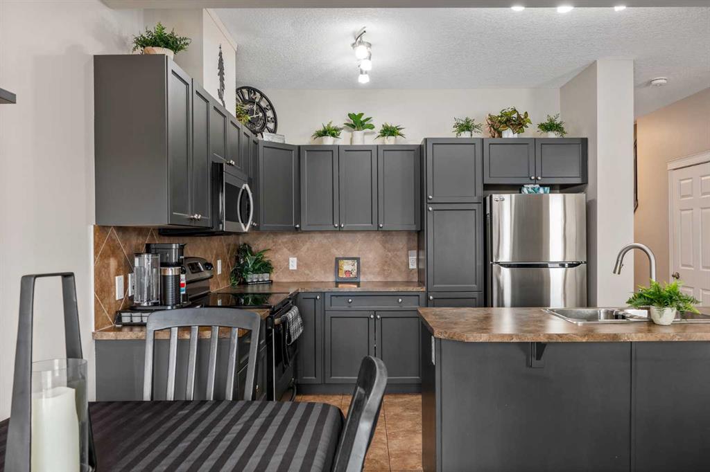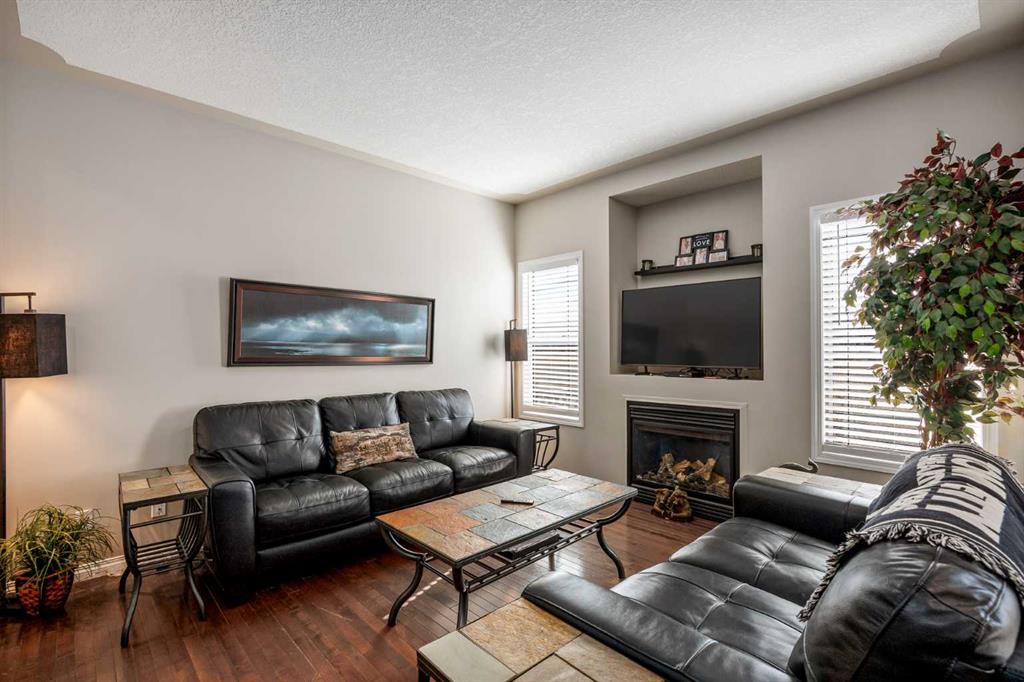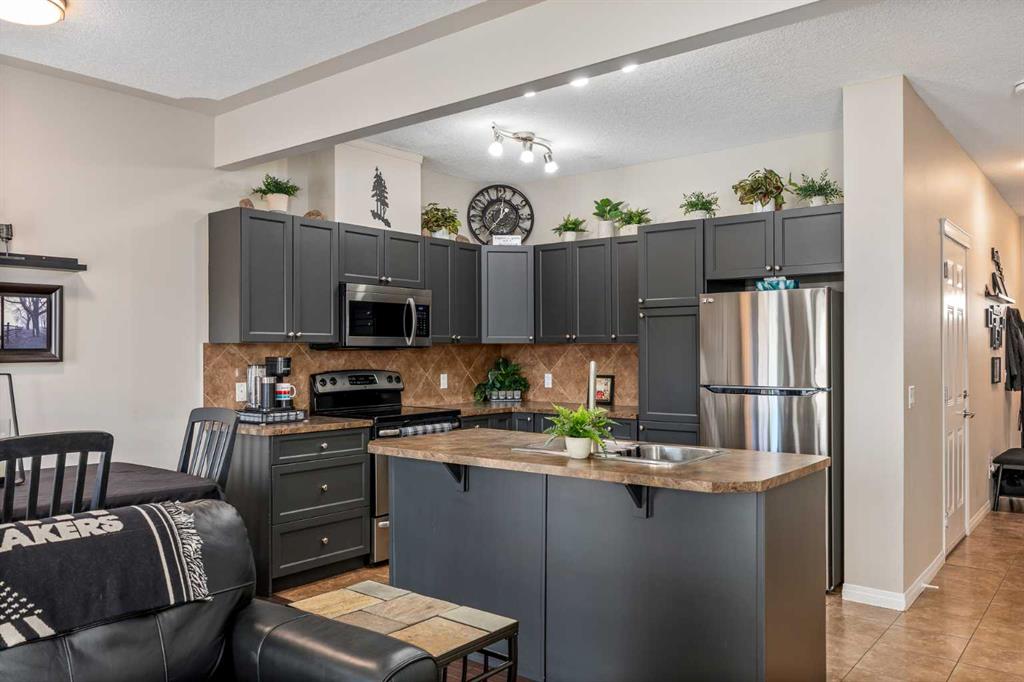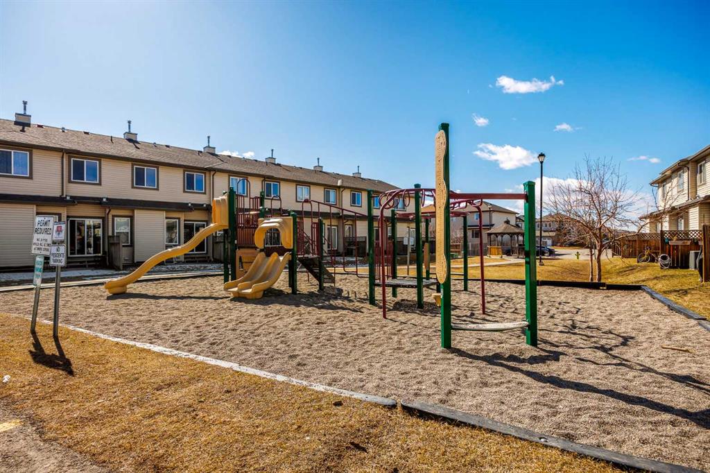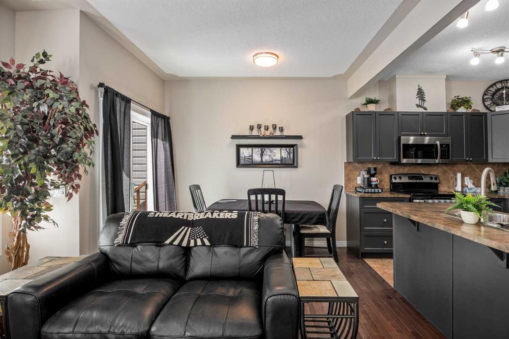 Consider that this attractive 1,273 sq. ft. two-storey townhouse in the lovely community of Luxstone SW in Airdrie could be your next home. There is room here for a growing family with 3 bedrooms, 2.5 baths and an undeveloped basement awaiting your ideas. A concrete drive plus a single attached garage ensures parking room and saves your vehicle from the elements. A welcoming front porch leads into the ceramic tiled foyer and beyond. The high-ceilinged open kitchen, living room and dining area is flooded with cheery natural light. Warm hardwood flooring connects the living and dining area, and a gas fireplace adds to the relaxation factor. Slate gray cabinetry in the kitchen is complimented by sleek stainless appliances, laminate countertops, matching tiled backsplash and a multi-purpose breakfast bar/island with double sink. A 2-pc. bath completes this level. Access to the rear screened patio is provided adjacent to the dining area. A well-planned second level has a private, very roomy and nicely windowed primary bedroom. A walk-in closet and 4-pc. ensuite with soaker tub make this your quiet little getaway. The two additional bedrooms down the hall are equally well lit by natural light, both with substantial closet space and share a second 4-pc. bath. Laundry facilities are located in the basement. The south-facing backyard is fenced for privacy, and the patio allows for comfortable summer entertaining. The yard is neatly landscaped with trees and underground sprinklers and faces a no neighbour zone! Professional management takes care of common area maintenance such as grounds care and snow removal. Another advantage of this home is easy access to everything. Close to QE2, Yankee Valley Boulevard and all the major shopping and restaurants where the two routes meet. Walking distance to Nose Creek Regional Park/Playground/Off-Leash area/Pickleball Courts and Museum. Proximity to schools, churches, CrossIron Mills and Calgary International Airport. This home has been well cared for and is awaiting its next owner. Could that be you? Buyers also have the option to purchase any of the furniture in the home, if desired.