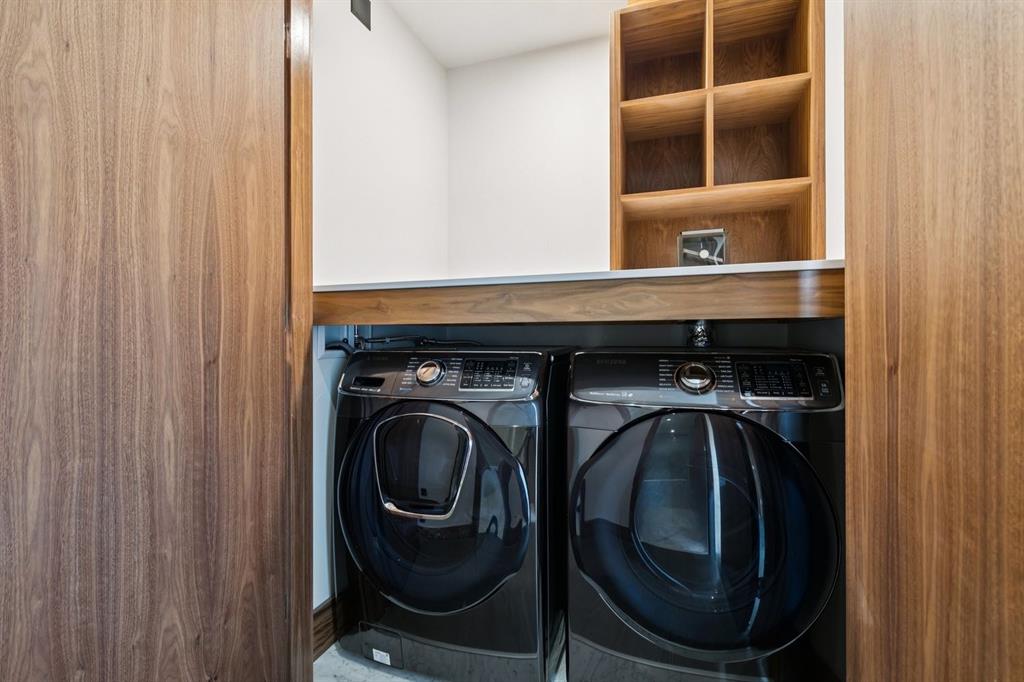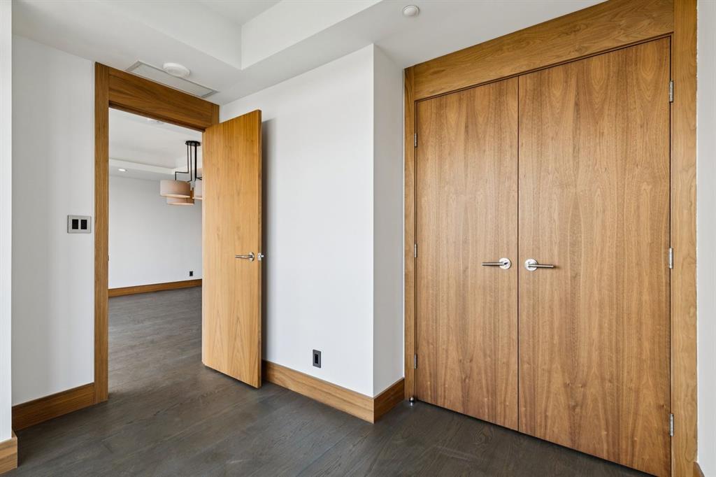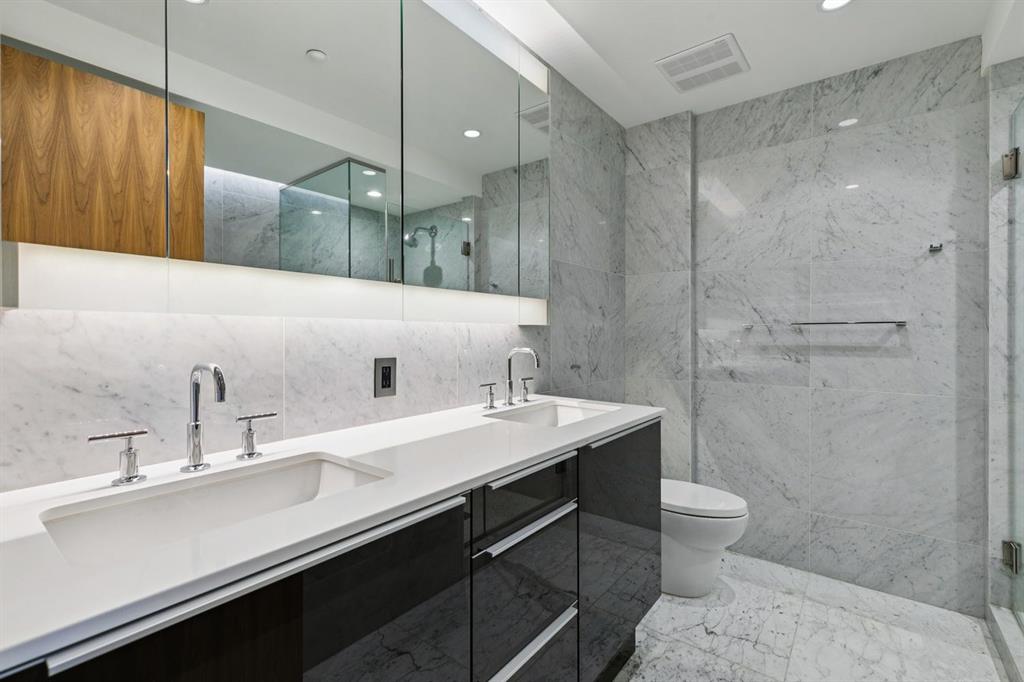 This unit includes a decorative gas fireplace for cozy evenings, a separate laundry area with plenty of shelving and storage, and luxurious touches like electric heated bathroom floors and hardwood flooring in the main areas, complemented by marble tile in the bathrooms. Built-in speakers and a keypad on the front door add convenience and style to your living experience.