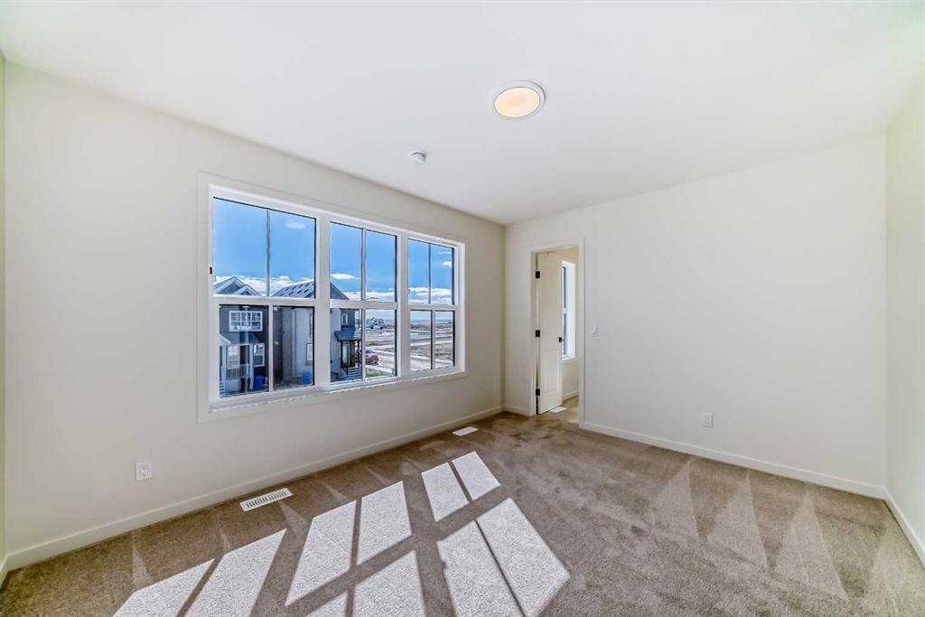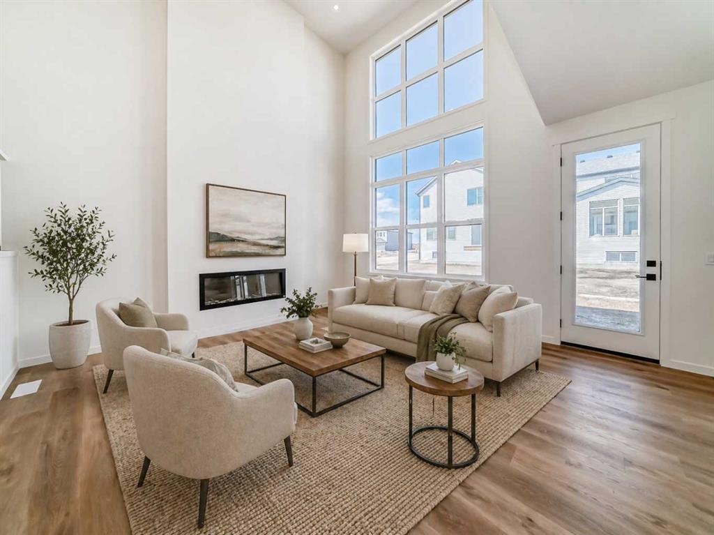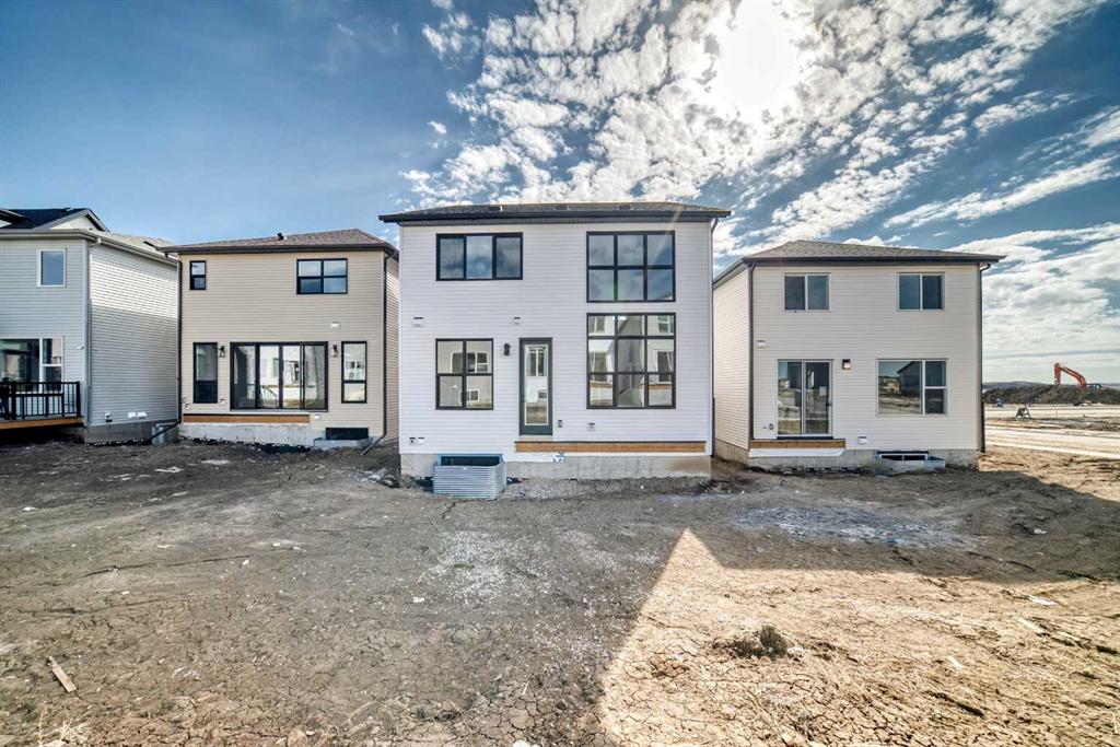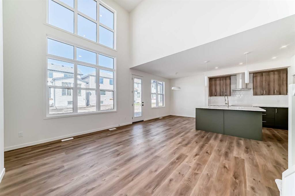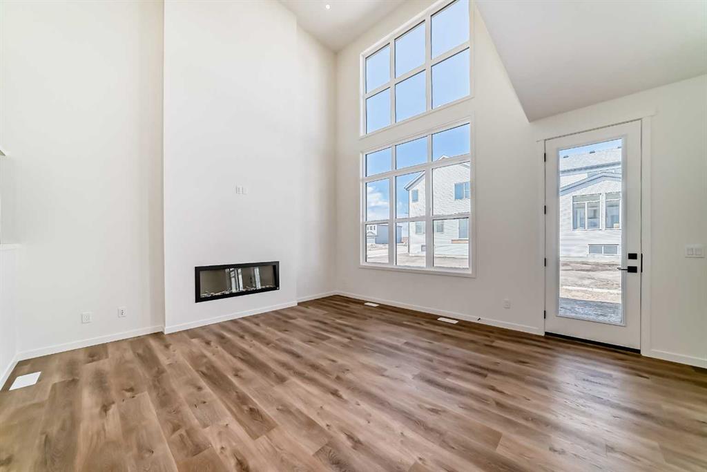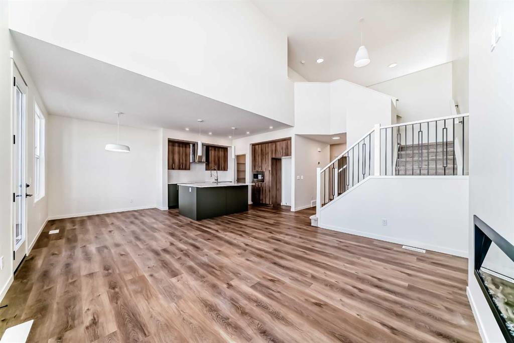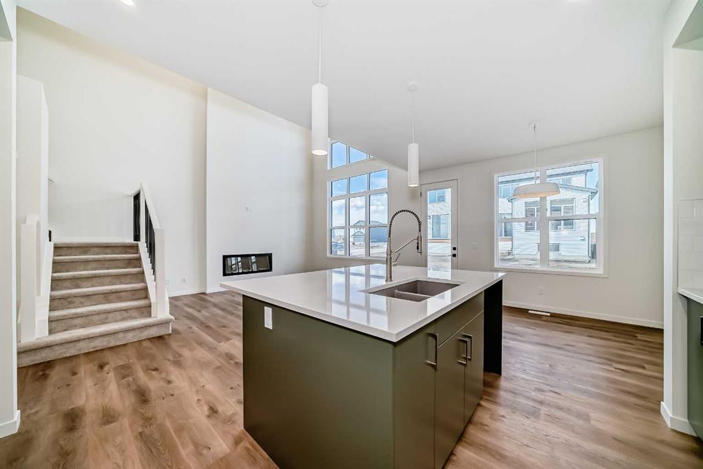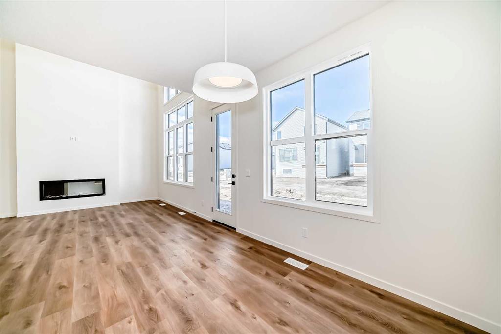 Welcome to The Rossa, a thoughtfully designed quick possession home in Rangeview that blends comfort, versatility, and elevated finishes for today’s modern families. From the moment you step inside, you’re welcomed by durable luxury vinyl plank flooring that carries throughout the main level, offering both style and practicality for everyday living. Near the front of the home, a flex space provides the perfect spot for a home office, study nook, reading area, or creative playroom designed to grow and adapt with your lifestyle. At the heart of the home, the upgraded kitchen makes a beautiful statement with two-tone cabinetry featuring olive lower cabinets and wood grain uppers, creating a warm, modern, and design forward feel. White quartz countertops pair perfectly with the classic white square tile backsplash, while the upgraded kitchen package includes a built in microwave and a stand alone hood fan wrapped in tile for a polished custom look. With thoughtful storage, stylish finishes, and a functional layout, this kitchen is equally ready for quiet weeknights, weekend hosting, and everything in between. Just off the kitchen, the spacious dining area is filled with natural light from large rear facing windows, creating the perfect backdrop for casual breakfasts, family dinners, or holiday gatherings. Adjacent to the dining space, the open to above living room delivers a true wow factor with soaring height, dramatic windows, and a beautiful electric fireplace that anchors the room with warmth and style. Upstairs, a modern railing leads to a versatile entertainment room, ideal for movie nights, gaming, a kids’ retreat, or a quiet secondary lounge. The private primary suite feels like a true escape, complete with a generous walk-in closet and a 5 piece ensuite featuring dual sinks, a deep soaker tub, and a separate shower. Two additional well sized bedrooms share a 4 piece bathroom, while the upper level laundry room adds everyday convenience right where you need it most. Downstairs, the 9’ foundation basement with a separate side entrance is full of future potential. Whether you’re dreaming of additional living space, a home gym, or a future legal suite (A secondary suite would be subject to approval and permitting by the city/municipality), this level offers excellent flexibility for the years ahead. Outside, the west-facing backyard is ready for Calgary’s long summer evenings, perfect for BBQs, outdoor dining, garden lounging, or simply relaxing in the evening sun. Located in Calgary’s desirable southeast, Rangeview is more than just a neighbourhood, it’s a community built around connection, sustainability, and a shared love of food and nature. Inspired by Alberta’s rich agricultural heritage, Rangeview is Calgary’s first garden-to-table community, designed with future gardens, orchards, gathering spaces, pathways, and community-focused amenities that encourage neighbours to connect, grow, and enjoy a lifestyle rooted in wellness and belonging.