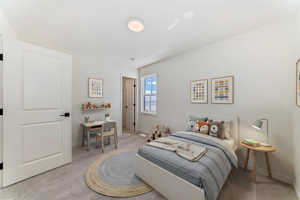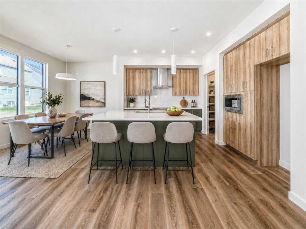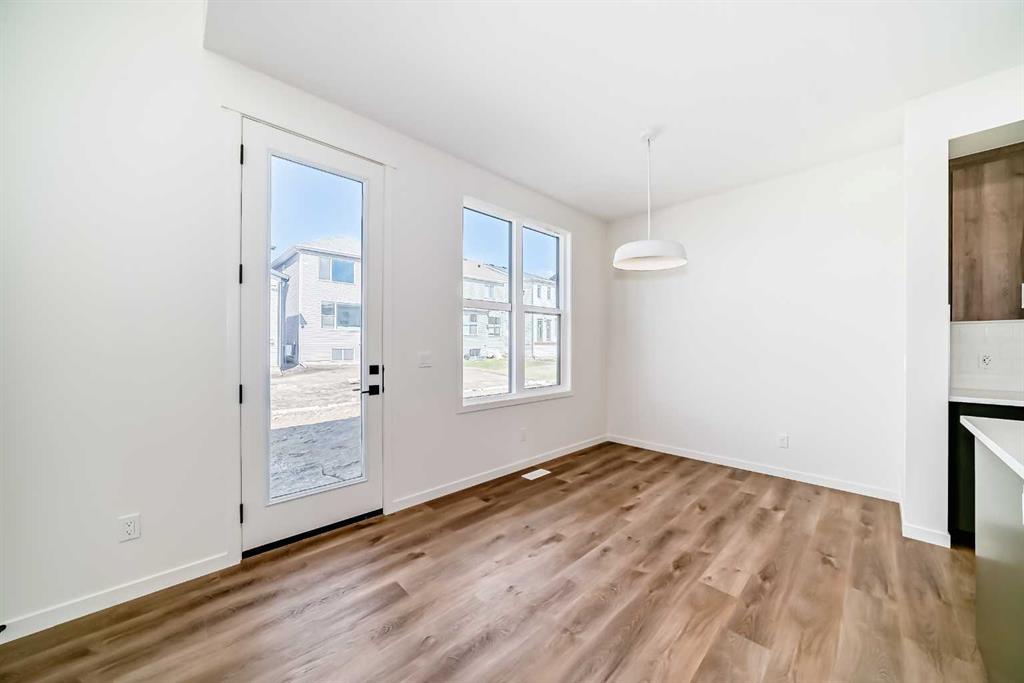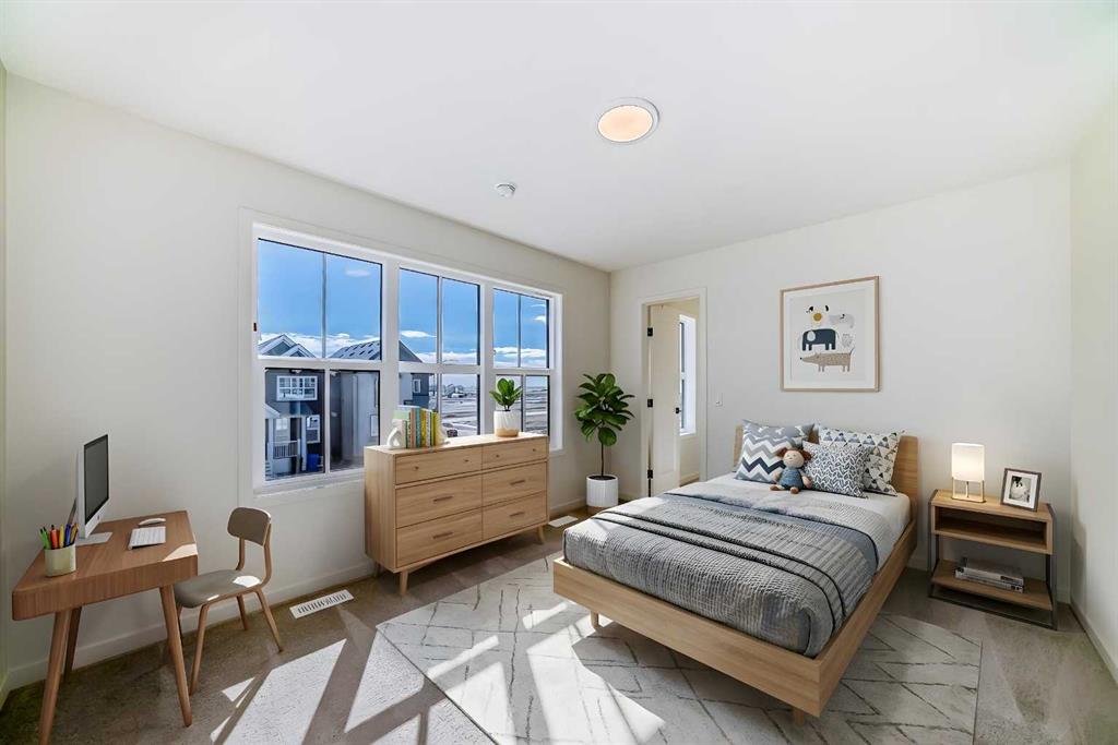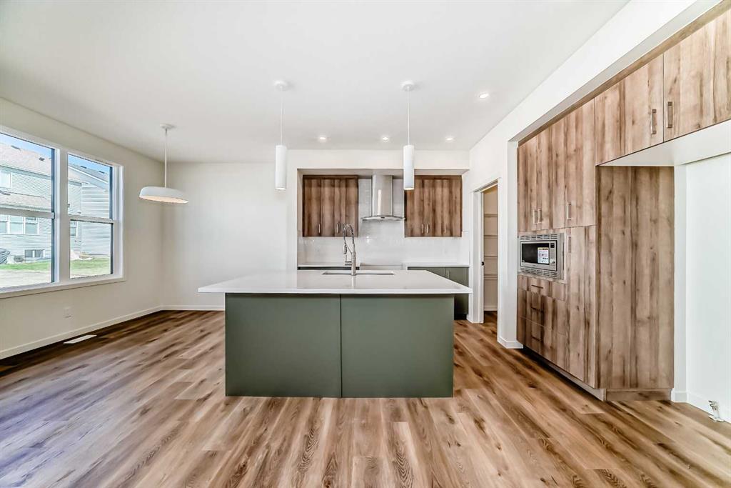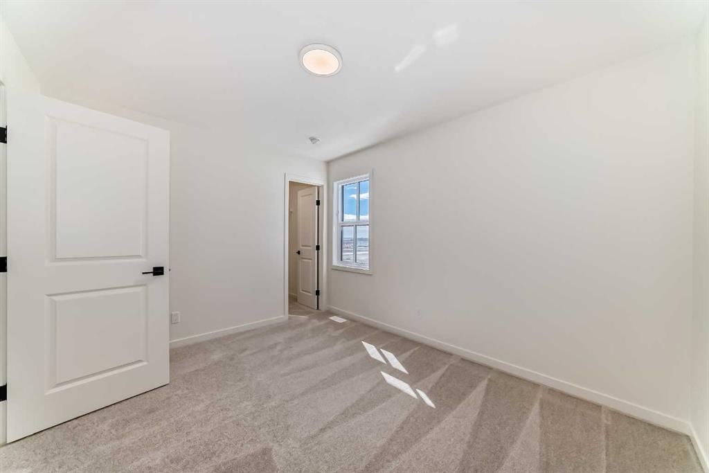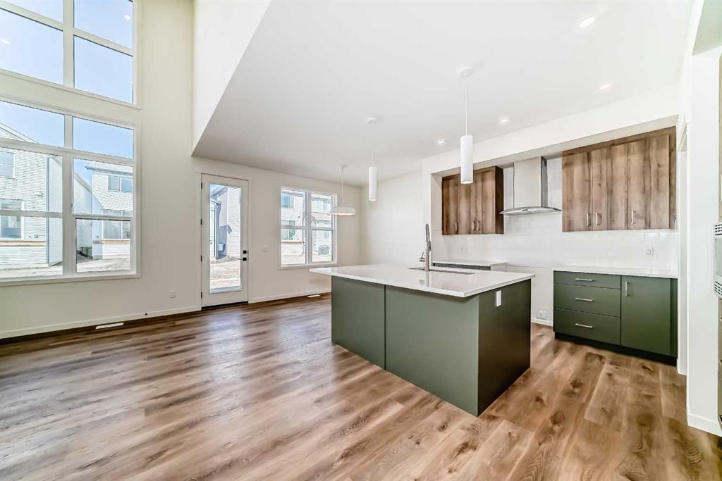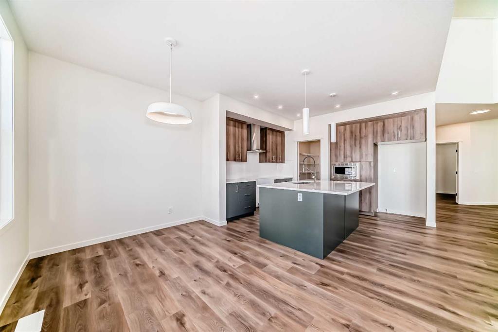 Welcome to The Rossa, a thoughtfully designed quick possession home in Rangeview that blends comfort, versatility, and elevated finishes for today’s modern families. From the moment you step inside, you’re welcomed by durable luxury vinyl plank flooring that carries throughout the main level, offering both style and practicality for everyday living. Near the front of the home, a flex space provides the perfect spot for a home office, study nook, reading area, or creative playroom designed to grow and adapt with your lifestyle. At the heart of the home, the upgraded kitchen makes a beautiful statement with two-tone cabinetry featuring olive lower cabinets and wood grain uppers, creating a warm, modern, and design forward feel. White quartz countertops pair perfectly with the classic white square tile backsplash, while the upgraded kitchen package includes a built in microwave and a stand alone hood fan wrapped in tile for a polished custom look. With thoughtful storage, stylish finishes, and a functional layout, this kitchen is equally ready for quiet weeknights, weekend hosting, and everything in between. Just off the kitchen, the spacious dining area is filled with natural light from large rear facing windows, creating the perfect backdrop for casual breakfasts, family dinners, or holiday gatherings. Adjacent to the dining space, the open to above living room delivers a true wow factor with soaring height, dramatic windows, and a beautiful electric fireplace that anchors the room with warmth and style. Upstairs, a modern railing leads to a versatile entertainment room, ideal for movie nights, gaming, a kids’ retreat, or a quiet secondary lounge. The private primary suite feels like a true escape, complete with a generous walk-in closet and a 5 piece ensuite featuring dual sinks, a deep soaker tub, and a separate shower. Two additional well sized bedrooms share a 4 piece bathroom, while the upper level laundry room adds everyday convenience right where you need it most. Downstairs, the 9’ foundation basement with a separate side entrance is full of future potential. Whether you’re dreaming of additional living space, a home gym, or a future legal suite (A secondary suite would be subject to approval and permitting by the city/municipality), this level offers excellent flexibility for the years ahead. Outside, the west-facing backyard is ready for Calgary’s long summer evenings, perfect for BBQs, outdoor dining, garden lounging, or simply relaxing in the evening sun. Located in Calgary’s desirable southeast, Rangeview is more than just a neighbourhood, it’s a community built around connection, sustainability, and a shared love of food and nature. Inspired by Alberta’s rich agricultural heritage, Rangeview is Calgary’s first garden-to-table community, designed with future gardens, orchards, gathering spaces, pathways, and community-focused amenities that encourage neighbours to connect, grow, and enjoy a lifestyle rooted in wellness and belonging.