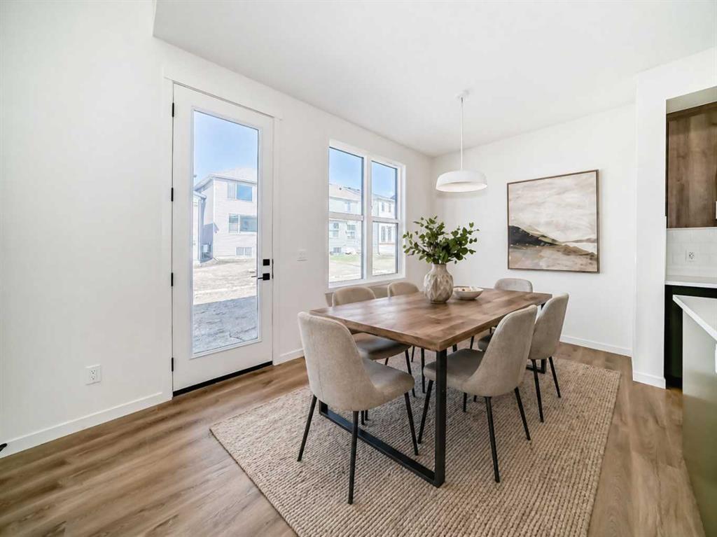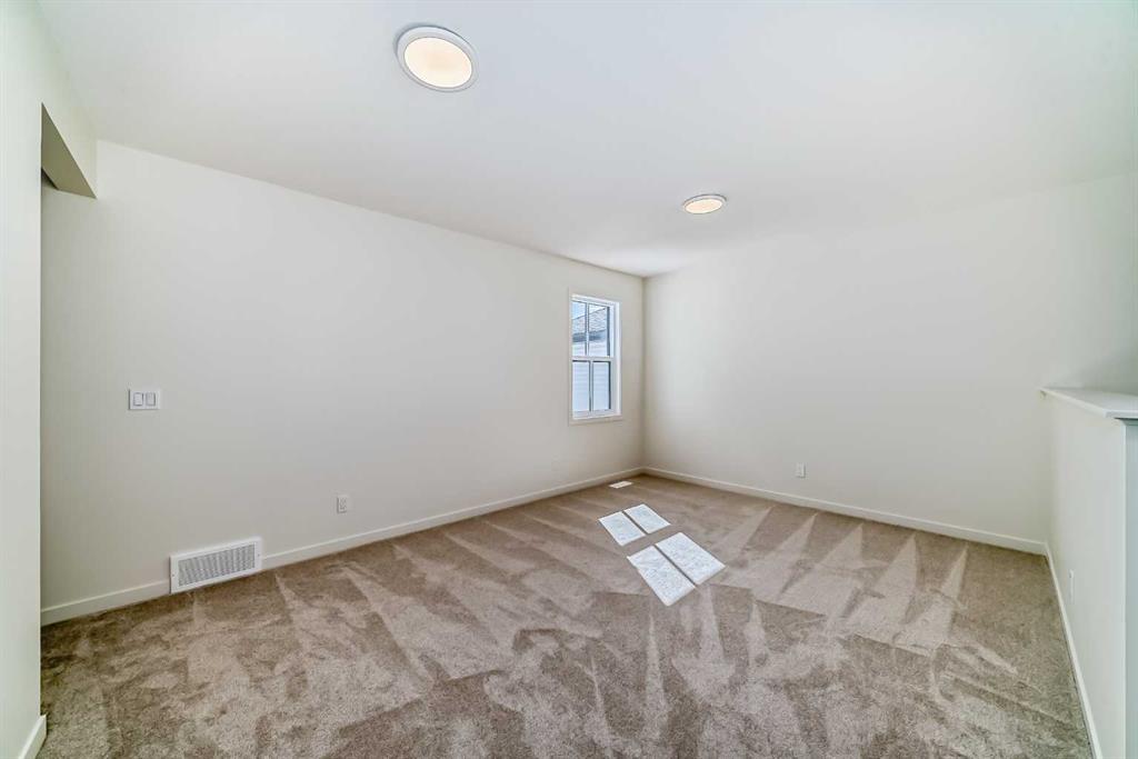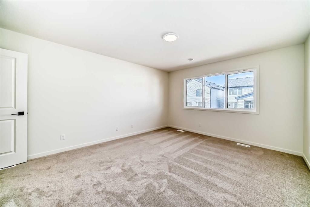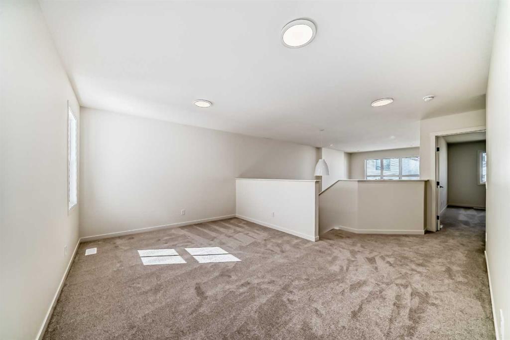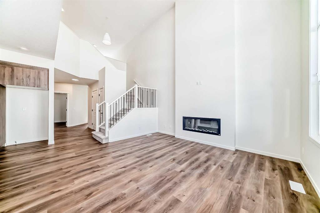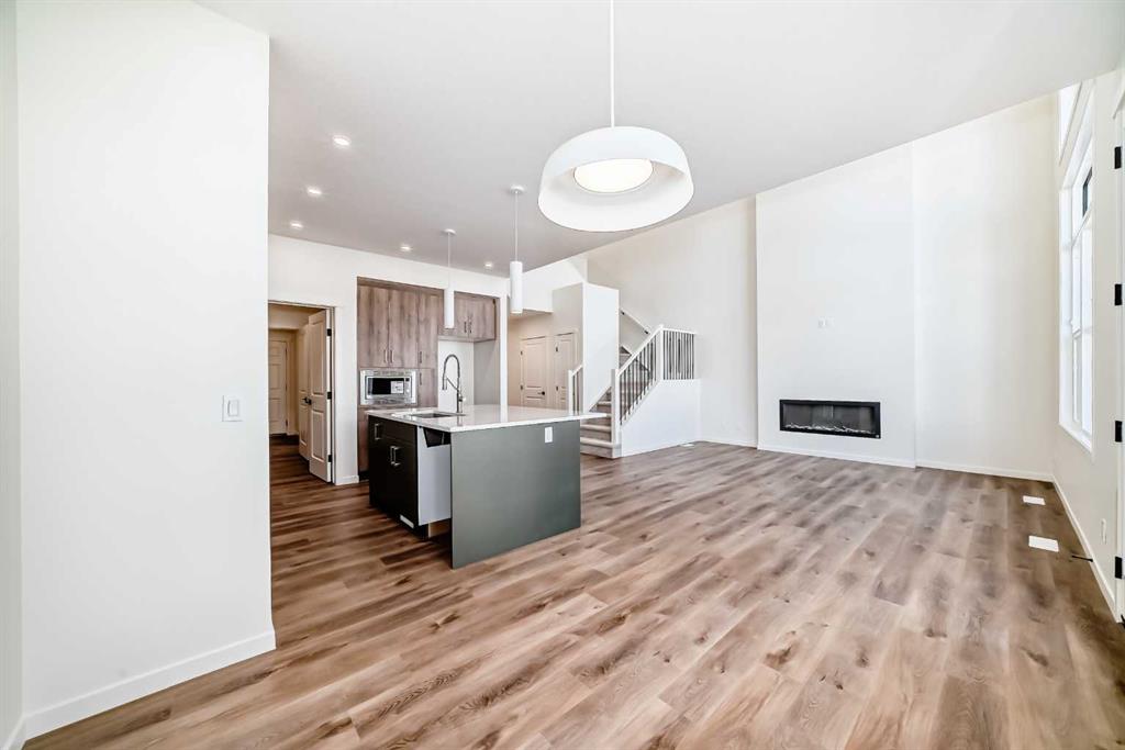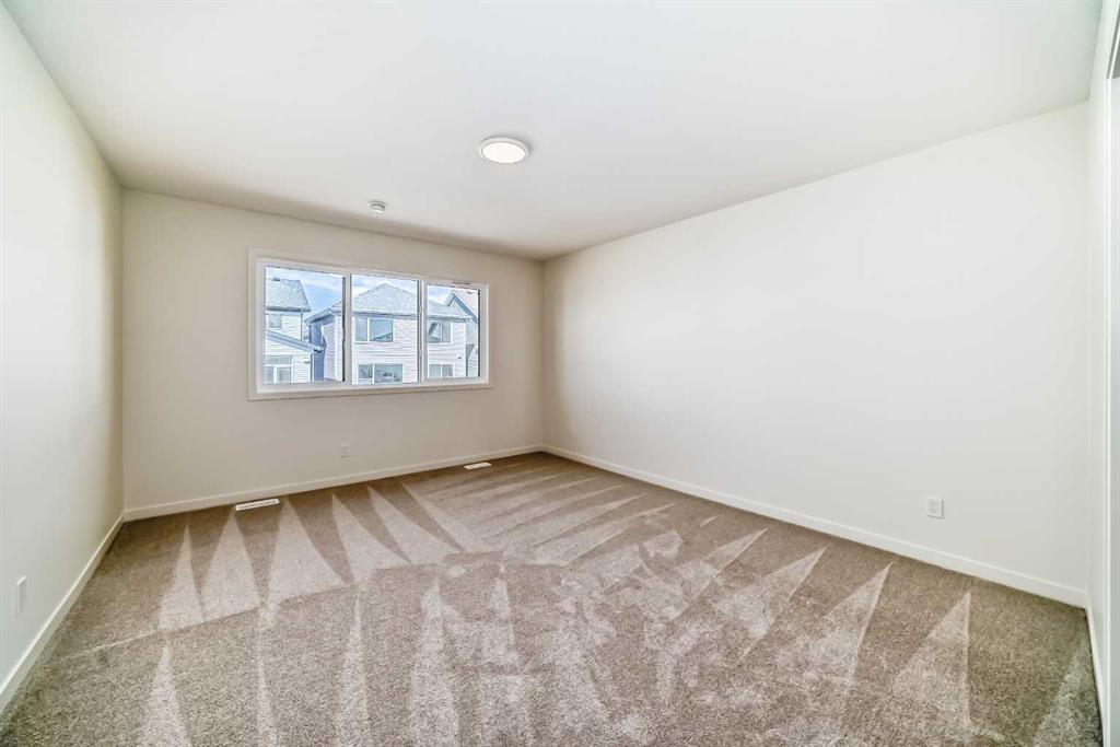 Welcome to The Rossa, a thoughtfully designed quick possession home in Rangeview that blends comfort, versatility, and elevated finishes for today’s modern families. From the moment you step inside, you’re welcomed by durable luxury vinyl plank flooring that carries throughout the main level, offering both style and practicality for everyday living. Near the front of the home, a flex space provides the perfect spot for a home office, study nook, reading area, or creative playroom designed to grow and adapt with your lifestyle. At the heart of the home, the upgraded kitchen makes a beautiful statement with two-tone cabinetry featuring olive lower cabinets and wood grain uppers, creating a warm, modern, and design forward feel. White quartz countertops pair perfectly with the classic white square tile backsplash, while the upgraded kitchen package includes a built in microwave and a stand alone hood fan wrapped in tile for a polished custom look. With thoughtful storage, stylish finishes, and a functional layout, this kitchen is equally ready for quiet weeknights, weekend hosting, and everything in between. Just off the kitchen, the spacious dining area is filled with natural light from large rear facing windows, creating the perfect backdrop for casual breakfasts, family dinners, or holiday gatherings. Adjacent to the dining space, the open to above living room delivers a true wow factor with soaring height, dramatic windows, and a beautiful electric fireplace that anchors the room with warmth and style. Upstairs, a modern railing leads to a versatile entertainment room, ideal for movie nights, gaming, a kids’ retreat, or a quiet secondary lounge. The private primary suite feels like a true escape, complete with a generous walk-in closet and a 5 piece ensuite featuring dual sinks, a deep soaker tub, and a separate shower. Two additional well sized bedrooms share a 4 piece bathroom, while the upper level laundry room adds everyday convenience right where you need it most. Downstairs, the 9’ foundation basement with a separate side entrance is full of future potential. Whether you’re dreaming of additional living space, a home gym, or a future legal suite (A secondary suite would be subject to approval and permitting by the city/municipality), this level offers excellent flexibility for the years ahead. Outside, the west-facing backyard is ready for Calgary’s long summer evenings, perfect for BBQs, outdoor dining, garden lounging, or simply relaxing in the evening sun. Located in Calgary’s desirable southeast, Rangeview is more than just a neighbourhood, it’s a community built around connection, sustainability, and a shared love of food and nature. Inspired by Alberta’s rich agricultural heritage, Rangeview is Calgary’s first garden-to-table community, designed with future gardens, orchards, gathering spaces, pathways, and community-focused amenities that encourage neighbours to connect, grow, and enjoy a lifestyle rooted in wellness and belonging.