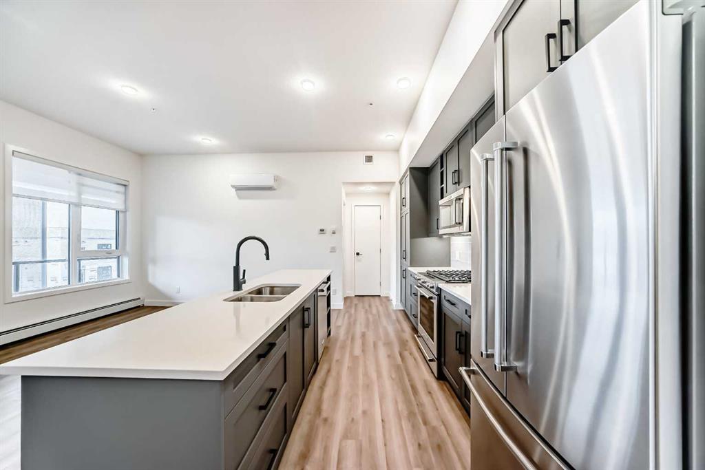 Welcome to a TOP floor condo unit in the August building in the heart of University District. This unit is walking distance to all the great restaurants, coffee shops and the Save on Foods grocery store. (who needs a car!). Unit was marketed as a 3 bedroom plan by the builder (Avi Urban) but currently is a 1 bedroom + den (walk in closet) + 2nd living room (which can be converted back to a bedroom). The balcony is approx 263 sq feet (36 ft long x 6.8ft wide), comes w/ storage units on both ends, & has protective bird screens (upgrade). The balcony is huge and allows for plenty of furniture to be configured on it. Upon entry into the unit, a spacious laundry room with ample storage awaits. The 2nd 4 piece bathroom (tub/shower) w/ quartz countertops and tile flooring. The entire unit except the bathrooms has light brown vinyl plank flooring. The unit feels quite large with 10ft + ceilings & huge floor to ceiling windows which adds a plethora of natural light. The kitchen is large with upgraded SS appliances, quartz counter tops, & blue cabinets (additional added for more storage). The front living room can be converted back to a 2nd bedroom if buyer wishes. The primary bedroom is large with its own access to the patio. The ensuite has dual sinks, quartz counter tops, matching cabinets to the kitchen and a huge walk in shower w/ wand for washing (upgrade). The walk in closet is close to 50 sq ft (7.25 x 7.5) allowing for tons of clothes, shoes, & accessories. The den allows for a twin size bed or murphy bed arrangement and has its own walk in closet. The future buyer has plenty of options to personalize it to their liking. The unit has its own AC unit (upgrade) + upgraded Hunter Douglas blinds throughout + Telus fibre optic. The unit comes with 2 titled parking spots (265/266) + separate storage unit (P2). The main floor has a party room that can be booked for gatherings or used as a quit study area. The 2nd floor has an outdoor patio for residents. Don’t miss this awesome opportunity enter condo ownership as a 1st time buyer or downsize from a neighboring NW community and enjoy the numerous amenities that residence have come to enjoy!
