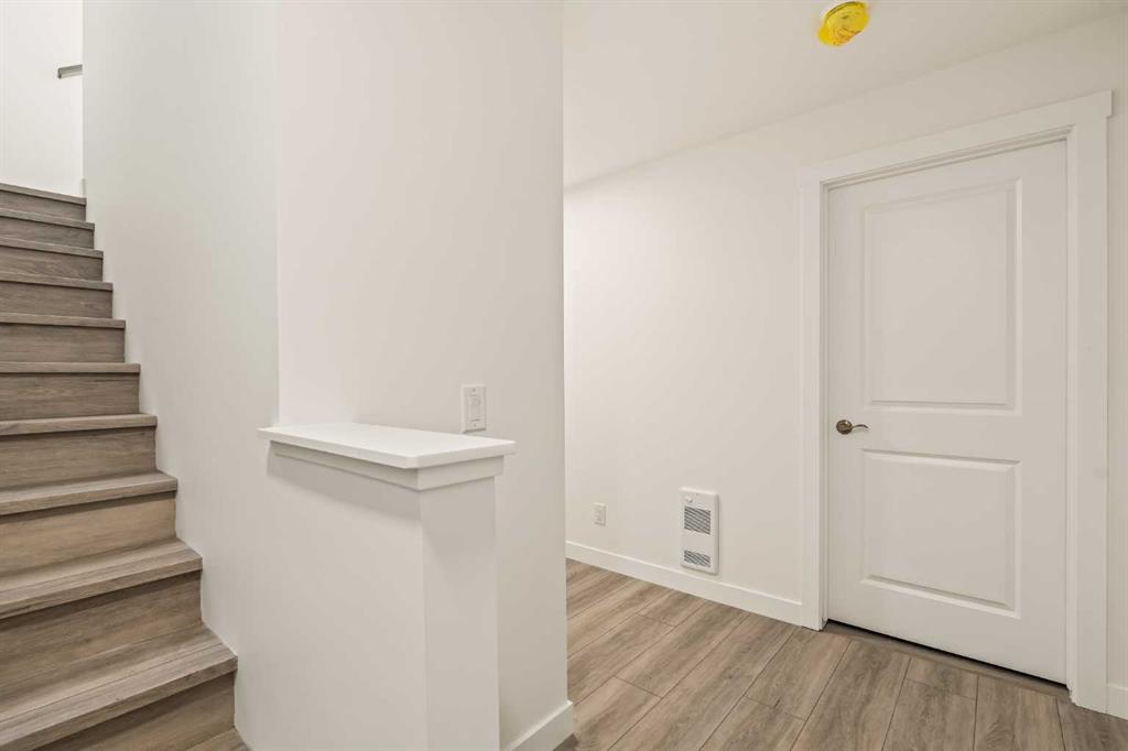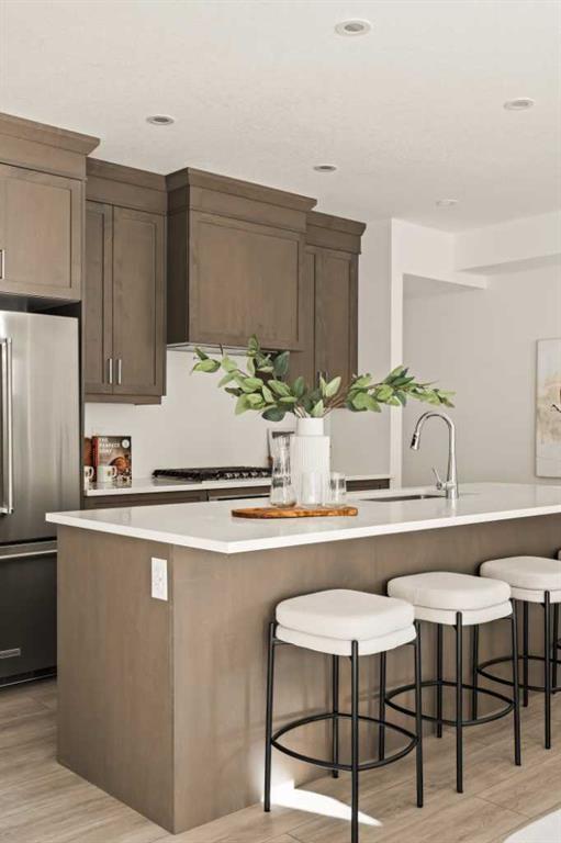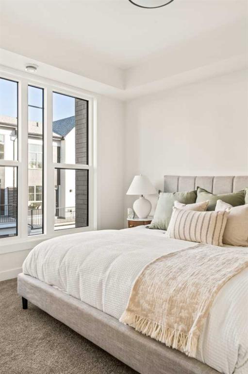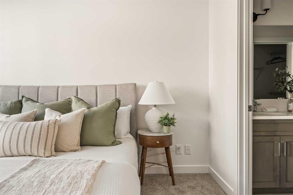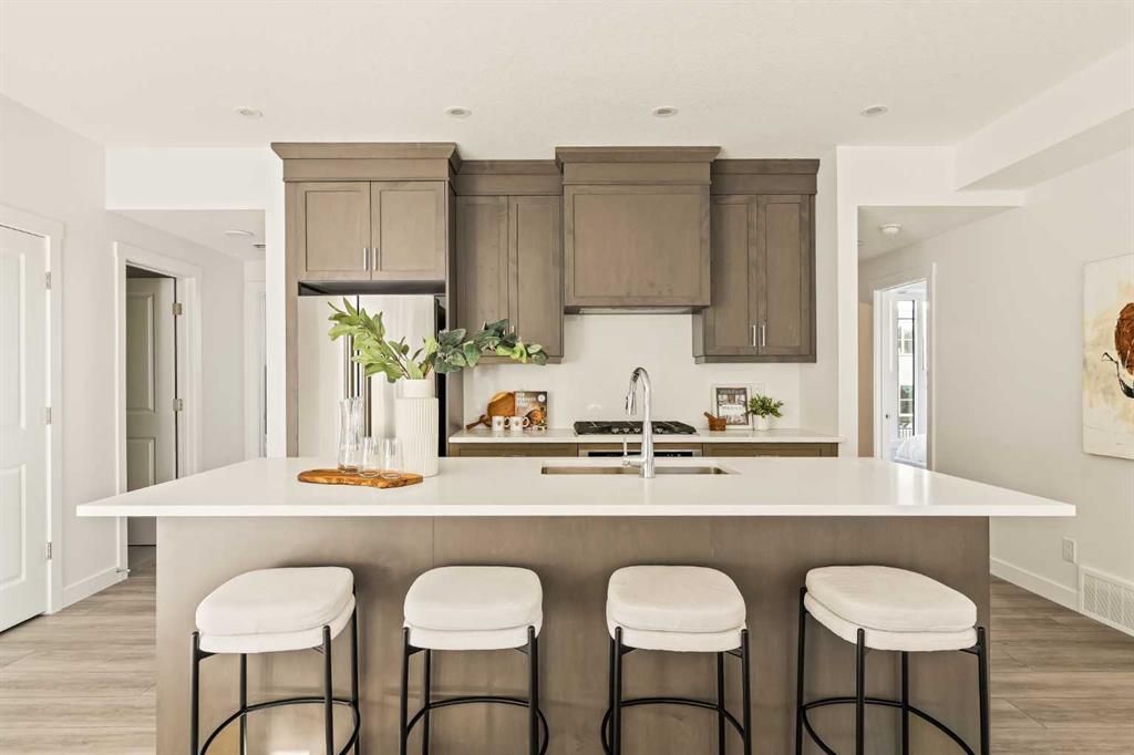 Welcome to the Regent at Crown Park, a beautifully crafted bungalow-style townhome offering true single-level living without compromise! This unique design combines the benefits of a bungalow lifestyle without compromising on storage or garage space, all while moving into a brand new beautiful home with full warranty! Thoughtfully designed with down-sizers in mind, this maintenance-free residence is perfect for those who travel or simply prefer a lock-and-leave lifestyle free from exterior upkeep, landscaping, or snow removal. This brand-new 3-bedroom, 2-bathroom home offers nearly 1,300 sq.ft. of well-planned living space on one level, plus a lower level featuring extensive storage and access to the oversized double garage. At the heart of the home, a stunning open-concept living area was created for effortless entertaining. The central kitchen seamlessly connects the living and dining spaces while a full wall of south-west facing windows floods the interior with natural light all year long. Timeless finishes include warm-tone natural wood shaker maple cabinetry, light quartz countertops, and a premium built-in appliance package featuring a gas cooktop, built-in oven, and chimney hood fan – ensuring the chef is always part of the conversation. A striking floor-to-ceiling tile fireplace anchors the great room, offering a warm focal point and comfortable seating for gatherings. The spacious dining area easily accommodates a full table and buffet, providing exceptional furnishing flexibility. Privately positioned at the rear of the home, the primary retreat features a generous walk-in closet and spa-inspired ensuite with dual vanities and a tiled walk-in shower with 10mm glass. A centrally located laundry room with upper cabinetry and folding counter enhances everyday convenience while naturally separating the primary suite from the secondary bedrooms. Two additional bedrooms and a full bathroom provide versatility for guests, a home office, media room, or creative space – while maintaining excellent resale appeal. The lower level offers a large storage room and an oversized utility room (approx. 17′ x 7′) ideal for hobbies or seasonal storage. A double closet and oversized double attached garage completes the interior features on the lower level. Step outside to your private covered southwest-facing patio spanning over 26 feet that overlooks the park and includes a gas line, hose bib, and A/C rough-in – the perfect setting for relaxed outdoor living and future upgrades in mind. Bungalow-style townhomes with double attached garages are exceptionally rare. Enjoy added peace of mind with comprehensive builder warranty coverage plus Alberta New Home Warranty. Located minutes from downtown and surrounded by established amenities, Crown Park offers the confidence of a mature community paired with the comfort of a brand-new home. This is one of the very last brand new opportunities remaining – a truly rare opportunity you won’t want to miss!