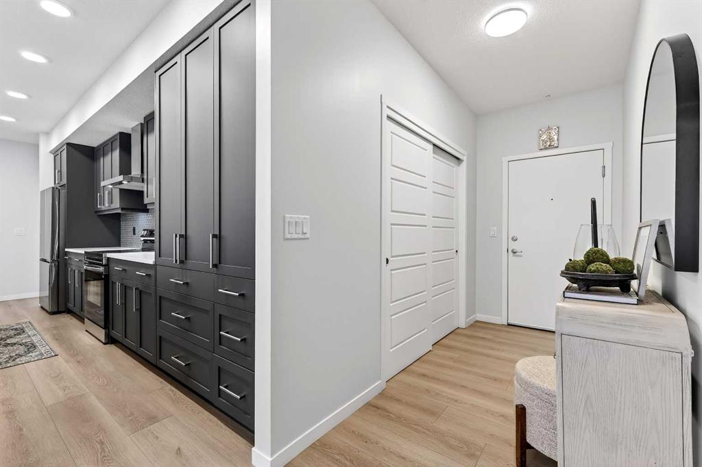 An EXCEPTIONAL OPPORTUNITY to own a LIKE-NEW, HIGH END, LUXURY condo for less than the cost of comparable new construction. Welcome to Seton Serenity by award-winning Cedarglen Living, where this beautifully upgraded 2 bedroom, 2 bathroom residence offers over $23,000 in thoughtful upgrades and a refined, move-in-ready lifestyle. The open-concept layout features 9′ ceilings, luxury vinyl plank flooring in the main living space, triple-glazed Low-E windows, sound-reducing membrane between floors, and a striking electric fireplace anchoring the living space. The kitchen is a true highlight with an island extension, built-in pantry, upgraded appliances, quartz countertops, upgraded sink, full-height tile backsplash, soft-close cabinetry, cabinet valance lighting, and sleek roller blinds throughout. The spacious primary bedroom includes a walk-in closet and a luxurious ensuite with raised vanities, upgraded toilets, full-height tile, and an elegant LED mirror, while the well-positioned second bedroom offers added privacy near the second full bathroom. Additional features include stacked washer and dryer adding more in-suite storage, stylish barn door detail, extra fob, clear glass balcony railing, BBQ gas line, energy recovery ventilator (ERV), and titled secured underground parking. A rare and valuable bonus: approved short-term rental businesses are permitted under current bylaws, making this an excellent opportunity for homeowners and investors seeking a luxury rental near South Health Campus, one of Calgary’s largest employment hubs. Enjoy unbeatable walkability to the world’s largest YMCA, South Health Campus, shops, restaurants, cafĂ©s, and Seton HOA amenities. Pet and rental friendly, this extensively upgraded condo delivers the luxury of new construction without the wait, uncertainty, or added cost.
