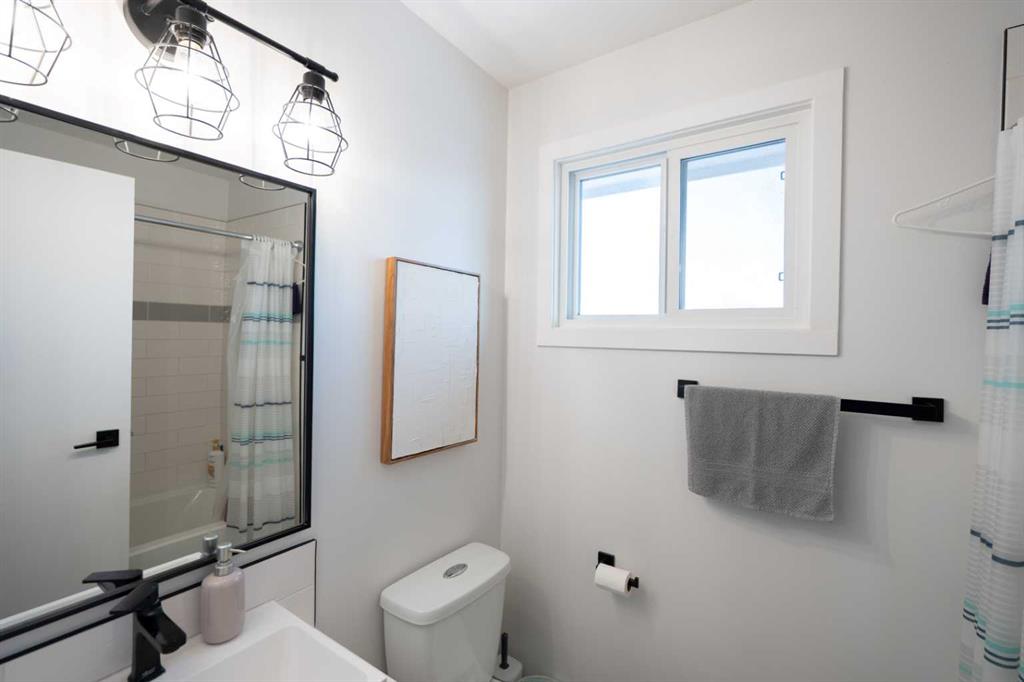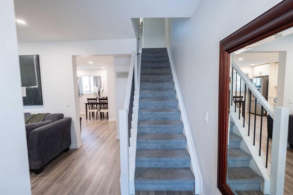 The interior features a modern kitchen with updated cabinetry, stylish tile backsplash, new appliances, and contemporary finishes. The home has been upgraded with new flooring, fresh paint, updated plumbing fixtures, and a renovated bathroom, creating a clean and cohesive look throughout. A custom feature wall adds character and warmth, while the fully finished family room provides additional living space ideal for relaxing or entertaining. The laundry and mechanical room are also fully finished for added convenience.