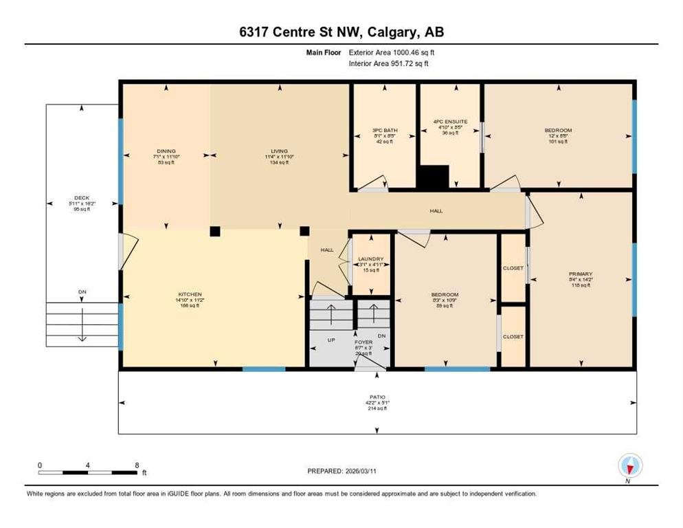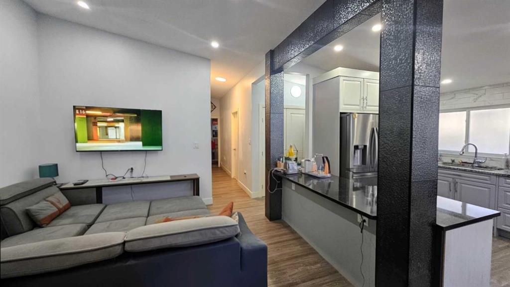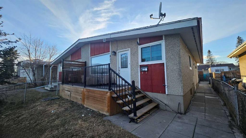 Bungalow-style duplex featuring a fully renovated main floor and a separate lower-level suite with its own entrance. The main level offers 1,000 sq ft with 3 bedrooms, 2 full bathrooms, a bright living area, Bungalow-style duplex featuring a fully renovated main floor and a separate lower-level living space with its own entrance. The main level offers approximately 1,000 sq ft with 3 bedrooms, 2 full bathrooms, a bright living area, and an in-suite laundry room. The renovated kitchen showcases beautiful cabinetry and stone countertops, with a completed dishwasher rough-in for easy installation. The home also includes a front deck with railing and wide steps, adding great curb appeal and a welcoming entry.