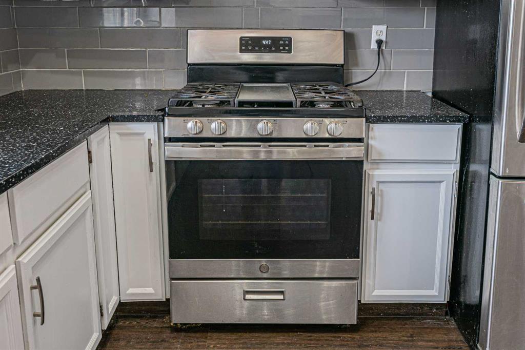 The main floor boasts a bright living room with a southwest-facing bay window, filling the space with natural light. The dining area offers a patio door that leads to a spacious deck and backyard. The kitchen is upgraded with granite countertops, stainless steel appliances, and a gas stove.