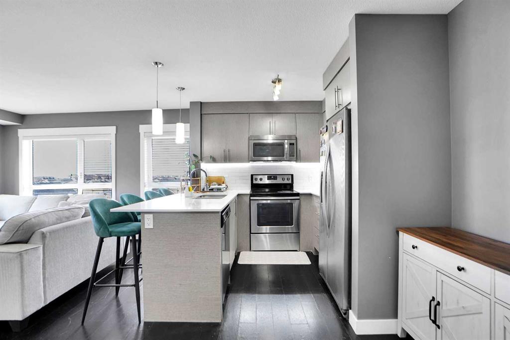 Welcome to this stunning top floor corner unit, offering exceptional privacy, designer finishes, and two titled parking stalls; Flooded with natural light from expansive windows on two sides, this home features an open and airy layout that seamlessly connects the living and dining areas. Step out onto the private balcony to enjoy beautiful views perfect for summer BBQs or unwinding at the end of the day. The chef inspired kitchen is a true showpiece, showcasing ceiling height cabinetry, quartz countertops with an undermount sink, a modern breakfast bar, classic white subway tile backsplash, stainless steel appliances. Designed with today’s lifestyle in mind, the floor plan includes a spacious primary suite with a walk through mirrored closet and a private ensuite. A second bedroom with its own full bathroom offers ideal separation for guests or roommates. A built-in desk creates the perfect work from home nook, and the convenience of in suite laundry enhances everyday living. Located within walking distance to schools, parks, shopping, and essential amenities, this home delivers outstanding value in a highly desirable location. Book your private showing with your favorite Realtor today!
